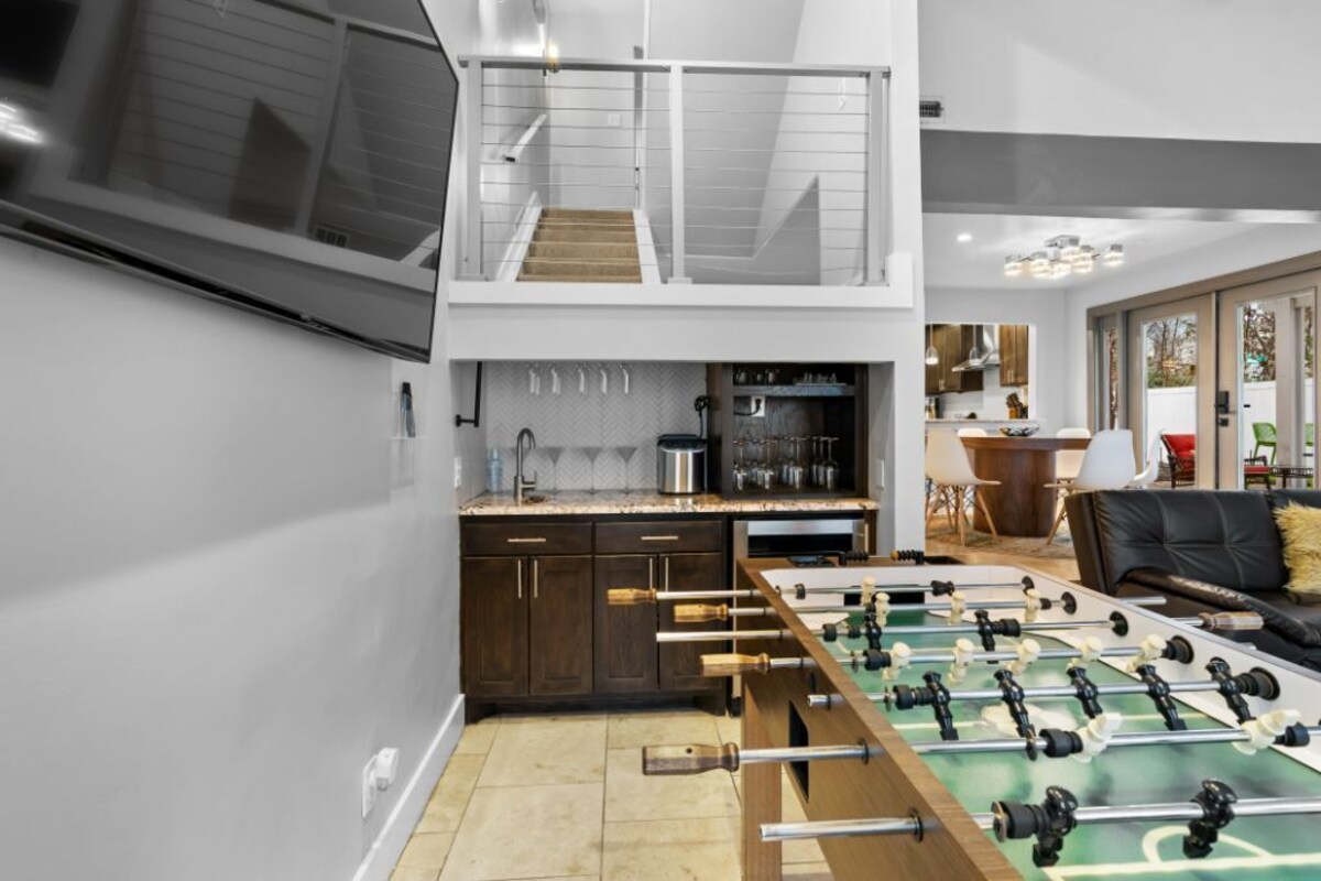 Check out the video tour! youtu.be/r4CWMCT84BM -------------------------------------------- My home is located in the heart of Uptown Dallas! I offer my guests the luxury they crave and the fun they want! The home is posh with thoughtful lux designer amenities and touches both inside and outside! Many guests remark what makes my home truly special is my outdoor area! In Uptown, finding a home with a vast oversized yard such as mine is nearly impossible! The Patio and mature Crépe Myrtles draped with lights create a beautiful serene ambience in the evening's. These trees also offer vast shade during hot Texas summer days! Relax in the spa, chat around the fireplace, or challenge your fellow guests to play one of our numerous indoor and outdoor games! Whichever, this vacation home is perfect to create fun lasting memories together! FULL DESCRIPTION: Upon entering the home, the 30ft soaring ceilings are impressive. The open floor plan design makes it perfect for entertaining. The oversized living room features two sleeper sofas, foosball table, 65” tv, and also a bar with mini fridge, counter top ice maker and assorted glass bar ware. The kitchen is modern, stocked with top quality cookware, motion active range hood, high end GE Profile appliances, 8 in 1 microwave and more. The counter height bar seats four. The dining area features a beautiful modern round wood pedestal table for six. The master suite is expansive and has its own ensuite bathroom. The room is gorgeously decorated! Featuring luxury floor to ceiling noise reducing thermal black out drapes, hardwood floors throughout and a Cantoni king size bed draped andfitted with Restoration hardware linens. There’s also a Juliette balcony overlooking the yard. Those who can't escape work will also appreciate the desk and leather swivel captain’s style chair located next to the balcony access. The 2nd bedroom has soaring 30ft ceilings. This room has a bunk bed with single over double sleeping accommodations and large TV. Beautiful privacy glass paneled French doors open to the 3rd bedroom. This gorgeous room features a queen bed with a modern soft velvet headboard, a beautiful soft contemporary rug all situated in front of a candle lit capable fireplace. This room has luxury floor to ceiling thermal blackout drapery, two soft velvet arm chairs and a large TV hung over the fire place. The 4th bedroom is an enormous 18' x 16' room. This room features matching white leather low profile modern queen beds. The headboards are adjustable for comfort. Luxury modern floor to ceiling thermal blackout drapery helps guests sleep soundly. Additionally, a 60\ ,