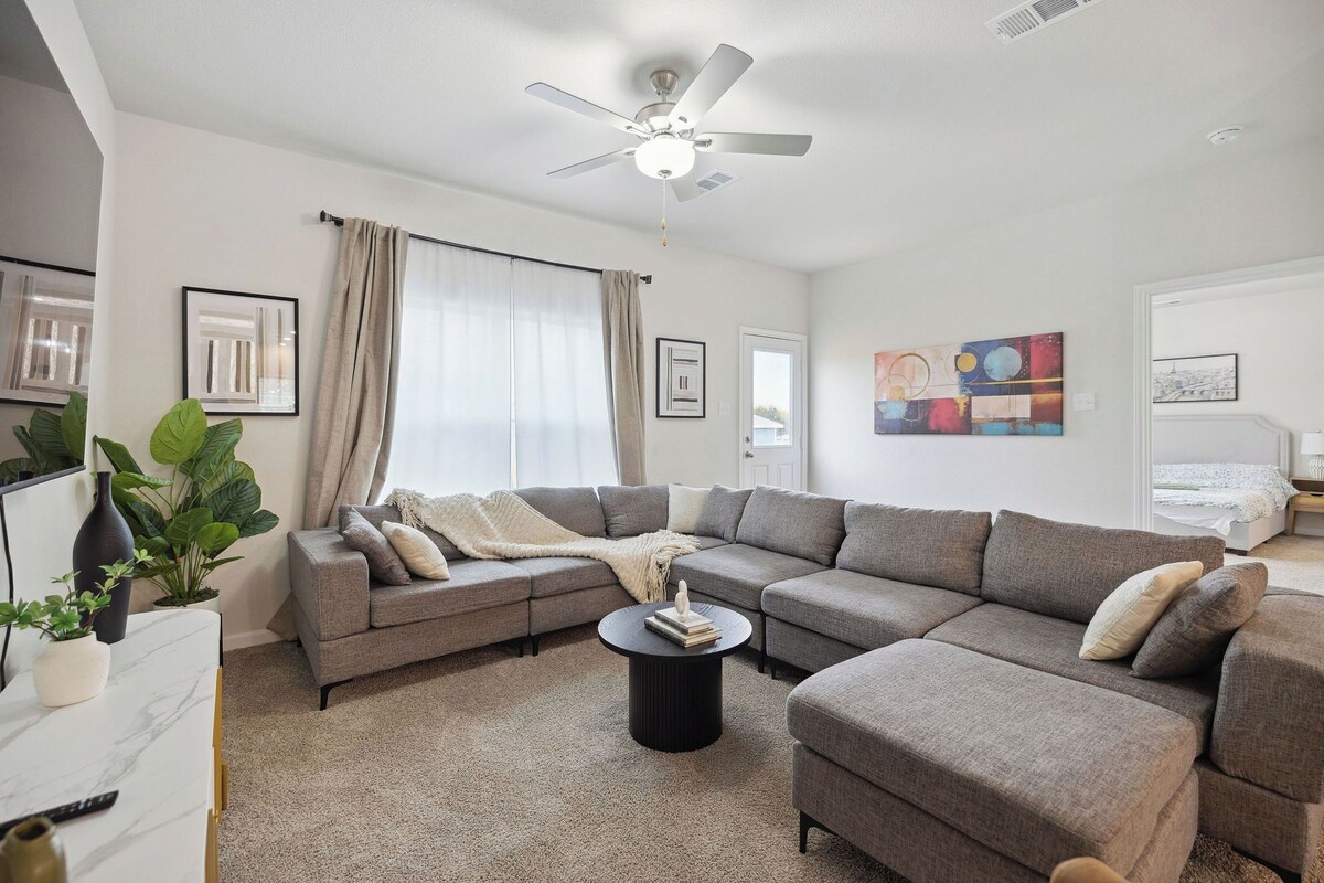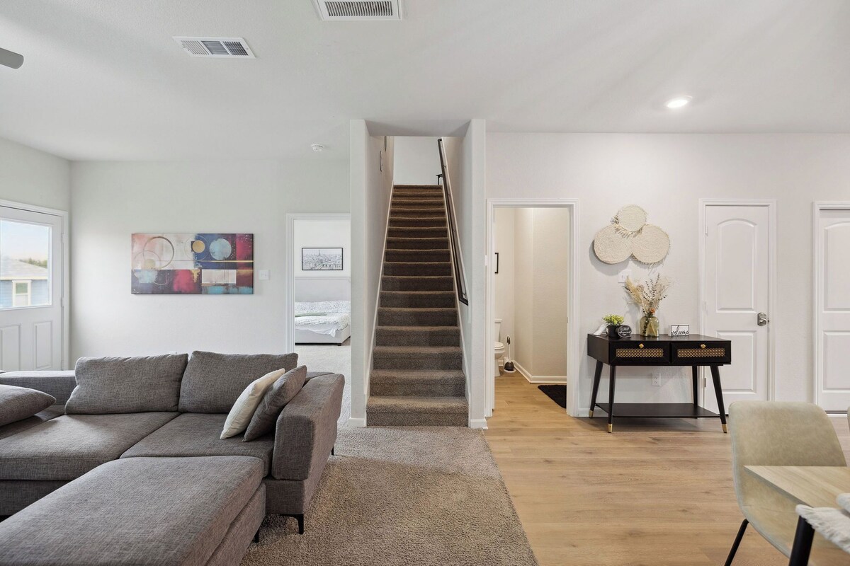 Lavida is a luxurious 6 bedroom, 2.5 baths newly built (2024) spacious house with private backyard located just 12 mins to downtown Dallas, Texas. It can accommodate 15 guests, features Smart TVs, WIFI, Parking maximum of 4 cars, 2 in the garage and 2 in the drive way, No street parking, equipped Kitchen, chic Living area, Dining area, a Master suite, 4 Double Rooms, 1 Games Room/Cinema Room/Sleeping Space, Double Garage, has a camera at the front and back door, Interior is detailed. Brand new building, situated in a quiet neighbourhood, close to Dallas downtown, Airports, Sports Arenas, Shops. Lavida has open-concept living area, dining area, fully equipped kitchen, flat-screen TVs, high speed WIFI. It offers five bedrooms, 1 games room/cinema room that doubles as a sleeping space, and 2.5 bathrooms, with free parking for up to 3 or 4 cars. Lavida can accommodate 16 people comfortably, internet is fast and free. It has a private backyard with seating area, BBQ grill, ideal for outdoor dining or relaxing. A spacious yet chic and modern setting, with carefully selected interior design that gives peace and comfort, where guests can escape to, relax and enjoy an exotic urban oasis with a breathtaking view of Downtown Dallas. Our guests will avail themselves of the comfort of a home, fully serviced, with amazing features and amenities in a stylish and coveted setting. The good size private backyard offers an ambience of relaxation for guests to enjoy. Lavida Villa caters for all types of guests, from multiple families with kids, to business traveller, travel nurses, holiday makers, large gatherings, groups, we have all manner of amenities including napkins, highchairs, baby cots, study area, games etc. Ground Floor The ground floor boasts of a spacious decorated the en-suite Master bedroom, a large bedroom with wall mounted TV (Netflix), attached to it is a private bathroom, a toilet, a full shower, a walk-in wardrobe, and private tub. The living space / lounge also comes with carefully curated furnishings, open plan with dining area and fully kitted kitchen with most kitchen amenities and utensils. It has access to the private backyard and the garage. First Floor The stairs to the first floor give direct access to the stunning games/ cinema room during the day and doubles as sleeping space at night where the 2 sofa beds can be pulled out as 2 double beds which sleeps 3 or 4 adults comfortably (beddings and linese are provided). There are 4 double size bedrooms (3 standard, 1 extra-large) with private wardrobes, and an adjoining family bathroom with bath, shower and toilet. Perfect location for your business, personal, family vacation fully serviced short stay, close to downtown Dallas, it is near popular attractions like the Dallas Zoo, Cedar Hill State Park, Bishop Arts District, Dallas National Golf Club and Fair Parks. It is 12 mins from Dallas downtown, 15 mins from Dallas Love Field Airport, 30 mins from Dallas Forth Worth International Airport, 20 mins from Irving, 22 mins from Sixth Flag Arlington, 30 mins to AT&T stadium and many more attractions. It’s also close to shops, malls and attractions. ★Key Features ★ • Brand New House • Sleeps 16 comfortably • High Speed Internet • 5 Bedrooms, 1 Sleeping Space / Games Room/ Cinema Room & 2.5 Bathrooms • Smart TVs with Netflix • 1 Main Kitchen, 1 Refrigerator - Fully stocked Kitchen for all cooking needs • Garage with 2 spaces and alley access • Laundry room with washer and dryer ★ 6 BEDROOMS & 2.5 BATHROOMS ★ • Bedroom 1 (Master bedroom) - 1 King bed - Sleeps 3 • Bedroom 2 - 1 Double bed - Sleeps 2 • Bedroom 3 - 1 Double bed - Sleeps 2 • Bedroom 4 - 2 Double beds - Sleeps 4 • Bedroom 5 - 2 Single beds - Sleeps 2 • Room 6 - Sleeping Area / Games Room/ Cinema Room - 2 double pull out sofa beds - Sleeps 3 ★ Parking - Allocated space can accommodate 4 cars, 2 in the garage and 2 in the driveway★ ★ Provided Items & Supplies ★ Our luxury house features a starter supply of fresh linens, bath towels, soaps, toilet paper, paper towel, and trash liners for the first 2-3 days. Extra items needed are the responsibility of the guests. BYO beverages ★ Linen and Bedding Service ★ All bed linens and towels are fresh and cleaned, exchanged by our professional cleaning service providers between each stay ★ Holding deposit is required ★ Parties, Noise, Disturbances, Large gatherings are highly forbidden!!!! Yh Our prices include all fees. No hidden fees.