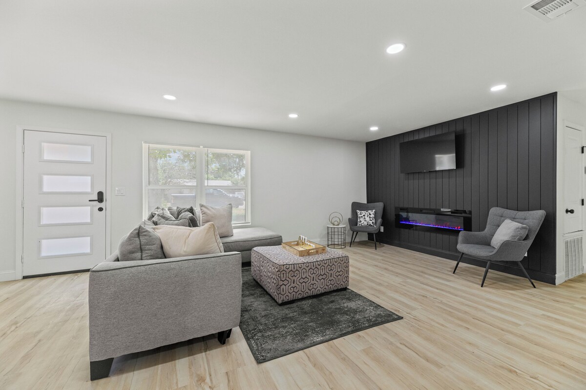 Discover contemporary comfort in this beautifully updated 3-bedroom, 2-bathroom home. The generous master suite boasts a private office nook, perfect for productivity or relaxation. The open-concept living area features sleek finishes and modern amenities, while the large covered back patio offers ample seating for unwinding or entertaining. Ideal for a luxurious short-term stay, this home blends style and convenience seamlessly. Our prices include all fees. No hidden fees.