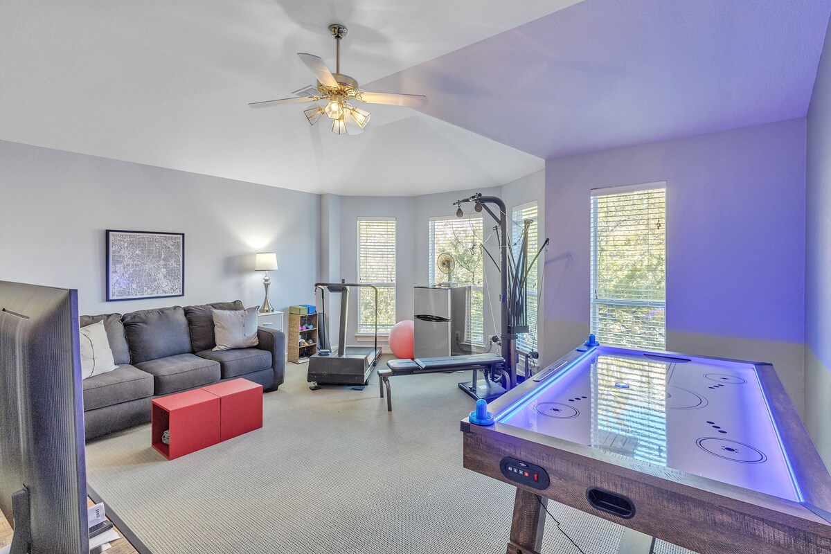 Discover this thoughtfully designed multi-story home in the heart of Dallas, offering convenience, comfort, and plenty of room for your group. First Floor: Enter through the side entrance or directly from the garage, which can accommodate two vehicles and features a finished floor. Two additional parking spots are available in the driveway, and street parking is accessible—just be mindful of posted restrictions. Inside, a fully equipped kitchen awaits, complete with an island and dining area that seats up to eight. The adjacent living room features leather seating, a 65” smart TV, and a Baby Grand piano for music lovers. Step out onto the private patio with string lights for evening ambiance. Second Floor: The staircase leads to a cozy library nook with a desk and an armoire filled with games. A spacious primary bedroom boasts a king bed, a futon, a 55” smart TV, and a luxurious en-suite bathroom with skylights. A small loft with a full sized bed bed offers additional sleeping options. There is also a Pack & Play and a queen sized blow up bed stored in the Primary closet. The secondary bedroom includes bay windows, a full bath, and a 42” smart TV for streaming. Third Floor: The top level features a twin-bedded room with a 43\ ,