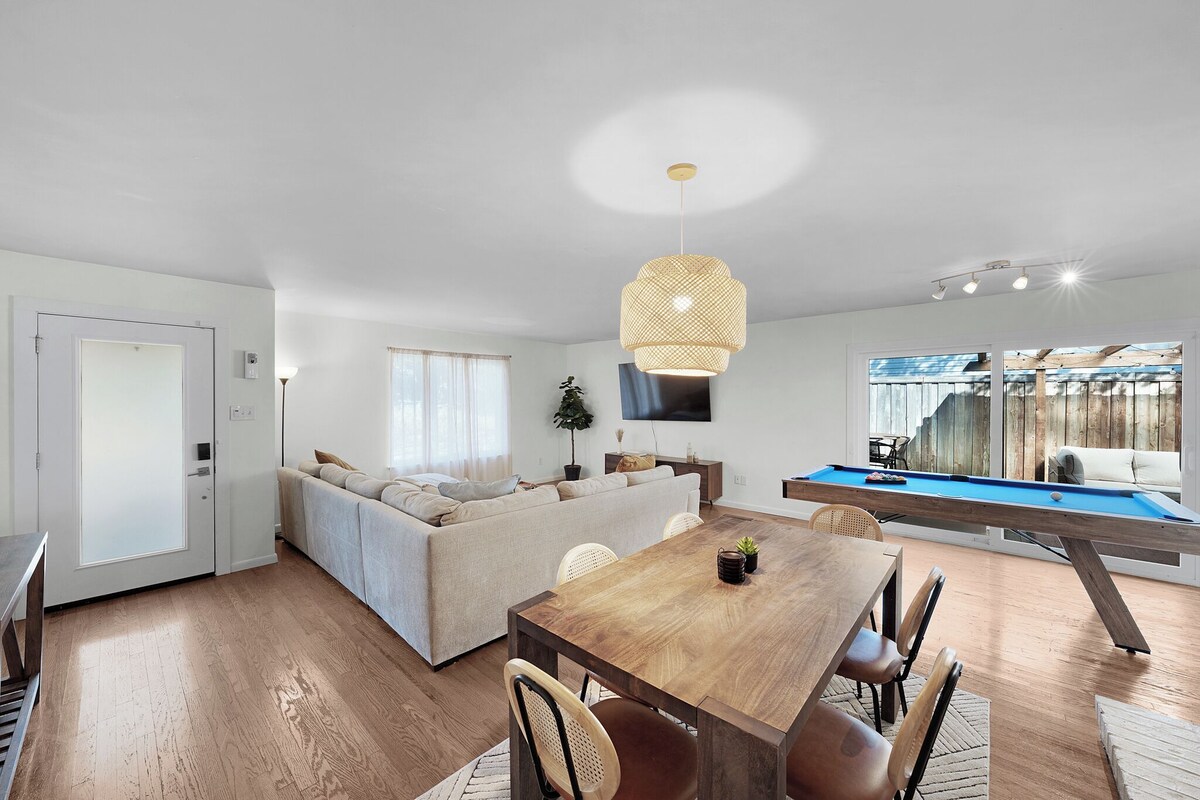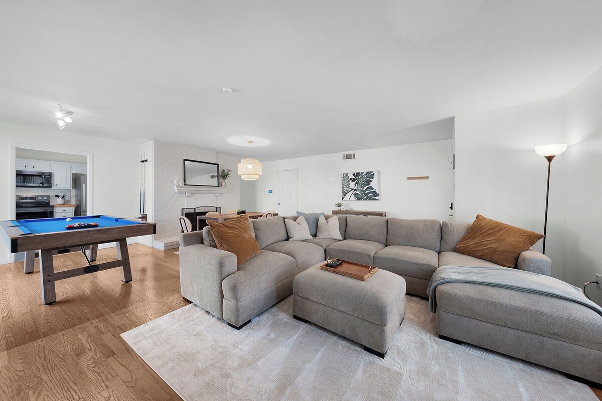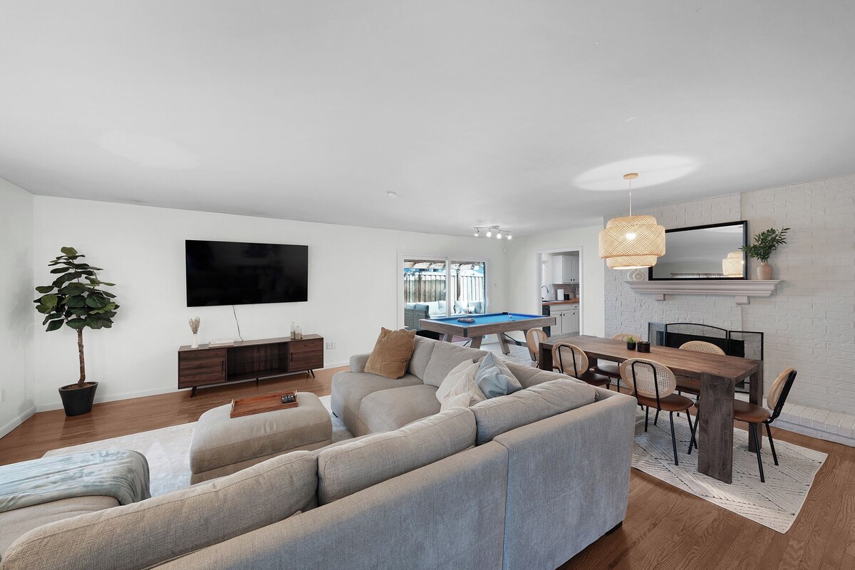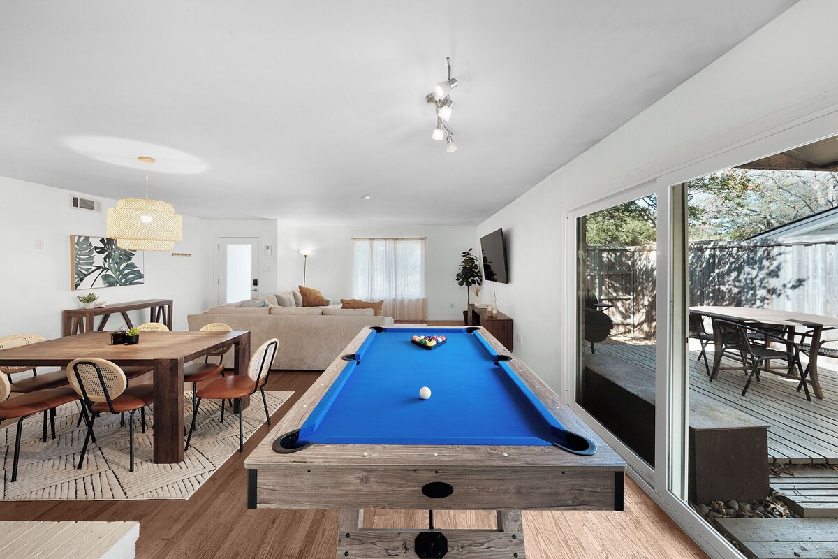 Unwind in this newly renovated luxurious ranch-style retreat, featuring a private pool and secluded patio for ultimate relaxation. This beautifully designed home features a mid-century modern & boho flair with spacious interiors and modern comforts. Awesome amenities include a fully-stocked kitchen, plush bedding, and fast Wi-Fi. Perfect for couples, families, or remote work, all just minutes from top dining and attractions. Experience elegance, comfort, and tranquility—book your stay today! *LOCATION, LOCATION, LOCATION * Centrally located off I-635, this elegant ranch retreat offers quick access to top Dallas attractions, major shopping & entertainment centers, thrilling sporting events, vibrant nightlife, and an abundance of delicious restaurants. Enjoy convenience and luxury in the heart of it all! ✔Dallas Arboretum -Gardens (13 min) ✔Galleria Mall - Great Shopping! (15 min) ✔White Rock Lake(15 min) - Kayak, fish, bike ✔Perot Museum of Nature/Science (20 min) ✔DFW & Love Field Airport (25 min) ✔DT Dallas, Deep Ellum, Art District (25 min) ✔Dallas Convention & AT&T Center (25 min) ✔American Airlines Center (30 min) * FRONT YARD/ENTRANCE * A spacious driveway and seamless self-check-in welcome you to a warm, inviting living space. Take a deep breath and get ready for a relaxing, unforgettable stay! ✔Private Entrance ✔Self-Check-in (Keyless Smart Lock) ✔Free Parking (Private Driveway) ✔Security Cameras (for your safety) * BACKYARD GEM * The fully fenced backyard is a private pool oasis, perfect for year-round enjoyment. With high fences and a wooded creek backdrop, you'll feel completely secluded. Soak up the sun in the resort-style pool, fire up a Texas-style BBQ, and roast marshmallows by the firepit. Don’t forget to snap a selfie at the beautifully lit “Dallas” Photo Wall—the perfect spot to capture unforgettable memories! ✔Private Patio/Deck ✔Fully fenced (high fences for ultimate privacy) ✔Pool (pool chairs, towels, sunscreen, floaties) ✔Fire Pit (Firewood Not Provided by host) ✔BBQ Grill (grilling utensils included) ✔Outdoor furniture & dining (outdoor heater included for cooler months) ✔Insta-Worthy \ backdrop * LIVING ROOM * A cozy space to create memories with loved ones! Relax on the sectional couch, watch TV, enjoy a meal, play pool, or have fun with complimentary games. The perfect spot to unwind and enjoy! ✔Plush & comfy sectional (sits 10) ✔Pool Table ✔Smart TV w/ apps you can use your credentials to log into ✔Dining Table perfect for hosting dinners & holidays (Seats 6) ✔Complimentary card & board games * BEDROOMS * The Master Bedroom offers a private, intimate retreat with a King-size bed, Smart TV, and en-suite bath. The spacious walk-in closet includes a queen air bed, extra linens, hangers, and iron for ultimate comfort and convenience. The second bedroom is equipped with a Queen bed, smart TV, and private closet. The third bedroom has two double beds, a private closet, and a dedicated workspace/desk, making this home extremely accommodating for working professionals. ✔Comfortable beds (1 King, 1 Queen, 2 Full, and 1 queen air mattress) ✔French doors with direct access to the Pool/Yard from every room! ✔Smart TV's ✔En-Suite bath with Jetted Tub (Jacuzzi style) ✔Dedicated workplace ✔Ceiling Fans & Central Air and Heat ✔Closets with extra supplies & amenities (Air mattress, iron) Sleeping Arrangements: This home sleeps 8-10 comfortably as follows: King Bed sleeps 2-3 Queen Bed sleeps 2, Two Full Beds Sleeps 4 Queen Air Bed sleeps 2, Living room Couch can also be used to sleep 1-2 * BATHROOMS * Professionally cleaned and sanitized bathrooms, fully equipped with towels, essential toiletries, and hotel-style amenities. Enjoy ultimate comfort and cleanliness! ✔Professionally cleaned & sanitized ✔Fully Stocked (Towels, shampoo, conditioner, body wash, toilet paper, toothbrushes, etc.) ✔Shower/Tub Combo (including a jet tub & tub caddy for the master bedroom only) ✔Rain Shower Heads & Handheld shower heads * KITCHEN * Start your day strong with a nice cup of coffee or tea, then prepare to channel chef vibes as you whip up decadent meals in the fully stocked kitchen. ✔Coffee & Tea Bar (complimentary coffee, tea, cocoa, creamer, and sugar!) ✔Fully stocked (Pots/Pans, Bakeware, utensils, Plates, Cups, baking sheets) ✔Appliances (microwave, toaster, oven/stove, fridge, dishwasher) ✔Kitchen Table (seats 4) ✔Smoke & Carbon Monoxide Alarms, Fire Extinguisher, and First Aid Kit * GARAGE * ✔Washer & Dryer Your perfect home away from home is here! The only thing left to add is you and your loved ones! We pride ourselves in providing a clean, convenient, comfortable, 5-star guest experience and would love to host you! Guest access The entire home, EXCEPT the indoor fire place and the supply closet in the kitchen. Please do not tamper with the supply closet locks. Garage is accessible to guests only for laundry. If you are low on any supplies (towels, toilet paper etc.) or encounter any issues, please reach out to the hosts. We appreciate your cooperation Other things to note MAXIMUM GUEST CAPACITY The total capacity allowed in the home without additional fees is 10. Additional fees ($20 per person) apply beyond 10 guests, with a max capacity of 12 guests. Please ensure guest count is accurate when reserving the home, including any pets. SMALL GATHERINGS Small gatherings are welcomed but please reach out to the hosts with details as a deposit may be required. Max of 15 for small gatherings, however only 10-12 Max may sleep over. All house rules and checkout instructions are to be followed when hosting small gatherings. Please be considerate of noise levels to respect our neighbors. There are no DJ’s, professional sound systems/speakers or microphones allowed. No usage of drugs or weapons. No adult filming. NOTE: PARTIES ARE NOT ALLOWED UNDER ANY CIRCUMSTANCES. IF PARTY IS DETECTED, GUESTS WILL B
