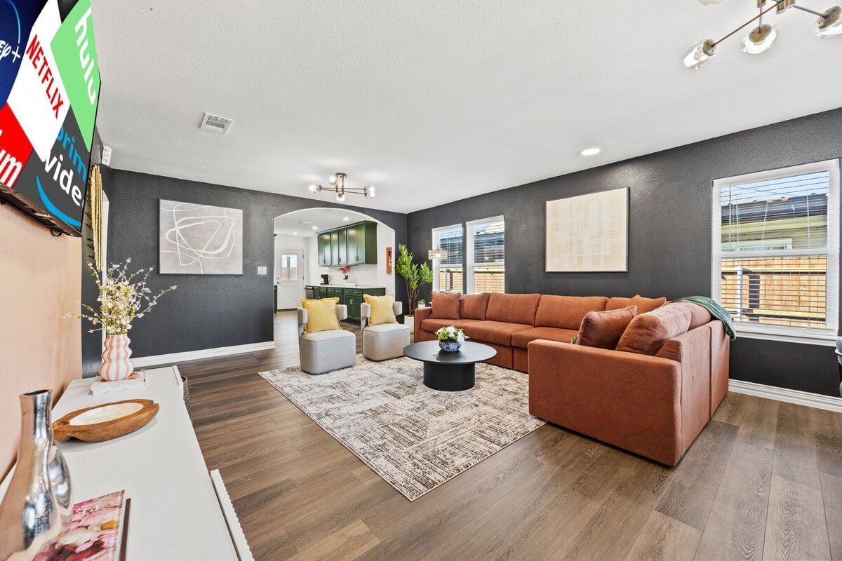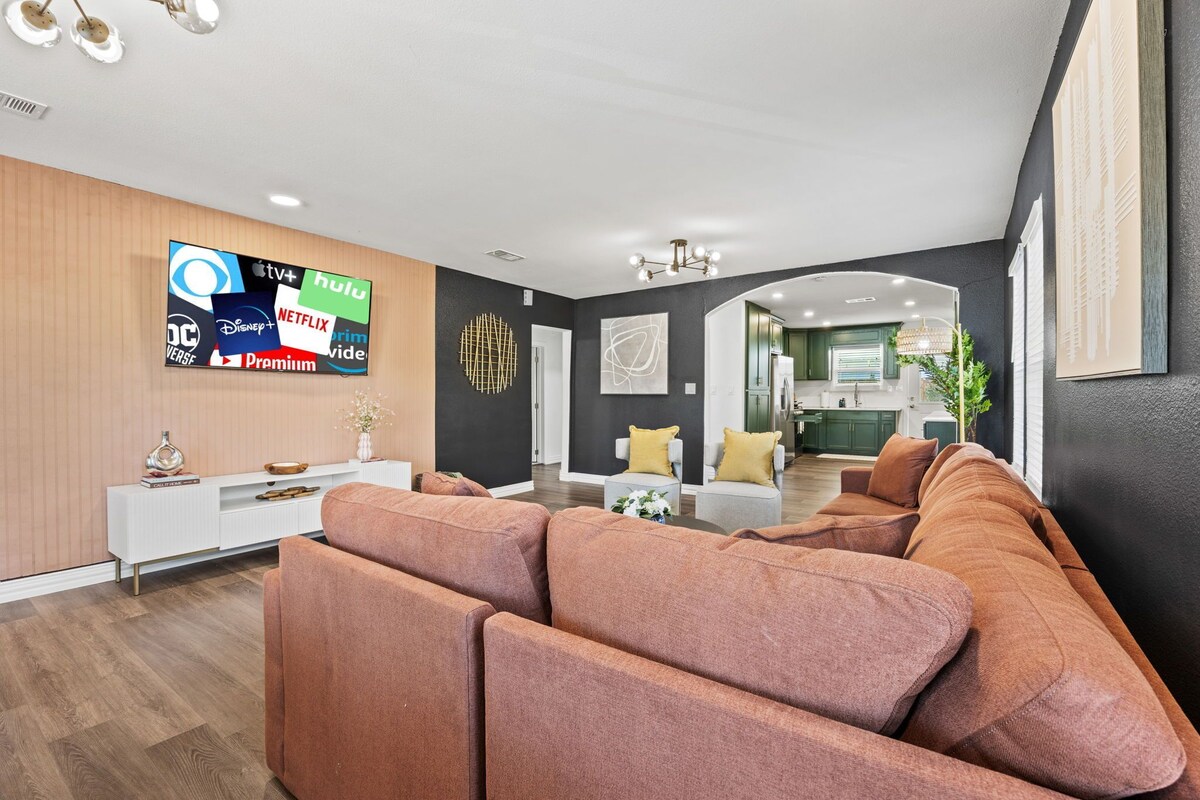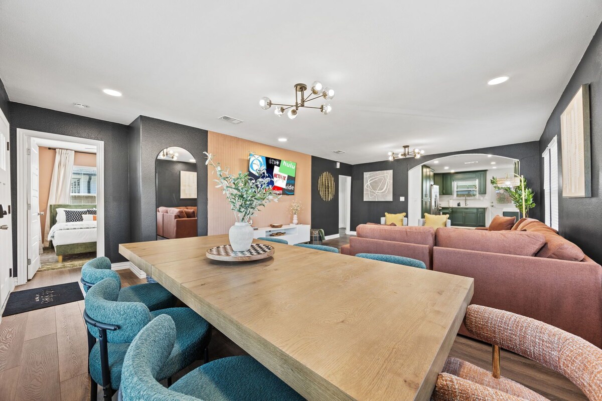 Welcome to your stylish and spacious getaway in the heart of Dallas! Just minutes from Bishop Arts District, Downtown, Deep Ellum, and the American Airlines Center, this home offers the perfect blend of comfort, entertainment, and convenience. With an open-concept design, private backyard with games, BBQ grill, and a large driveway, it’s ideal for families, groups, or business travelers. The Space: This 3-bedroom, 2-bathroom home comfortably sleeps 8 guests. The open concept living and dining area is bright and inviting, making it easy to relax and entertain. Sleeping Arrangements: Master Bedroom: ✔1 King Bed ✔En-Suite Bathroom ✔Office Desk & Chair ✔Closet + Hangers Bedroom 2: ✔1 Queen Bed ✔Black out Curtains ✔ Smart TV ✔ Closet + Hangers Bedroom 3: ✔2 Queen Beds ✔Black Out Curtains ✔Smart TV ✔ Closet + Hangers Each bedroom features plush bedding, soft linens, and ample storage for a restful night’s sleep. Bathrooms: Master Bathroom & Guest Bathroom: ✔Stand-up shower ✔ Wash Basin ✔ Light Up Mirror ✔ Toilet ✔ Towels ✔ Hair-Dryer ✔ Essential Toiletries Open-Concept Living & Dining The spacious living room has a large smart TV and comfortable seating. The dining area includes a large table that seats 8, making it perfect for shared meals and game nights. The fully equipped kitchen features: ✔ Stainless steel appliances ✔ Coffee maker ✔ Cooking essentials & dishware ✔ Large Island for meal prep & casual dining ✔ Microwave ✔ Stove ✔ Oven ✔ Refrigerator/Freezer ✔ Dishwasher ✔ Toaster ✔ Sink - Hot & Cold Water ✔ Glasses ✔ Silverware ✔ Pots & Pans Backyard Fun & Entertainment Step into your private backyard, designed for relaxation and fun. ✔ BBQ Grill – Perfect for cookouts ✔ Outdoor Seating – Enjoy morning coffee or evening drinks ✔ Yard Games – Great for friendly competition ✔ Hammock for the ultimate Relaxation Large Driveway – Easy Parking No need to worry about parking—this home features a big driveway with space for multiple vehicles. Prime Location – Close to Top Attractions: ✔ Bishop Arts District (5 min) – Trendy shops, cafes, and nightlife ✔ Dallas Zoo (7 min) – Family-friendly fun ✔ Downtown Dallas (10 min) – Reunion Tower, Dealey Plaza, and restaurants ✔ Deep Ellum (12 min) – Live music, bars, and murals ✔ American Airlines Center (15 min) – Concerts & sports events Why You’ll Love This Home: ✔ Spacious & Stylish – Open floor plan with modern decor ✔ Great for Groups – Sleeps 8 comfortably ✔ Perfect for Entertaining – Large dining table, backyard games, BBQ grill & Hammock ✔ Unbeatable Location – Minutes from Dallas’s best attractions. Book now and experience comfort, style, and convenience in this beautiful Dallas retreat! Our prices include all fees. No hidden fees.