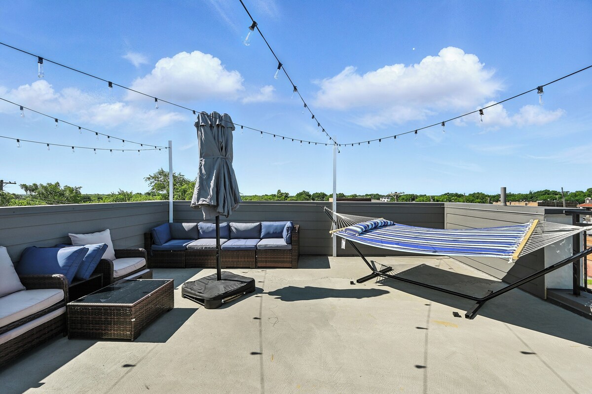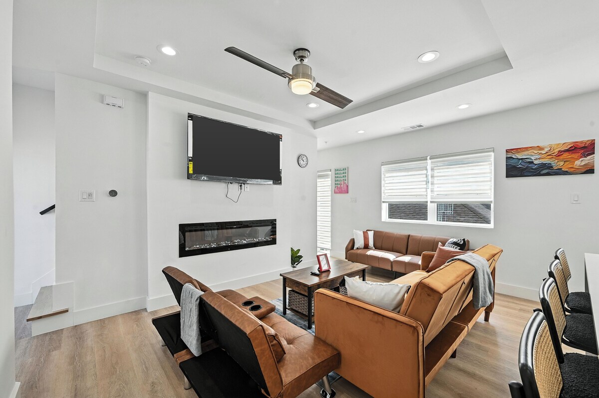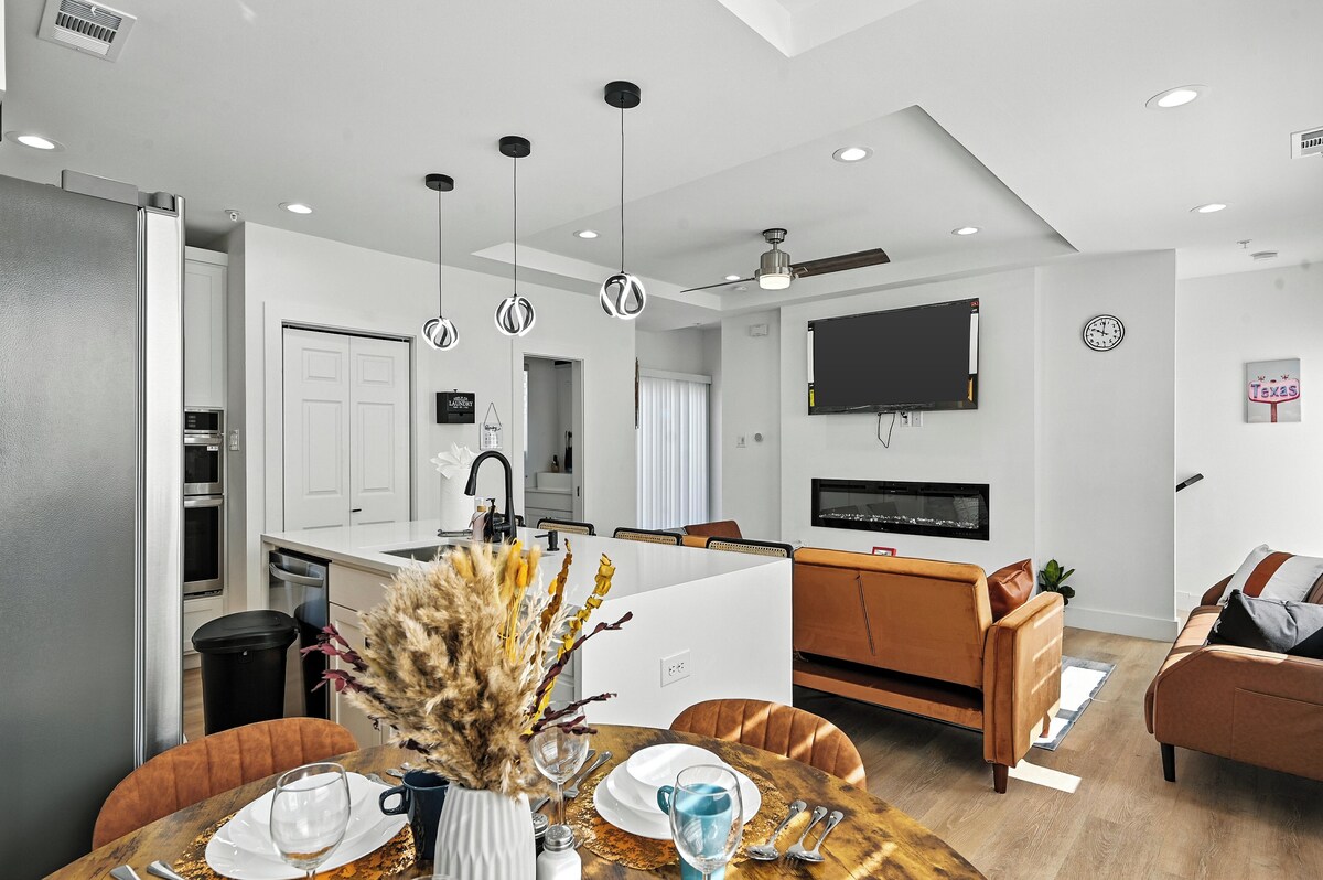 Welcome to your stay in Bishop Arts! This newly constructed townhome is in prime location for you and your group! This vibrant neighborhood is known for its eclectic mix of local shops, art galleries, and unique dining options. You’ll find everything from cozy cafes to upscale restaurants, all within walking distance. Our space offers a comfortable retreat with all the essentials you need, plus a few extra touches to make your stay memorable. Enjoy your stay! The space Welcome to your modern oasis in the heart of Bishop Arts! This sleek, four-story townhome offers contemporary luxury and convenience with a design that complements the vibrant neighborhood. First Level: Enter through a spacious two-car garage, providing secure parking and additional storage space. Second Level: Step into an open-concept living area featuring a stylish kitchen with high-end appliances, ample cabinetry, and a central island perfect for entertaining, also a convenient powder room. The adjoining dining area and living room create a seamless flow for relaxation and gatherings. Third Level: Enjoy two well-appointed bedrooms, each with its own private ensuite bathroom. Both rooms offer comfort and privacy, and flat screen smart TV ideal for family or guests. Fourth Level: The top floor, from here, access the expansive rooftop patio, where you can unwind and take in panoramic views of the city. This townhome is - 1 min away from Bishop arts -10 min away from Downtown Dallas/Kay Bailey Convention Center -12 min from American Airlines Center/Victory Park -14 min from Deep Ellum/Uptown Dallas and much more! If you have questions on how far it is from a specific destination don't hesitate to message us! - Our prices include all fees. No hidden fees.