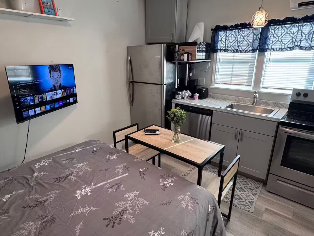 Pet-Friendly Studio Unit | Full Kitchen | High-Speed Wi-Fi | Private Entry | Great Location Welcome to your comfortable and convenient home base in Dallas. This private efficiency unit offers everything you need for a relaxed and easy stay—whether you're here for a quick visit or something longer. Inside, you'll find a queen-size bed, a 40” smart TV, and bathroom with a walk-in shower. The kitchen is fully equipped with a stove, oven, microwave, dishwasher, cookware, dishes, and complimentary coffee to get you started. A combo washer and dryer are located in the unit for your convenience. Stay connected with high-speed Wi-Fi, and enjoy year-round comfort with heating and cooling via a quiet mini split system. The unit has a private entrance, free street parking, and an EV charger available upon request. Pets are welcome, too. Located in a quiet residential neighborhood, you're just minutes from Downtown Dallas, close to the Tyler/Vernon Red Line DART station, and just a short hop to the heart of Bishop Arts District—one of the city's most vibrant and walkable areas for dining, coffee, shops, and nightlife. Whether you're here to work, explore, or simply unwind, this space is set up to make your stay as smooth and enjoyable as possible. Our prices include all fees. No hidden fees.