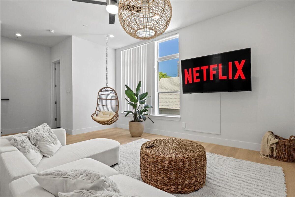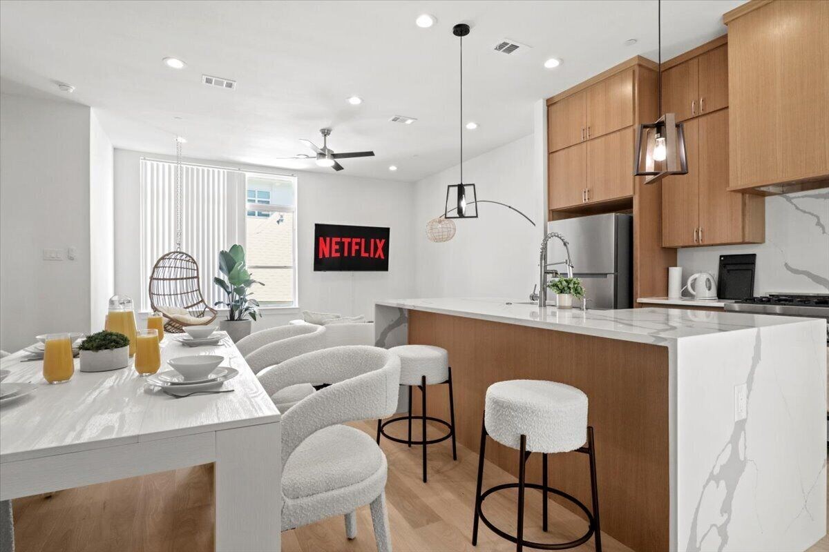 Discover the perfect blend of style, comfort, and convenience at our centrally located townhouse. With a spacious open layout, a fully stocked kitchen, and a relaxing master suite, it’s ideal for families, business travelers, or anyone eager to enjoy Dallas to the fullest. The space 🌟 Chic & Cozy Living Our sunlit open-concept living room, styled with boho-inspired décor, creates the perfect spot to relax, entertain, or simply feel at home. 👨🍳 Chef’s Kitchen Cook with ease in the fully equipped kitchen featuring stainless steel appliances, plenty of cookware, and a coffee station to kick-start your day. 🛏️ Luxurious Master Suite Retreat to the king-sized bed, enjoy dual walk-in closets, and indulge in a spa-like en-suite bathroom complete with soaking tub, bidet, and modern finishes. 🕹️ Games & Fun From pool and foosball to ping pong and board games, the multi-game table ensures entertainment for all ages. 📶 High-Speed Wi-Fi Stay connected and productive with fast internet throughout the home. 🏡 Unique Touches Indoor swings bring playful charm, while the outdoor BBQ area makes al fresco dining a delight. 🔥 Rooftop Escape Enjoy evenings by the rooftop fireplace with beautiful views—perfect for unwinding after a day in the city. 🚗 Convenient Parking Take advantage of two private parking spots plus ample street parking nearby. Guest Access You’ll be close to some of Dallas’s best highlights: Dining: Pecan Lodge (barbecue), Bread Winners Café (brunch), Meso Maya (upscale Mexican) Coffee: Houndstooth Coffee, Magnolias: Sous Le Pont Attractions: Klyde Warren Park, Dallas Museum of Art, Deep Ellum nightlife & street art Family Fun: Dallas World Aquarium, Perot Museum of Nature & Science Shopping: NorthPark Center, Bishop Arts District Other things to note Make your Dallas getaway unforgettable in this stylish and comfortable retreat. Please note that parties are not permitted, with a $3,000 fine for violations. Our prices include all fees. No hidden fees.