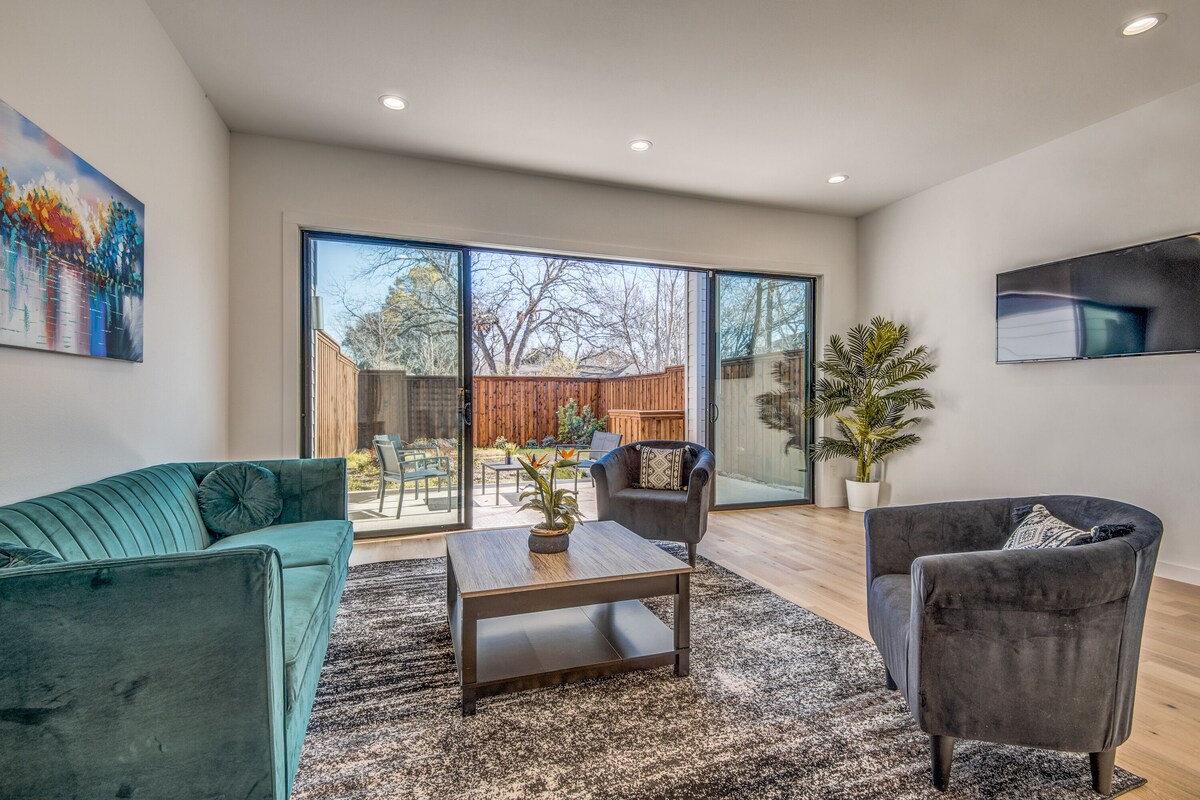 Captivate! A spacious, comfy, property in the heart of Dallas! •Centrally located •Minutes to Medical District, Market Center, Mavs Arena, AT&T Stadium, Airports & ALL DFW attractions *****3 bedrooms with an open loft as additional sleeping quarter***** •Fully stocked kitchen •Gorgeous outdoor space •One side of duplex, check our other listings. •4th bedroom space is a loft/office •Wi-fi w/Smart TVs in rooms •5 parking spots; 1 garage, 4 spots in the driveway •Dart Rail within walking distance • Fits 8 people very comfortably. The other side of the Duplex is a separate listing. (4th bedroom is an open loft, no door) Uptown, Victory Park, the Design District, and Bishop Arts. Unwind in cozy, stylish interiors, cook like a pro in the chef-inspired kitchen, or step out to enjoy Dallas' top spots around town. Whether you stay to work or play, this home is your perfect launchpad! Your unforgettable Dallas stay starts here—book now and make it yours! **THE SPACE** 2-story home with open loft + 3 bedrooms + 2.5 bathrooms. Enjoy the airy open-plan layout, chef’s kitchen, cozy living spaces, and a private patio for fresh air downtime. The versatile loft includes a workstation and a convertible sleeping area—ideal for work trips or extra guests. **Walkable** to the World Trade Center & Market Center DART Station **5 mins** to American Airlines Center **10 mins** to Downtown, the Design District, Medical District & Uptown **20 mins** to AT&T Stadium Easy access to Love Field, Downtown, and major highways **Perfect for families & business travelers** Nearby Attractions ✔ 5 mins – American Airlines Center (concerts & sports) ✔ 10 mins – Downtown, Design District, Medical District, Uptown ✔ 15 mins – Klyde Warren Park, Dallas World Aquarium, Perot Museum ✔ 20 mins – AT&T Stadium (Cowboys games + major events) Neighborhood Highlights ✔ Trendy bars, cafes, and fine dining just minutes away ✔ Convenient access to shopping & nightlife ✔ Walk to World Trade Center & Market Center DART Station **GUEST ACCESS** Guests enjoy **exclusive access** to the full property, including all **indoor spaces and the private backyard**. **Parking** – 1 vehicle in garage + driveway 4 standard vehicles ⚠ Large trucks may not fit in the garage **Smart Lock Entry** – Secure, keyless front door access **Self Check-In** – Arrive anytime with simple instructions sent ahead Everything is tailored to maximize your comfort—arrive, relax, and make yourself at home. **OTHER THINGS TO NOTE** House Rules – Please Review Before Booking To keep the experience top-notch for everyone, please follow the rules below: 1. Quiet Hours – 10 PM to 7 AM 2. No Parties or Events – $1,000 fine and cancellation without refund 3. No Smoking, Vaping, or E-Cigs Indoors/Backyard – $1,000 fee + ozone cleaning if violated 4. Undisclosed Guests – $50 per guest/night for anyone not listed 5. Do Not Tamper with Security/Smoke/CO Devices – $1,000 fine + possible removal without refund 6. Early Check-In / Late Check-Out – Must be pre-approved. $50/hr. (authorized); \\$100/hr. (unauthorized) 7. Pet Policy – Furry family members are welcome! Dogs only $125 additional cleaning fee per stay. Dogs over 25 lbs. require prior approval. Must be listed in the reservation. Unauthorized pets = $250 cleaning/repair charges. Service animals are welcome in line with Airbnb’s policies, but the cleaning fee still applies to maintain an allergen-free space for future guests. 8. Excessive Mess or Damage – Additional cleaning or repair fees may apply. Booking this home confirms your agreement to these terms. Let's make it a great stay for all! **BOOK NOW** Stay in style. Sleep in comfort. Explore Dallas with ease. This home is your perfect escape—make memories that matter! **LIVING AREAS** ● Bright, modern open concept living space ● Comfy couches + sleek decor ● Smart TV ready for streaming ● Indoor & outdoor games included **CHEF’S KITCHEN & DINING** Fully stocked with essentials: ● Appliances: stove, oven, microwave, toaster, blender, rice cooker, slow cooker, hand mixer ● Cookware + cutlery ● Coffee + tea bar ● Kitchen island (seats 4) ● Dining table (seats 8) **BEDROOMS: SLEEPS 8–10** ● *Primary Suite*: King bed, private balcony, Smart TV, ensuite bath, desk nook + walk-in closet ● *Bedroom 2*: Queen bed, Smart TV, Jack & Jill bath, closet ● *Bedroom 3*: Queen bed, Smart TV, Jack & Jill bath, closet ● *Loft Area*: Twin bed or futon + dedicated workspace for 2 -Premium linens, pillows, reading lamps, full-length mirrors, irons, and boards included! **BATHROOMS** ● Ensuite dual shower in Primary ● Jack & Jill bath with private WC ● Half bath on main floor ● Fresh towels, toiletries, hair dryer + essential personal care stocked **OUTDOOR SPACE** -Lounge seating for 6–8 on patio -Perfect for morning coffee or evening cocktails **TECH & EXTRAS** ● High-speed Wi-Fi ● Smart TVs in living room and bedrooms ● In-unit washer/dryer ● Central A/C + ceiling fans Our prices include all fees. No hidden fees.