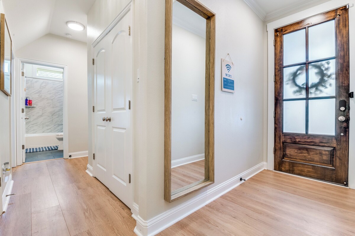 A lovely space to unwind and relax after a busy day whether it is work or play. Awake refreshed and ready for a day exploring the city via this clean, sunny home. The home is located in West Dallas. Whatever brings you to Dallas– wish to explore the city, just have a good time and enjoy nightlife, cultural events, sporting events, visiting university, business, or any other reason, the location of the home and the way it is suited makes. The house is spread over two floors, with plenty of room for everyone to relax and unwind. The main floor features an open-concept kitchen and living room, perfect for gatherings and entertaining. The kitchen is fully equipped with all the necessary appliances and cookware to prepare your favorite meals. There is also a dining room table that seats 8, as well as a cozy fireplace to enjoy on those chilly evenings. First floor, 3 bedrooms with 2 full bath. The living room features comfortable seating and a large flat-screen TV, perfect for movie nights or relaxing after a long day. There are also plenty of windows throughout the house, providing an abundance of natural light and stunning views. The master bedroom has a private en-suite bathroom. There is also a laundry room located on the upper floor, so you can easily take care of any laundry needs during your stay. Upstairs, you'll find 2 bedrooms, with a full bath, all with comfortable beds and plenty of storage space for your belongings. Outside, there is a patio with outdoor seating and a charcoal grill, hot tub, perfect for enjoying the fresh air and beautiful surroundings. There is also a fenced-in backyard, providing a safe and secure space for kids to play. Our home is located in a quiet and friendly neighborhood, close to all the local amenities you'll need during your stay. There are several supermarkets, restaurants, and shopping centers located within a short drive of the house. The city center is also just a short drive away, offering a wide range of attractions and activities for all ages. We hope you'll choose our home for your next vacation or business trip, and we can't wait to welcome you! Our prices include all fees. No hidden fees.