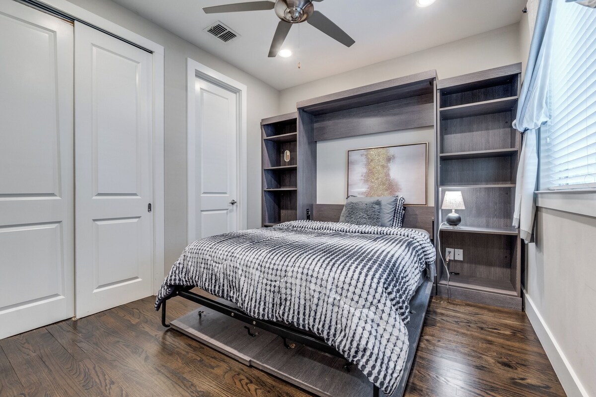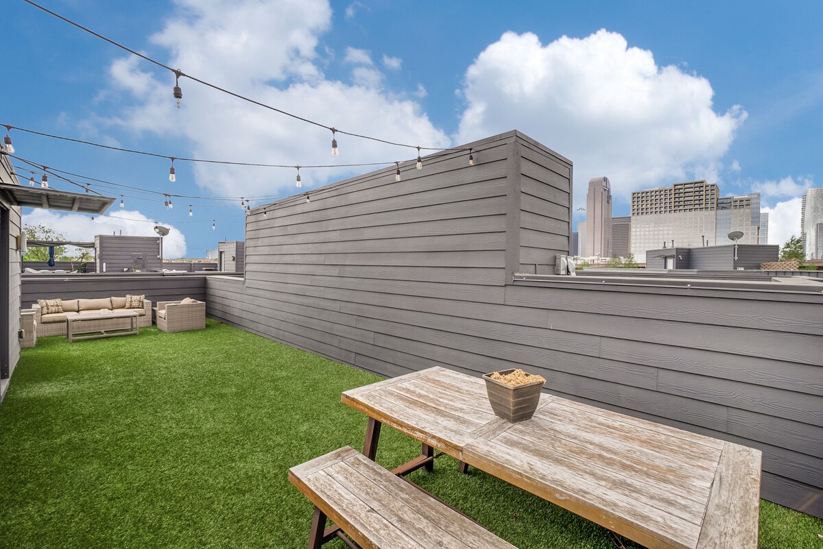 3 story townhome with a full skyline view of Downtown Dallas from the large rooftop terrace for you to lounge in. 2nd floor features a sleek kitchen, complete with a sizable island, stainless steel appliances, a wet bar with built in wine refrigerator. This all flows into an open dining and bright living room. The master bedroom offers dual sinks, ample storage and walk-in closet. Large rooftop deck, with upgraded turf, is ideal for entertaining with AMAZING downtown views.