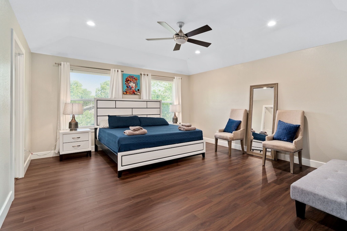 Bright and spacious, this comfy farmhouse is conveniently located in the heart of Dallas! With so much to do 4 minutes away, check out Trinity Groves’ Margaret Hunt Hill Bridge and restaurants such as Saint Rocco’s. Only 10 minutes from downtown Dallas, this big home features a fully stocked roomy kitchen perfect for dinners as well as bathrooms with plentiful necessities for whatever you may need! Ideal for large groups looking for comfortable getaway and those who want a home away from home. The beautiful open kitchen design lets you host large dinners more than comfortably as it is also fully stocked with everything you could need to cook big meals! Perfect for big groups, the massive dining table seats 10 along with the roomy kitchen island that seats 4. For caffeine lovers, the coffee station is complete with keurig pods as well as drip coffee for your use! Start or end your days with our fully stocked bright bathrooms that include all necessities and extras such as makeup remover wipes. Get restful nights with our comfy double/queen/king size beds. The living room couch is also a pull-out bed if more space is needed. The master bedroom features a luxurious king bed and mounted TV for all your watching needs! The master bathroom contains a stand-up shower but also a separate deep bathtub made to relax in after an eventful day. Watch the sunset outside in our second story balcony with a Dallas skyline view! The balcony is complete with a seating area to enjoy morning cups of coffee while watching the sunrise! The massive backyard features a patio seating area and plenty of room to entertain your guests, bring some picnic blankets and bask in the warm sun! All spaces within the home are accessible to the guests except the utility room such as the supply closet and any attics/crawl spaces. Three House rules No Disruptive parties - Events with loud music, parking violations, excessive drinking, take place primarily at night, and 25+ people are not allowed. Smoking is not permitted inside ($400 fine), no tampering with cameras/security devices, no DJs or large sound systems (Only regular speakers). First 16 guests are included by the base rate which includes everyone visiting and spending the night. Keep all guests and noise inside after 10:00 PM Our prices include all fees. No hidden fees.