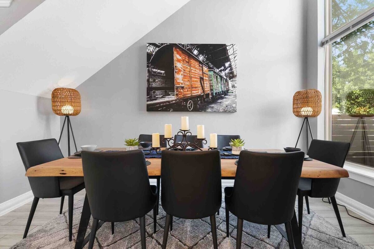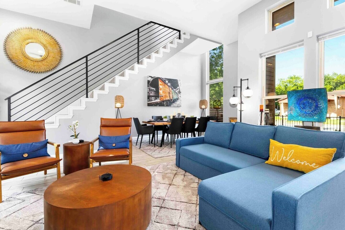 Ultra Modern Luxury near Downtown Dallas! This contemporary house was designed and built by a renowned local architect. Located less than 10 mins to all of Dallas’ top sights, this newly built 2-story home has soaring 16 foot ceilings and was professionally designed and appointed with unique and stylish furnishings throughout. No detail overlooked! The home has an indoor and outdoor living room, 3 large bedrooms each with walk-in closets, 14-inch cooling memory foam mattresses and smart TV's. 🤩Enjoy peace of mind knowing your host is easily reachable and committed to making your stay comfortable and hassle-free. We're here to support you. Located on the west side of Downtown Dallas along the Trinity River, this vibrant and artist area of Trinity Groves is not only conveniently close to all of Dallas' major attractions, but also offers the best view of the city skyline. The home is away from the main street in quiet neighborhood. The property is very private with are no direct neighbors on either side. You'll have the best of both worlds of being conveniently close to downtown, but just far enough for a nice quiet sleep, with ample space for your family, friends and all of your vehicles. There are 2 gated parking spaces along with ample free street parking. ✨Your Private Oasis: Entire Property with Exceptional Privacy. This entire home is yours to enjoy, providing complete exclusivity and comfort. Situated with no adjacent neighbors, you can truly unwind and make the most of your stay in complete privacy. Rustic Modern Luxury! Absolutely no detail overlooked in the design of this new 2000 SF two-story single family home. No details overlooked. Contemporary private home with all brand new furnishings. Home features indoor and outdoor living areas, slate tile flooring throughout, an opulent dining room for 8 with and imported live-edge mango wood table, large kitchen, full-sized laundry, 14ft rain showers in bathrooms, 3 private bedrooms each with walk-in closets, bedside charging ports, smart TV's, 14-inch Novafirm Gel Memory foam mattresses, four memory foam pillows and 800 thread count Damask sheets. Family room has a large 65” Smart TV, a Queen convertible sofa, 2 ceiling fans, modern leather chairs, and ample seating for your family time or game nights. All TV’s preloaded with Netflix, HBO Max, Peacock TV, Hulu, Disney Plus, ESPN+ and live TV channels. Kitchen equipped with all full size appliances and fully stocked with anything you may need. Keurig coffee machine with Starbucks coffee provided. Home is equipped with a high powered 5 ton dual-zone AC unit for those warm Texas days. Relax outside in the oversized covered balcony living area with ample seating for your entire group as your enjoy a drink or watch TV outdoors until the stars. A beverage cart, outdoor ceiling fans and blankets will not make you want to leave! This home is located just west of Downtown Dallas over the landmark Margarat Hunt Hill Bridge with spectacular views of downtown. The home is in a transitional neighborhood just 1 mile from Trinity Groves (a hub with out tons of restaurants with outdoor patios). The home is on a main road with a church directly across the street . The neighborhood is safe, and changing rapidly with a mix of older homes and some newer multi-million dollar homes. The property is fenced off with a locked gate, gated and secured parking as well as an alarm system with an exterior camera available for use by guests. If the transitional neighborhood is not a fit for you, you are welcome to book at any of our other Dallas properties. The home is conveniently located along the Trinity River just 5 minutes from Downtown Dallas and all of the city's main attractions. Very easy to get to around by Uber or if you have a vehicle. Only 5 miles from Dallas Love Field airport and 15 miles from DFW International airport. Less than 10 mins to: - Dallas Love Field Airport - Trinity Groves dining district - Trinity River Park - Medical District - Margaret Hunt Hill Bridge (fireworks) - Reunion Tower - American Airlines Center - Dallas Museum of Art - Nasher Scupture Center - Klyde Warren Park - Perot Museum - Design District - Victory Park - Dealey Plaza - Dallas World Aquarium - Deep Ellum - Dallas Farmers Market - Mavericks Stadium - Oak Cliff retail and dining district - Bishop Arts District shopping - Oak Lawn nightlife and dining - West End Historic District - Dallas Farmers Market Less than 15 mins to: - Highland Park Village - Deep Ellum nightlife and shopping - Katy Trail - Turtle Creek Park - Uptown dining and nightlife - West Village shopping and nightlife - Inwood Village shopping and nightlife - SMU Campus Our prices include all fees. No hidden fees.