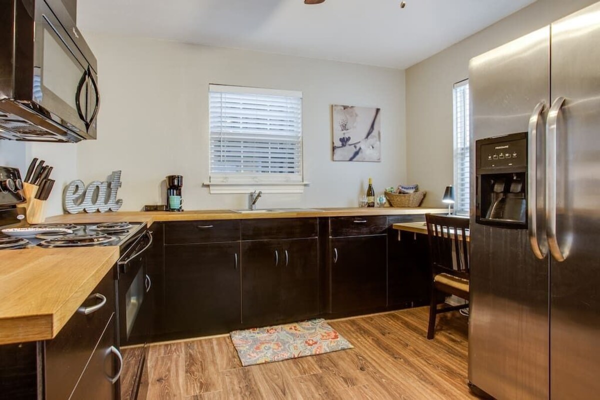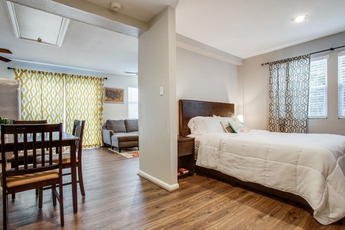 Summary: Welcome to your private studio apartment! Cleaning is of utmost importance- we exceed cdc recs with our electrostatic sprayer that sanitizes all surfaces including all furniture and switches/knobs. Separate parking & entrance provides privacy & convenience. 1 mile from downtown and equally close to Bishop Arts allows for business, site-seeing, shopping & incredible restaurants. Enjoy a plethora of amenities: a full kitchen, large closet, fast wifi, and a variety of movies to name a few. The Space: Give back with your stay! A portion of proceeds go to support nonprofits as well as sponsor a child from Ecuador (Each of our units sponsors a different child). This adorable apartment is the perfect size for a quick getaway or a peaceful oasis during a business trip. It is separate and private- a tall fence divides our backyard and Sunny Door with its private driveway so we are essentially “neighbors”. Bedroom: 1/2 wall divides the bedroom from the hallway to the bathroom allowing for quite a bit of privacy. The bedroom area gets dark and cozy! Large bathroom has full size tub/shower, & large closet- enough to fit several suitcases. The living area: comfortable couch that turns into a full sleeper sofa to accommodate more guests. Smart TV with access to a variety of free movies as well as amazon prime video and Netflix. A full kitchen with oven, stove, full size fridge & microwave. Stocked with Coffee, instant oatmeal, & muffins to get your morning going- other grocery items available upon request (see below for more details). Dining table to enjoy your meals as well as a separate desk with desk lamp to get some work done. Prefer two queen beds? Check out our other listings with queen beds extremely close by. Great location for Stars, Mavs, Rangers and Cowboys games! 1/2 a mile to the trolley that takes you downtown .8 miles from wedding venue Chijmes. 1 mile to Stevens Park Golf Course (one of the best public golf courses) 1 mile to fantastic shopping and dining at Bishop arts district 1.2 miles or a 3 minute drive from Kessler Theater 2.4 miles to the JFK memorial and about a mile to Downtown Dallas (If you choose to walk or ride a bike there is a beautiful pedestrian bridge). 1 minute walk to Kidd Springs Park- great playground along with a duck pond, Japanese garden, tennis courts- it's beautiful! 3 minute walk to Lake Cliff Park- huge open spaces. 2 miles to Trinity River, Trinity Groves & Four corners Brewery: you can arrange to kayak the Trinity, run, bike, walk it's riverside trails Trinity groves: more unique restaurants (restaurant incubator) walkable access to the Trinity River & the Trinity 3 miles from the American Airlines center 3 miles from the Hilton Anatole convention center 3.8 miles from the Dallas Market Center 5 miles from the Texas State Fair grounds 11 miles from Verizon Theater Pavilion in Grand Prairie (easy on and off the highway) 13 miles- quick 20 minute drive to AT&T stadium for cowboys games, Rangers Ballpark and six flags. Guest Access: You have the entire Carriage house and two large parking spots (large trucks comfortably fit). Other Things to Note: In a great area near all the attractions. We take lots of pride in our property (check out our reviews!). Cleanliness and excellence is of utmost importance to us. We provide a small breakfast of oatmeal and coffee to get your day started. There are bikes in the area offered by 3 companies; available to rent for your adventures. If there is anything you need, let me know. Military and first responder discount: We are so grateful for your service and are happy to offer a 5% discount to any military or first responder with valid ID. The person on the ID must match the person booking and they must be the person actually staying at the property. Several nearby grocery stores offer delivery services: Tom Thumb & Walmart are the easiest. Just create an account and schedule for after your checkin! (we take no responsibility or liability for groceries). I can send you a link for $ off! PET POLICY: Please be sure to add your pet(s) to the reservation when booking. The pet fee is $75 for their entire stay. This fee will be added to your reservation. Maximum 2 pets, please Barking is of our utmost concern. We reserve the right to cancel a reservation if a dogs barking is disturbing other guests. Please do not leave them alone if they get sad and will bark. Please keep your pets off the furniture, pickup your pets waste, and be respectful of other guests, keeping them on leash and away from other guests at all times. *Please note you will be assessed a fine if you bring a pet(s) without adding adding them to the reservation prior to your arrival. Due to insurance we do have breed restrictions. We are unable to host Akitas, ChowChows, Dobermans, German Shepards, Huskies, Mastiffs, Pit Bulls and related breeds, Rottweilers, Wolf Hybrids and Presa Canario. Enjoy your time with your fur baby! Interaction with Guests: As much or as little as you prefer! Keyless entry, separate entrance and parking. We live on property so if you need us we are right there. We'll provide a listing of can't miss places and are happy to provide any further recommendations. Our prices include all fees. No hidden fees.