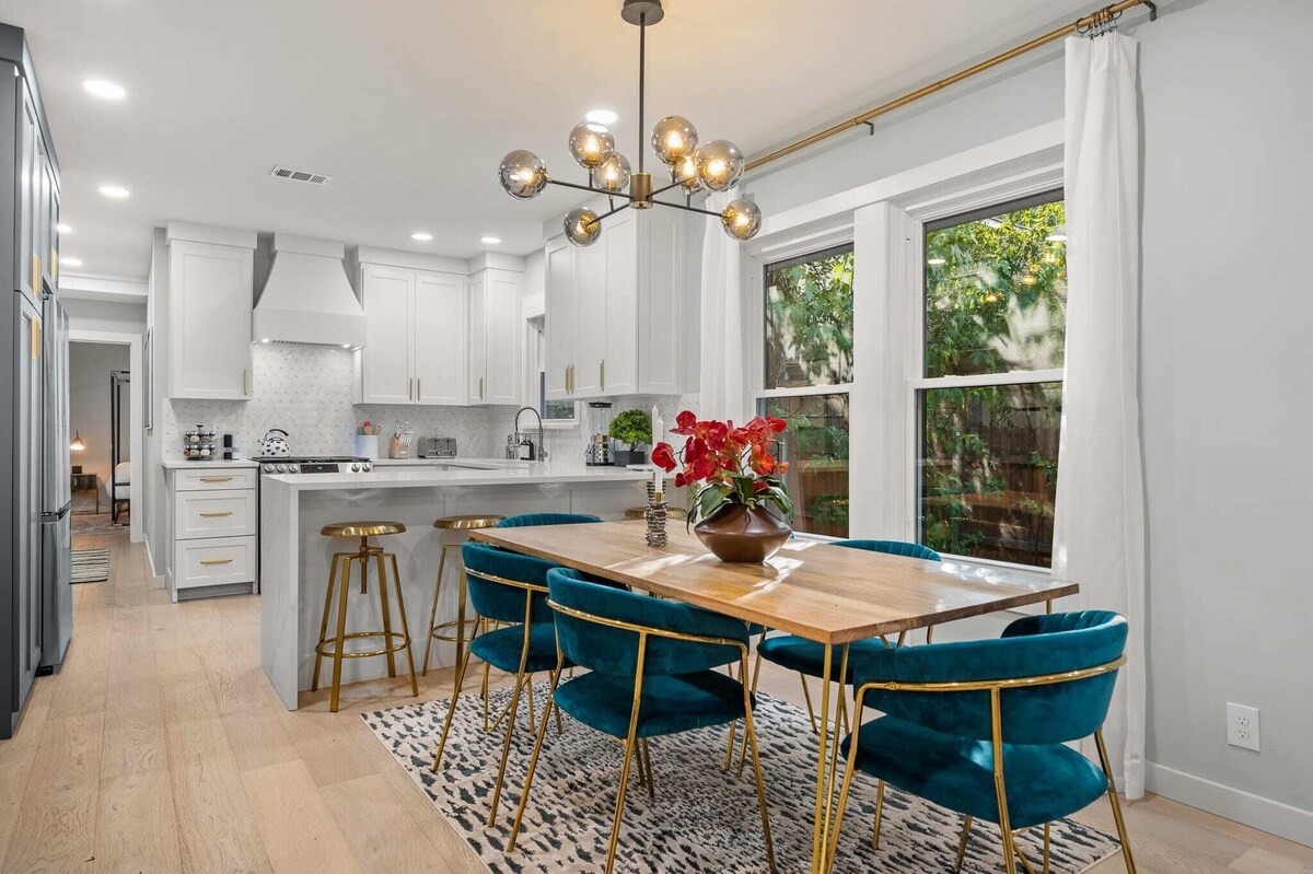 Summary: Guests will experience first-class accommodations at this stunning newly renovated Dallas home. Located in the Medical District, close to major hospitals, American Airlines Center, Love Field Airport, Market Hall, Uptown, Oaklawn, and Dallas night life. The property features 3 bedrooms and 2 bathrooms in the main house + versatile 4th bedroom, bathroom, and living space in the guest house. Plenty of room to sleep 10 guests. Outdoor hot tub, fire pit, and lots of backyard space for everyone! The Space: Welcome to our sophisticated Dallas bungalow remodeled in 2022! Step inside to the modern living space which has a desirable open concept perfect for large groups allowing great entertainment and flow between the kitchen and living room. The living room has a fireplace (non-operable), mounted TV, and ample seating. Plenty of room for families and holiday gatherings. The gourmet kitchen is a chef's dream with beautiful quartz counters, stainless steel appliances, fully stocked cookware, dinnerware, serving-ware, coffee bar, cocktail shaker set, and kitchen appliances. Abundant counter space for ideal catering and serving to guests. Find a seat at the breakfast bar or large dining table! ***Complimentary regular and decaf coffee, creamer, sweetener, tea, condiments, a variety of cooking spices, salt, pepper, cooking spray, and cooking oil. There are 3 bedrooms in the main house and an additional versatile 4th bedroom/living space in guest cottage. Bedroom 1 (sleeps 2) has picturesque views of the back yard. A beautiful king-size canopy bed, large dresser, black out curtains, large mounted TV, and highly rated memory foam mattress and sheets await you. Spa-like ensuite bathroom and closet attached. Bedroom 2 (sleeps 2) overlooks the backyard and has a king size bed suitable for up to two guests, highly rated memory foam mattress, dresser, mounted TV, plus plenty of room for storage. Bedroom 3 (sleeps 4) has 2 full size beds, highly rated memory foam mattress, mounted TV, closet, and cozy desk/workstation. Bedroom 4/Guest Cottage (sleeps 2) features a queen size bed, highly rated memory foam mattress, mounted TV, reclining chair, kitchenette with sink, mini fridge, microwave, bistro table and chairs, coffee maker, dining ware, full bathroom with sink and shower. Bathroom 1: Ensuite bathroom off bedroom 1 with rain head shower system and double sinks. Bathroom 2: Located off the hallway between bedrooms 2 and 3. It has a combo bathtub/shower and rain shower head. Bathroom 3: Located in guest cottage and has stand up shower with rain shower system, sprayers, and single basin sink, full length mirrors with attached closet. ***complimentary shampoo, conditioner, and body wash included. The backyard retreat features a HUGE covered patio perfect for entertaining, comfortable lounge seating, dining table and chairs, hot tub with lights and waterfall, outdoor ceiling fans and string lights. Enjoy watching your favorite movies, shows, and sports games outdoors on the large 65” mounted TV. Stay in and cook with an outdoor gas BBQ grill (propane tank included). Beautiful mature treed yard with lush landscaping provides a tranquil atmosphere for relaxing in the big city. Plenty of backyard games including cornhole and bocce ball. All 6 large screen Smart TV’s have Roku, Hulu, Netflix, HBO Max, etc. There is also cable access to many stations. Guest Access: Access code and check-in instructions will be provided 1-day prior to check-in. The Neighborhood: The Hansel is located in a quiet neighborhood great for taking daily walks or a bike ride. Getting Around: The Hansel is centered in the Medial District, close to major hospitals such as Parkland, Scottish Rite, UT Southwestern Medical Center, American Airlines Center, Airports, Market Hall, Uptown, Oaklawn, and Dallas night life. Other Things to Note: Friendly pups are welcome but must be approved first (2 pet max). Please reach out if booking with pets. There is a $50 fee per pet charged separate. Our sister property, The Gretel, is located on the same street. Please reach out if you would like more info on booking the two properties together or our other surrounding properties! Our prices include all fees. No hidden fees.