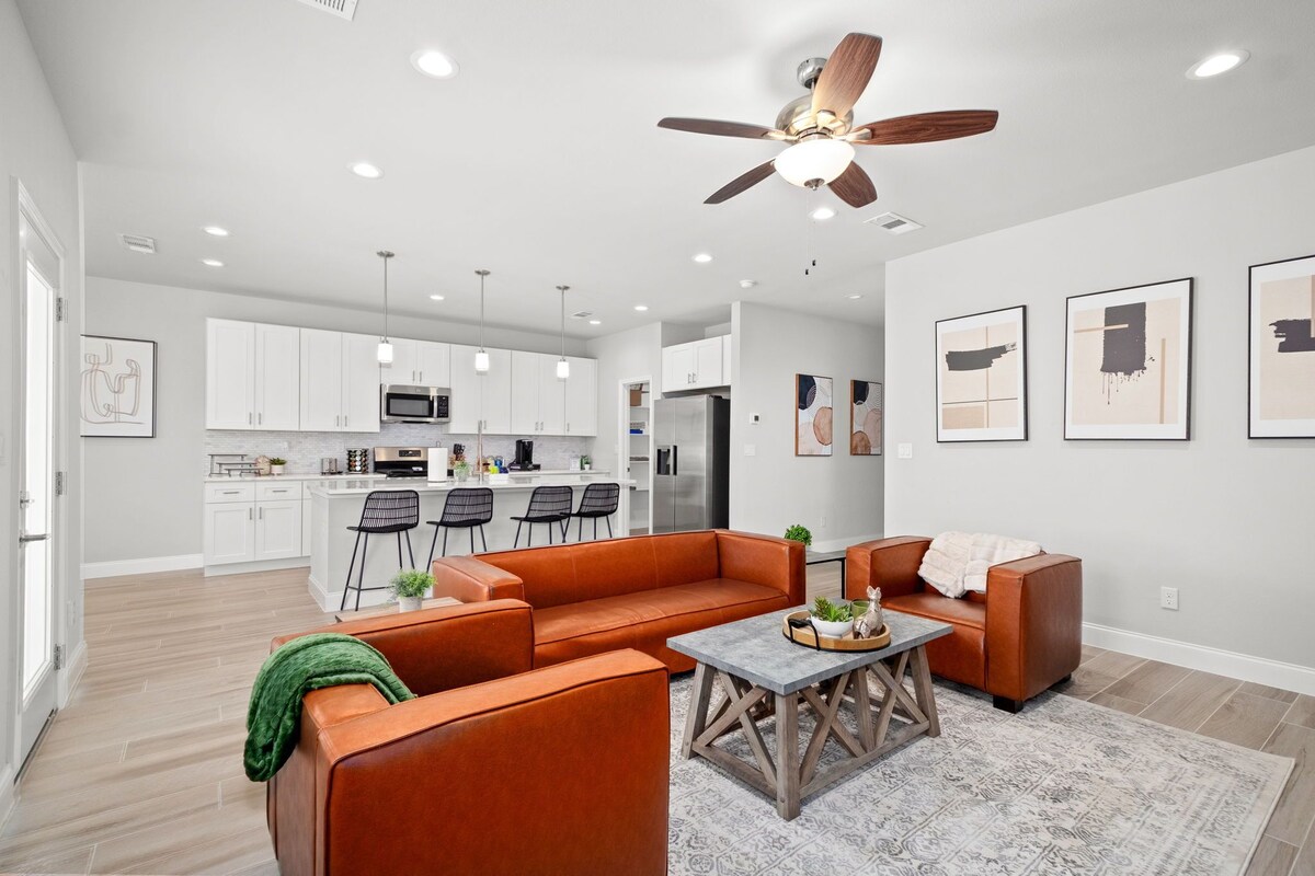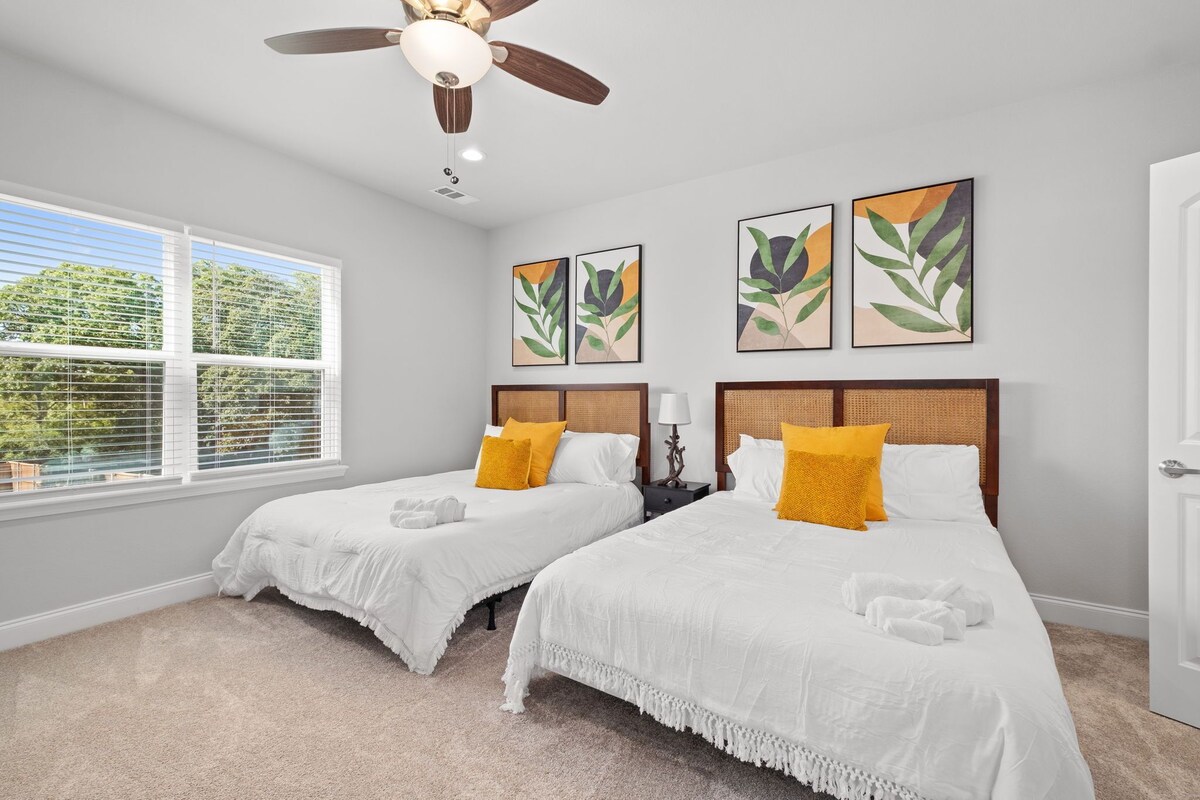Spacious, central, modern and newly built, this 5 BR getaway features 8 beds to accommodate all your guests comfortably! Located only a few minutes away from some of the best entertainment in Dallas, check out the nearby Dallas Zoo or take a short 10 min drive to Downtown to experience all the city has to offer! If you feel like staying in, take advantage of the upstairs game room featuring a ping pong table! This home away from home provides everything you need to vacation in style & comfort! Featuring 5 BR's and 8 beds, this 2,877 sqft home has plenty of space to accommodate your next getaway! As you enter this beautiful and newly built home, you're greeted with warm natural light that comes in through all of the windows! The living room features luxurious and comfortable leather sofas to sit on while you enjoy watching your favorite shows on the 75\ t limit any at-home chef! Take advantage of the full size gas burner stove top and cook up your favorite meals using the provided kitchen utensils! Also included is a toaster, blender, and microwave giving you everything you could need while on your vacation! The kitchen also features basic seasonings, oils, and dishware for your convenience. Take advantage of the provided coffee station and start your day off right with a cup of joe! The oversized kitchen island provides plenty of cooking space to prepare a big feast! Serve up your creative cooking creations on the spacious wood dining table that seats 6 comfortably or on the oversized kitchen island that seats 4! Located downstairs is the first private BR that has an oh so comfortable queen bed for you to get a great nights rest on! Right down the hall is the convenient half bathroom, great to start your day in before hitting the city! As you make your way upstairs, you are greeted with the designated workspace for those who like to get work done while on the go! If you ll find it in the upstairs game room with a smart TV and ping pong table! The second BR features two luxurious queen beds where you can watch TV from the comfort of your mattress! This BR also includes an attached spacious bathroom with double sinks, a walk-in shower, and a separate bath tub! Pamper yourself in style! The third BR has an full bed as well as a twin bed to accommodate multiple guests. After a long day of exploring the city, unwind while watching your favorite shows on the provided TV! The fourth BR features the same layout with a full bed, twin bed, and smart TV! The shared jack and jill style bathroom is convenient for multiple people to get ready at once! The fifth BR is private and includes a king bed and TV, as well as a private bathroom! Take advantage of all our bedroom space and make this home your next getaway spot! Featuring a spacious backyard, grab a picnic blanket and soak in the sun! Perfect for your furbabies and kids! Relax on the patio furniture while you enjoy the outdoors! This home has a two car garage and a four car driveway, additional parking can be found on the curb. Please DO NOT block the neighbor ,