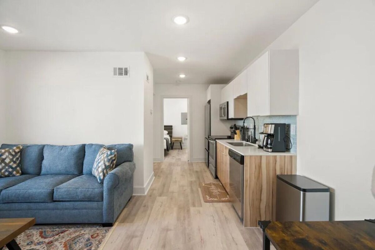 This lovely Old East Dallas apt, is the perfect place to relax and unwind. Enjoy the privacy of a top floor corner unit with all the comforts of home. Sink into the plush sofa and watch your favorite shows on the flat-screen TV. The fully stocked kitchen has all the appliances you need to cook up a delicious meal. Indulge in a refreshing rain shower in the stylish bathroom. This space has everything you need for a comfortable stay in Dallas. Book now for an unforgettable experience! Livingroom: This inviting Livingroom is the perfect place to relax and unwind after a long day exploring Dallas. Sink into the plush sofa and watch your favorite shows on the flat-screen TV. The sofa is a sleeper sofa, so 2 people can sleep on it. Kitchen: The fully stocked kitchen has all the appliances you need to cook up a delicious meal. The kitchen table provides a comfortable space to enjoy your meals. Bathroom: Indulge in a refreshing rain shower in the stylish bathroom. The bathroom is equipped with all the essentials to make your stay as comfortable as possible. Bedroom: The cozy bedroom is the perfect place to rest and recharge for the next day of adventure. The comfortable queen bed will ensure you have a good night's sleep. Our prices include all fees. No hidden fees.