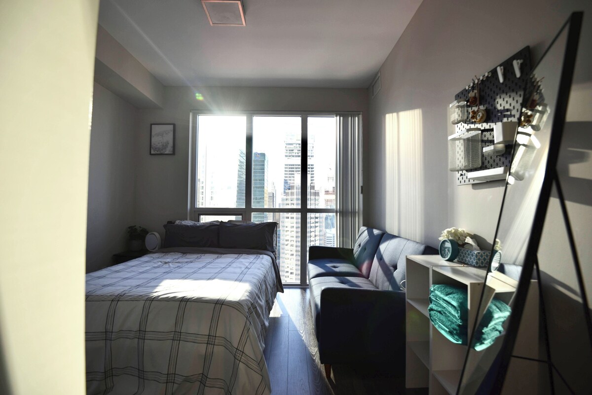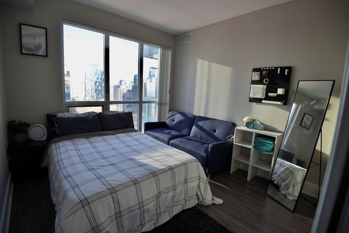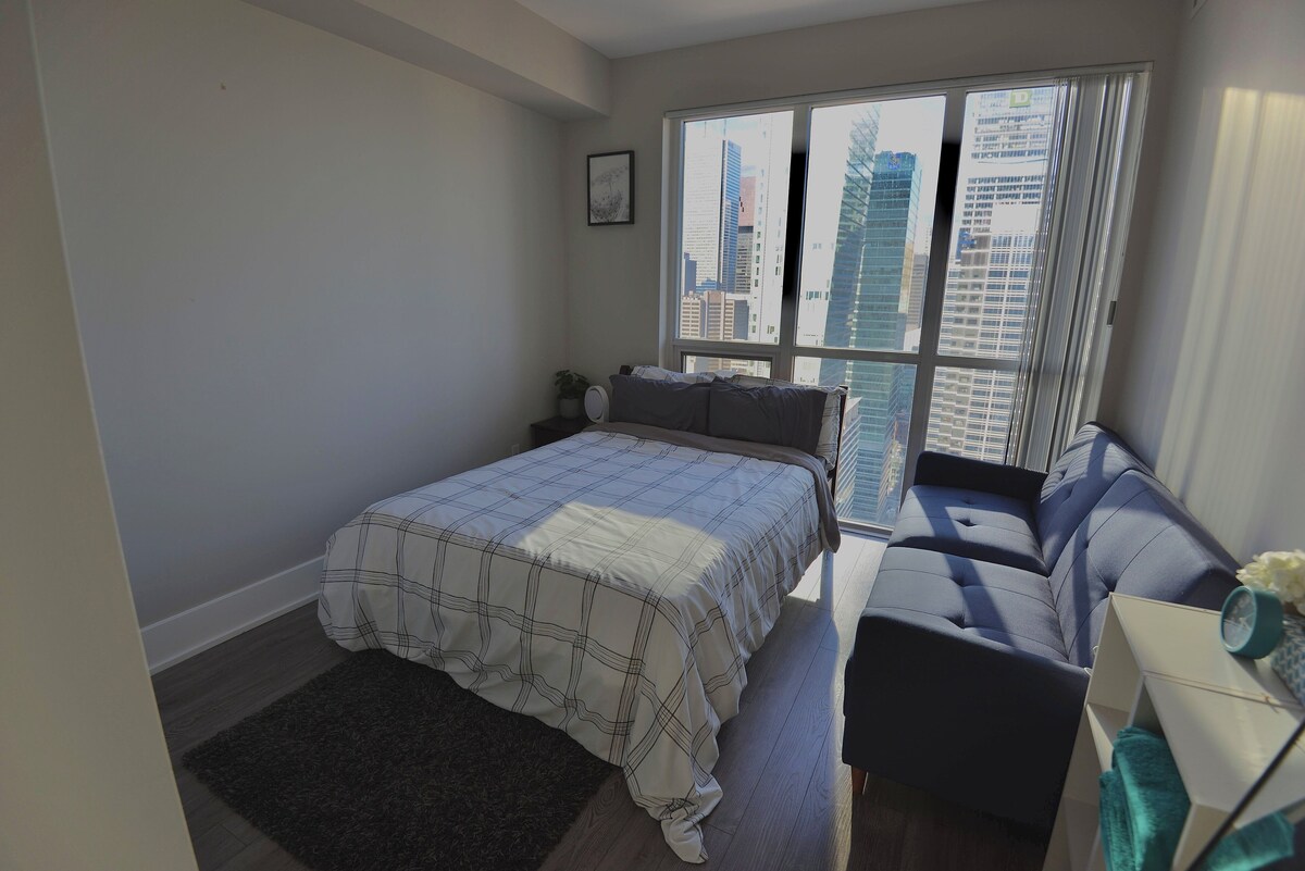 Welcome to Toronto! This condo is a Modern, luxurious 2-bedroom, 2 Washroom (1 Free Parking) centrally located within a 10 minute walk from Union Station, Harbourfront, Roger’s Centre, Ripley’s Aquarium, Financial District, Entertainment District, and all tourist attractions! You’ll have endless options when it comes to fine dining, shopping, and nightlife - with a beautiful view overlooking the CN tower right from the balcony. Perfect for couples, families and those in town for business. The space - Approximately 790 square feet of space. - High speed internet access. - Shared building amenities including an Outdoor Rooftop pool, Gym, Cabanas/Lounge Chairs, and BBQ. - Private balcony with views of the CN tower, lake and city. - Sleeps a maximum of 6 guests comfortably: 1 Master Bedroom with ensuite bathroom, 2nd bedroom with two twin beds, and Living Area converts into an additional bed. - Washer and dryer available in unit with laundry detergent and softener. - Fully equipped kitchen with high-end appliances including a fridge, freezer, stove, microwave, dishwasher and oven. Stocked with cooking essentials, cutlery and plates/bowls/cups. - Fully stocked coffee/tea bar with Nespresso (+pods), Drip coffee machines, Hot water kettle, Brita water filter, ground coffee and tea. - Lined with hotel quality sheets and duvets/pillows for beds with enough towels. Guest access - You will have access to the entire unit as well as building amenities. Please make yourself at home! - There is 1 parking spot available upon request. - Please note that access to mailbox or mailbox key to retrieve packages will not be available for short-term stays less than 3 months. Other things to note - Building management will require us to send the Primary guest’s photo ID for registration. Upon arrival, guests are required to show the same ID to the front desk for verification before keys can be provided. - Bag drop-off is not available however we recommend guests who are arriving early or have a late flight to drop your bags off at the Intercontinental Hotel (225 Front St W - $5CAD/bag), which is steps away from Union station and 5 minute walk from the Airbnb. -Check in is 4pm or later, and check out is 11am. Extra charges will apply outside of these hours. Please let me know at the time of booking should this apply. Registration number STR-2405-FKXKVP Our prices include all fees. No hidden fees.