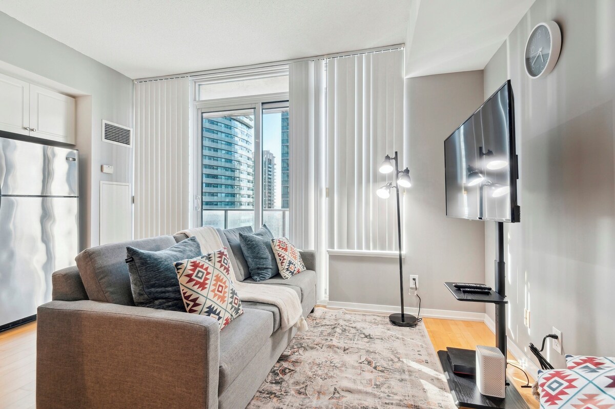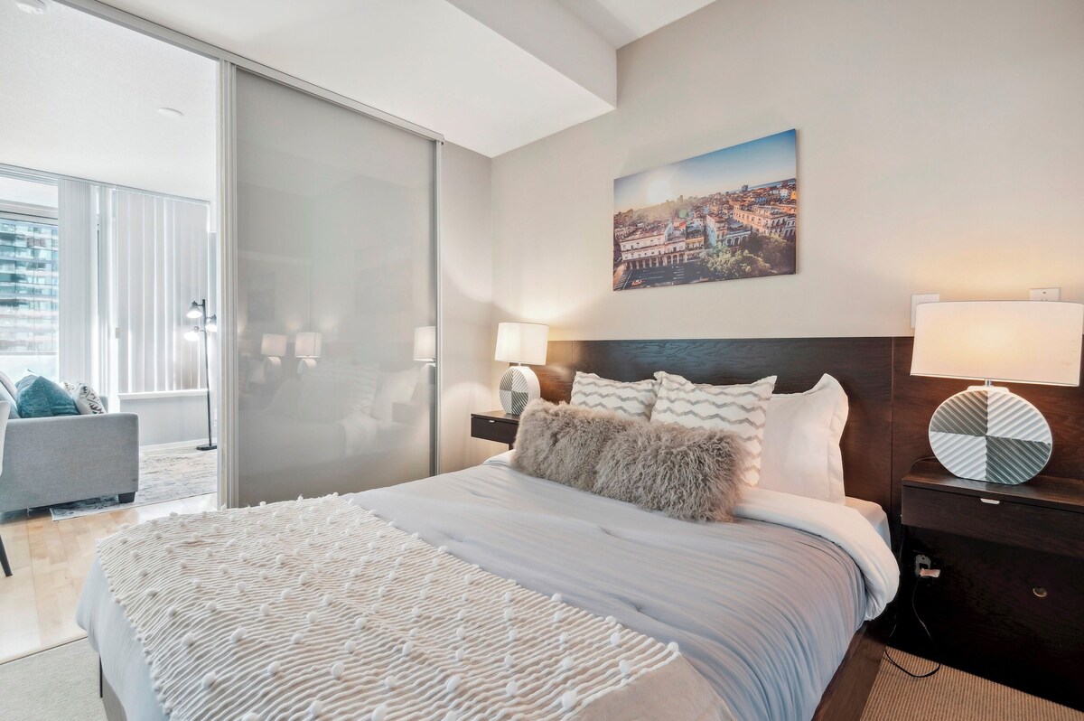 Guests will enjoy close walking proximity to the Finacial district and the Toronto Waterfront with Union Station, Scotia Bank Arena and Rogers Centre a stone's throw away. At this property, we offer various spaces, each meticulously crafted to provide you with a stunning accommodation experience. Although our style remains uniform throughout, the scenery, arrangement, and design of each space may differ. FOR A SOFABED SUITE - REQUEST FOR ONE TIME FEE OF $75 The Amenities: • state of the art fitness centre • indoor hot tub • outdoor hot tub • outdoor pool • spin room • yoga room • spin room • sun deck • indoor movie theatre • BBQ deck • 24 hour security with key fob access to building • modern lobby Key Collection Process: Convenient and Secure for Every Guest At our properties, we’ve designed a key collection process that prioritizes security, consistency, and convenience for our guests. While this process may differ slightly from standard practices, it’s based on years of experience and the commitment to making your stay as seamless as possible. All keys are securely stored and retrieved through KeyCafe, located at our office at 142 Simcoe Street. Most of our suites are a short walk from the office, but for those located farther—up to a 15-minute walk or a 5-minute drive—we recommend scheduling an Uber with two stops. The stop at KeyCafe is quick, taking less than a minute, ensuring minimal disruption to your journey. Why do we use KeyCafe? Over the years, we’ve learned that consistent access to keys is one of the most critical factors in ensuring a smooth check-in experience. Here are a few challenges we’ve encountered with alternative methods: Keys left at concierge desks: While convenient in theory, this approach has resulted in issues such as lost keys or keys not being released if the guest’s ID didn’t perfectly match the booking. Meet-and-greet handoffs: While personal, this method has proven unreliable due to factors like delayed flights. For example, when a meet-and-greet is scheduled for 9 PM but a guest’s flight is delayed until 3 AM, it becomes impossible for staff to remain on-site for such long delays. Using KeyCafe has allowed us to eliminate these issues, ensuring 24/7 secure access to your keys. Our corporate travelers and long-term guests especially appreciate the certainty and reliability this process provides. We’re not trying to make your experience more complicated—quite the opposite. By prioritizing security and flexibility, we aim to make your stay as stress-free as possible, from check-in to check-out. We swear by this process because it works, and we’re confident you’ll appreciate the peace of mind it brings. Support from the Sky View Suites Team We’re here to make your stay as smooth as possible! If you need assistance, our dedicated support team is available 7 days a week from 9 AM to 2 AM, with on-the-ground service staff ready to assist as needed. Contact details will be provided after booking, ensuring you have direct access to help whenever you need it. Atmosphere is a perfect location for anyone who wants to experience the best of what Toronto has to offer. The Area: • less than 5 min walk to the grocery store • less than 5 min walk to Aquarium • less than 5 min walk to CN Tower • less than 5 min walk to the subway • 15 min public transit commute to Yorkville • 30+ restaurants within a 5 min walk Pets - allowed Smoking - not allowed We have a 24/7 KeyCafe located at our office, 142 Simcoe Street. All key picks ups happen there. This avoids a stressful delayed flight and not having to worry for the person you are meeting to leave because of the delayed flight. This also avoids a concierge desk losing your keys or not releasing your keys. Simple enter a stop to this location before your main location. All of our suites are never more than a 5 min drive to where you are staying. The street where our office is located is not busy and the office is a ground level storefront. This means that you can easily pull over in front of it, grab your keys and be on your way! We serve hundreds of corporate clients who really love the convenience and security of our KeyCafe. You also have access to our team in case you have trouble getting your keys. As a professional business, we have supports in place to make your stay feel supported and trouble-free. When you confirm your booking, we will give you the phone number and email address to connect directly with our helpdesk. With staff available for questions 7 days a week 9am to 2am, you will feel supported during your stay. We have a 24/7 KeyCafe located at our office, 142 Simcoe Street. All key picks ups happen there. This avoids a stressful delayed flight and not having to worry for the person you are meeting to leave because of the delayed flight. This also avoids a concierge desk losing your keys or not releasing your keys. Simple enter a stop to this location before your main location. All of our suites are never more than a 5 min drive to where you are staying. The street where our office is located is not busy and the office is a ground level storefront. This means that you can easily pull over in front of it, grab your keys and be on your way! We serve hundreds of corporate clients who really love the convenience and security of our KeyCafe. You also have access to our team in case you have trouble getting your keys. As a professional business, we have supports in place to make your stay feel supported and trouble-free. When you confirm your booking, we will give you the phone number and email address to connect directly with our helpdesk. With staff available for questions 7 days a week 9am to 2am, you will feel supported during your stay. Our prices include all fees. No hidden fees.