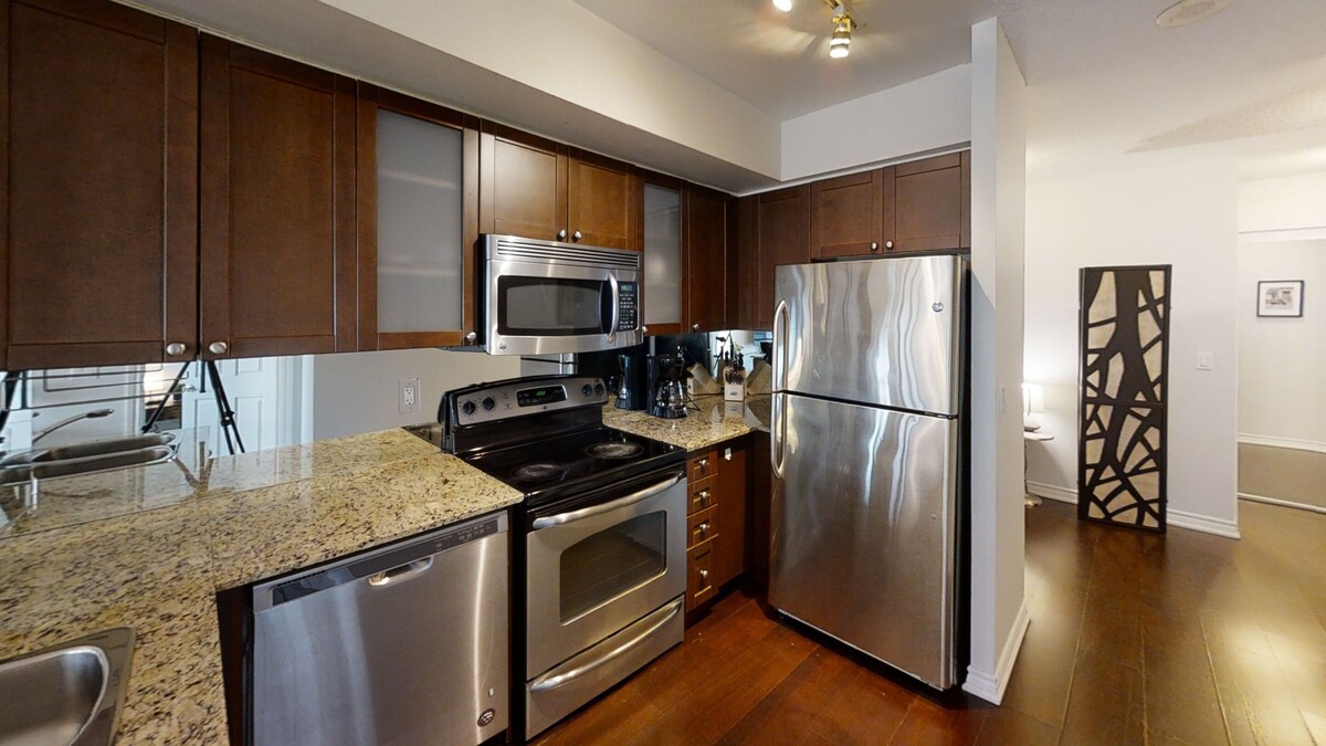 Located on Toronto’s Bay St, guests have direct access to theatres, restaurants, shopping, and essentials such as grocery and drug stores. This area also permits easy access to Toronto’s financial, entertainment and hospital districts. At this property, we offer various spaces, each meticulously crafted to provide you with a stunning accommodation experience. Although our style remains uniform throughout, the scenery, arrangement, and design of each space may differ. All of our two bedrooms suites at this location contain the following: – Fully Equipped Kitchen – En-suite washer and dryer – Queen Sized Bed – 2 Bedroom, 1 Bathroom – Flat Screen TV ( Smart TV) – Air Conditioning – VIP Cable Included – Unlimited High Speed Internet – Direct access to our helpdesk team monitoring requests 7 days a week, 9am to 2am The Amenities: • state of the art fitness centre • hot tub • yoga room • indoor pool • steam room • sun deck • guest suites • work and study spaces • movie theatre • BBQ deck • 24 hour security with key fob access to building • modern lobby College Park is a perfect location for anyone who wants to experience the best of what Toronto has to offer. The Area: • less than 5 min walk to the grocery store • less than 5 min walk to all major hospitals • less than 5 min walk to the subway • 10 min walk commute to Yorkville • 30+ restaurants within a 5 min walk Pets - allowed Smoking - not allowed We have a 24/7 KeyCafe located at our office, 142 Simcoe Street. All key picks ups happen there. This avoids a stressful delayed flight and not having to worry for the person you are meeting to leave because of the delayed flight. This also avoids a concierge desk losing your keys or not releasing your keys. Simple enter a stop to this location before your main location. All of our suites are never more than a 5 min drive to where you are staying. The street where our office is located is not busy and the office is a ground level storefront. This means that you can easily pull over in front of it, grab your keys and be on your way! We serve hundreds of corporate clients who really love the convenience and security of our KeyCafe. You also have access to our team in case you have trouble getting your keys. As a professional business, we have supports in place to make your stay feel supported and trouble-free. When you confirm your booking, we will give you the phone number and email address to connect directly with our helpdesk. With staff available for questions 7 days a week 9am to 2am, you will feel supported during your stay. We have a 24/7 KeyCafe located at our office, 142 Simcoe Street. All key picks ups happen there. This avoids a stressful delayed flight and not having to worry for the person you are meeting to leave because of the delayed flight. This also avoids a concierge desk losing your keys or not releasing your keys. Simple enter a stop to this location before your main location. All of our suites are never more than a 5 min drive to where you are staying. The street where our office is located is not busy and the office is a ground level storefront. This means that you can easily pull over in front of it, grab your keys and be on your way! We serve hundreds of corporate clients who really love the convenience and security of our KeyCafe. You also have access to our team in case you have trouble getting your keys. As a professional business, we have supports in place to make your stay feel supported and trouble-free. When you confirm your booking, we will give you the phone number and email address to connect directly with our helpdesk. With staff available for questions 7 days a week 9am to 2am, you will feel supported during your stay. Our prices include all fees. No hidden fees.