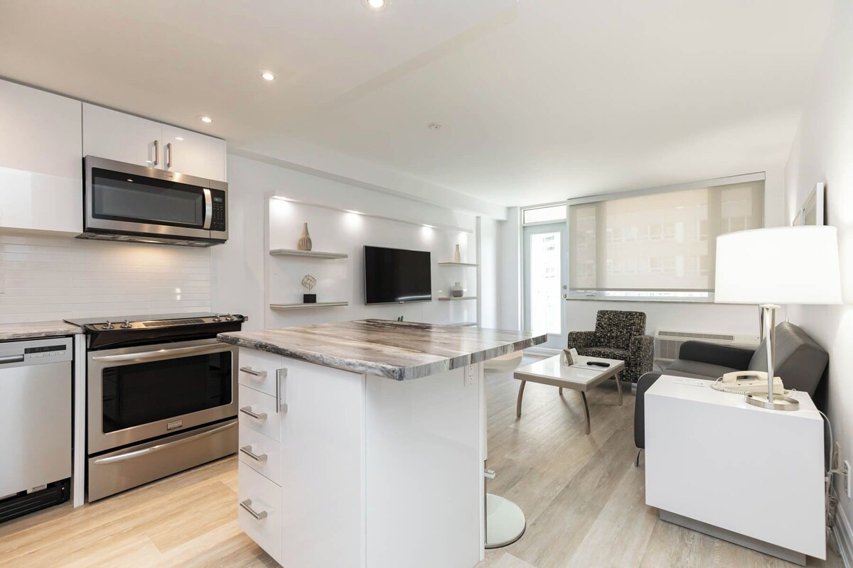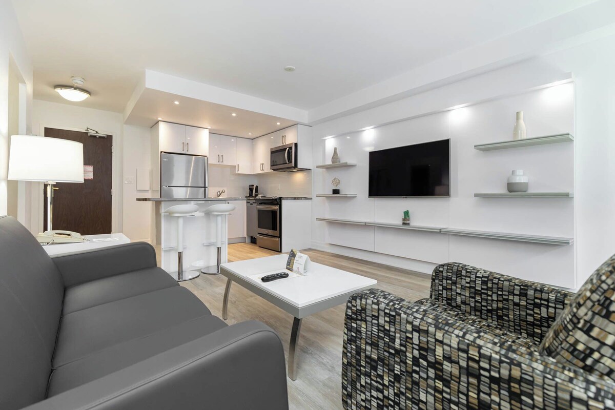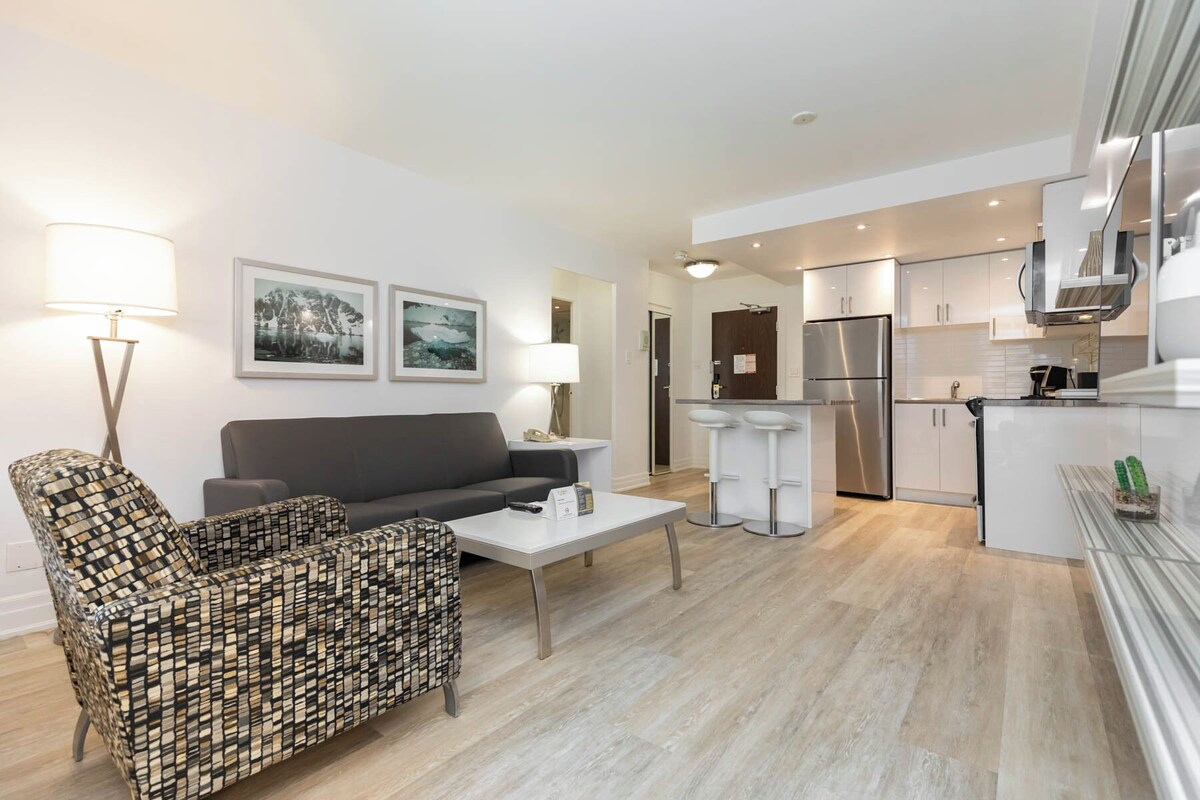 Discover your urban retreat in this spacious 500-square-foot room in downtown Toronto, just a short walk from Yorkville. This suite features a king size bed, fully equipped kitchen, ideal for meals, along with a separate living area filled with natural light and a cozy dining space. Enjoy the privacy of a separate bedroom and a well-appointed bathroom. This is the perfect place for extended stays, just a 5-minute walk to the Yonge-Bloor subway station—ideal for exploring the city! Experience comfortable living in our furnished suites, designed to meet your needs. Please note that sizes, furnishings, and standards may vary, with a minimum square footage of 500. Included in your stay are wireless internet, weekly housekeeping for stays of 30 days or more OR daily housekeeping for anything less than 30 days, and a telephone with local and long-distance calling across North America (excluding remote areas). Basic cable service is also provided. To confirm your reservation, you'll need to sign an Accommodations Agreement and provide a copy of your credit card (front and back) along with a valid photo ID (Canadian driver's license or passport). Please note that minimum check-in age is 21 years. We offer underground parking at a daily rate of $40.00 plus taxes or a monthly rate of $210.00 plus taxes. Our pet policy allows for one well-behaved pet, with a cleaning fee of $50.00 plus tax. Smoking is not permitted in the suite, and all utilities are included. Additional services are available for a fee, including airport transportation. Families can request cribs and playpens to ensure a comfortable stay. Guest access Guest Lounge On-site coin operated laundry facility Parking Garage (for a fee) Other things to note Images displayed represent a typical furnishing style of our suites. Please note that sizes, furnishings, and standards may differ. Floor plans can vary based on availability, with a minimum square footage of 500. - Minimum check-in age is 21-years - Underground parking available for residents and visitors (fees apply) - 24/7 on-site security - Kitchen appliances provided: Keurig coffee maker, toaster, kettle, oven, stovetop, and microwave - Complete cookware and kitchen utensils - Place settings including plates, cutlery, and more - Linens, towels, bathrobe, and hairdryer included - Iron and ironing board available - Onsite coin-operated laundry facility - In-suite smoke alarm - Smoke alarm in common areas - Controlled access to the building Our prices include all fees. No hidden fees.
