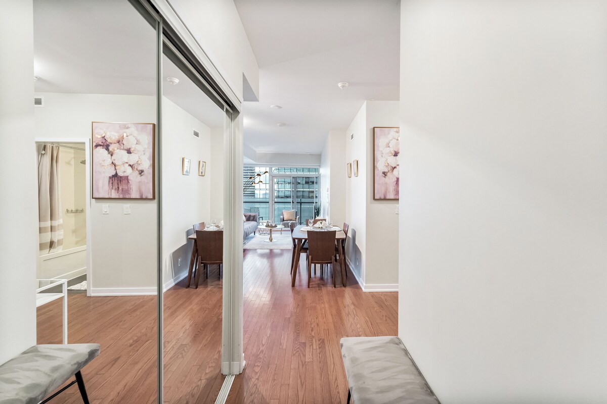 Enjoy a stylish experience at this centrally located place. Perfect for a family or an impeccable couple get away. Our building is connected to the PATH - Toronto's Downtown Pedestrian Walkway which connects to Union Subway/GO/Via Rail stations, Longo's grocery store, Scotiabank Arena with many more on PATH map directory. Full CN Tower, Scotiabank Arena & Lake views directly from our balcony. Access to the CN Tower only a 5 minute walk (300 meters). Our prices include all fees. No hidden fees.