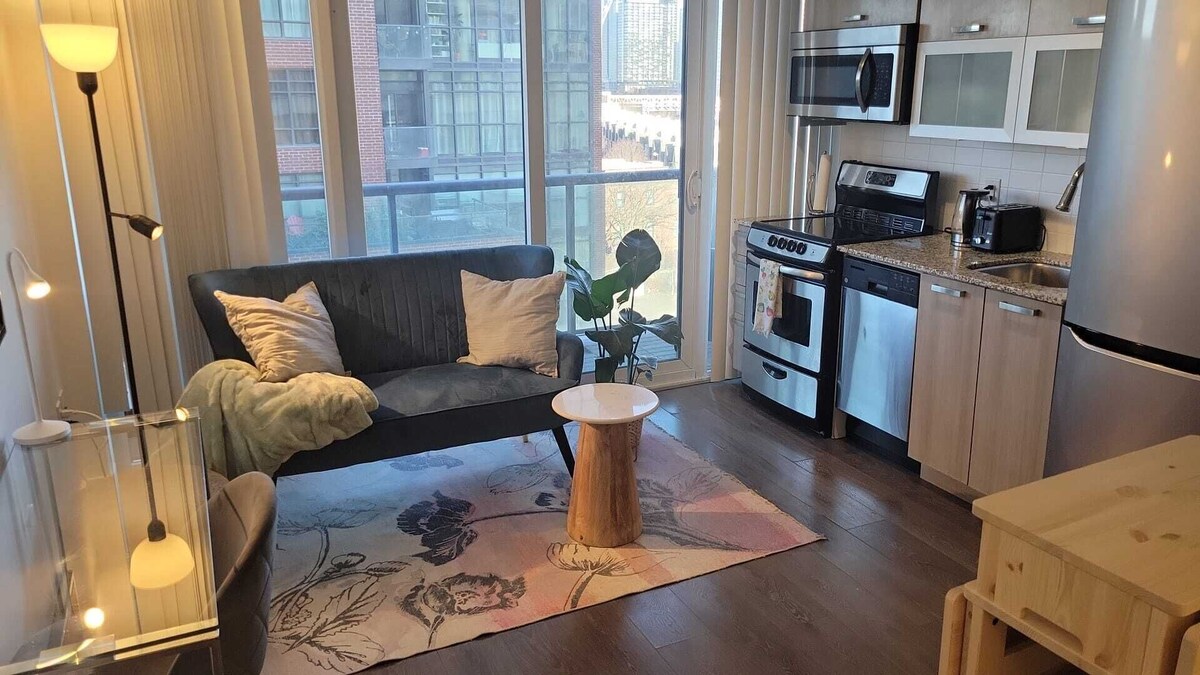 Newly Renovated Condo Just Opposite The Drake Hotel. Very Desirable Queen West Neighbourhood. Walking Distance To Some Of The Best Bars, Restaurants, Art Galleries In The City. 24 Hour Streetcar Right Outside The Front Door. Welcome To Your Furnished Junior 1 Bedroom Condo in Trendy Queen West Recently Voted The 2nd Hippest Area In The World By Vogue Magazine. - Large Balcony with Beautiful View of Lake Ontario - Modern Junior One Bedroom in a New Condo Building, at the Boundary of Three of Toronto's Coolest Neighbourhoods: Liberty Village, King West and Queen West. - Equipped with High-speed Wireless Internet and 40\ x 80\ s: Q: How much is the apartment, what is the total charge for my stay? A: The rate is calculated and displayed on this page when you enter your dates, without need to pay or give credit card info. In addition to the VRBO fee, there are no further charges, no hidden fees, no extra costs, of any kind. What you pay here on this site is all you will pay for the apartment for the nights you have booked. That m arriving early in the morning or late at night, is that ok? A: It t leave dirty dishes or glasses. If you have any further questions, do not hesitate to ask. Guest access - In-Suit Washer and Dryer - Kitchen with Stainless Steel Appliances and Granite Counter top -Amazing balcony Other things to note Whether you ,