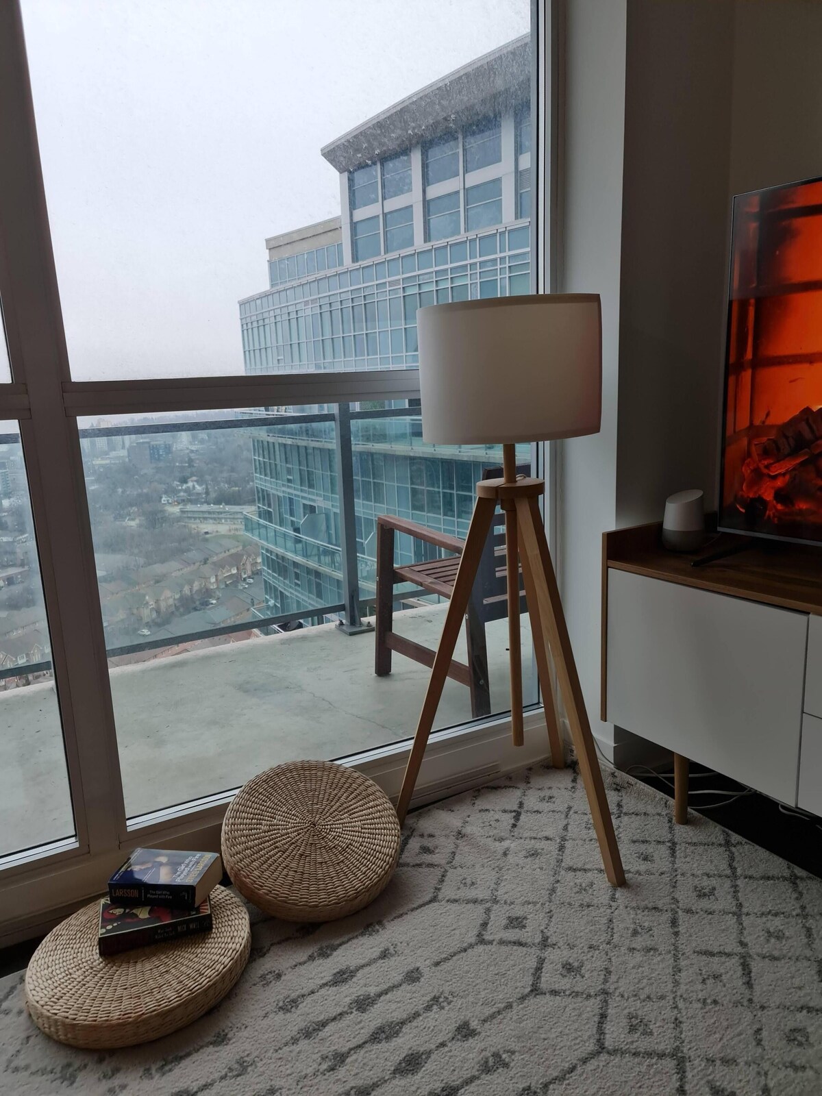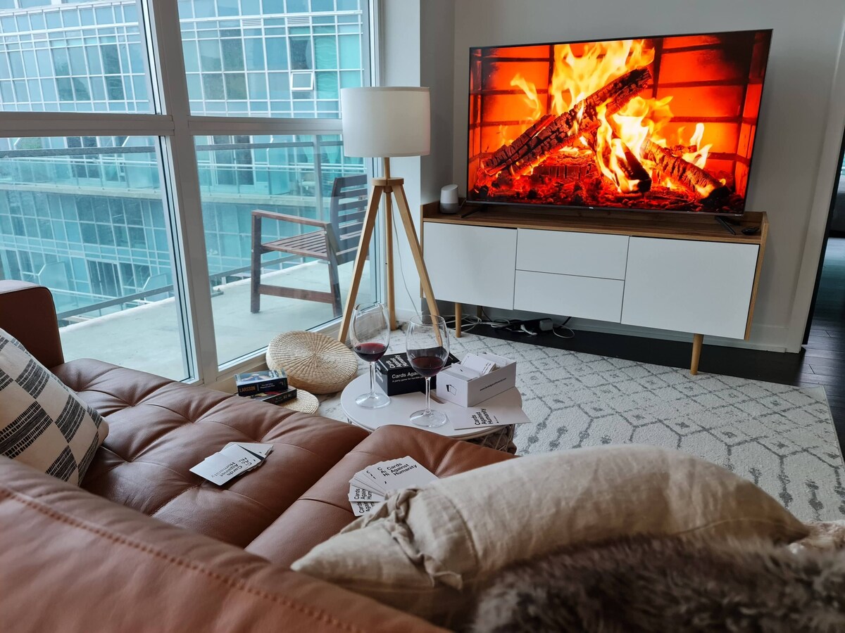 You will not be disappointed to stay in this stylish retreat located in prime location. A 15-minute drive from downtown Toronto, and a few steps away from famous Humber Bay Park, lakefront, Metro grocery store, Shoppers Drug Mart, liquor store, numerous restaurants and lakefront. Enjoy stunning views from each room, a private workspace with 2 external monitors, fully equipped kitchen, access to books and board games for cozy family nights. Large open-concept kitchen and living space with fully equipped kitchen, high speed WiFi, smart TV and a private balcony. Enjoy your daily dose of caffeine with breathtaking views and access to Nespresso, french press and a collection of teas. The living room has a stylish yet cozy sofa perfect for naps or an extra guest. The master bedroom has a queen size bed along with an ensuite washroom. The second bedroom has a twin size bed, a private workspace and tons of books and board games. Extra queen size air mattress is always made available to the guests and extra bedding can be provided at request. Our prices include all fees. No hidden fees.