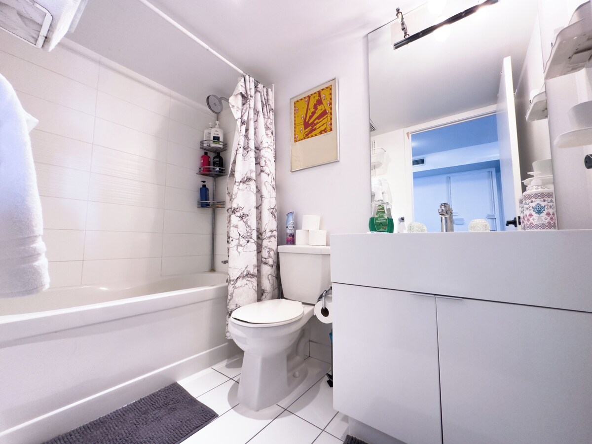 This brilliant 2-bedroom hotel suites in Downtown Toronto is perfect for your escape to the city. Our Suites are located within walking distance to CN Tower, Union Station, Rogers Centre, Ripley's Aquarium, St Lawrence market, several in demand restaurants and many other tourist destinations in the entertainment district. With 2 queen beds and a cozy living room with a sofa bed, this space offers a serene retreat for guests. Enjoy the phenomenal amenities like heating, WiFi, AC, in-suite laundry room, and access to a fitness room and a pool. The bathroom comes equipped with a hair dryer for your convenience. We think our place will help you experience everything Downtown Toronto has to offer. Our prices include all fees. No hidden fees.