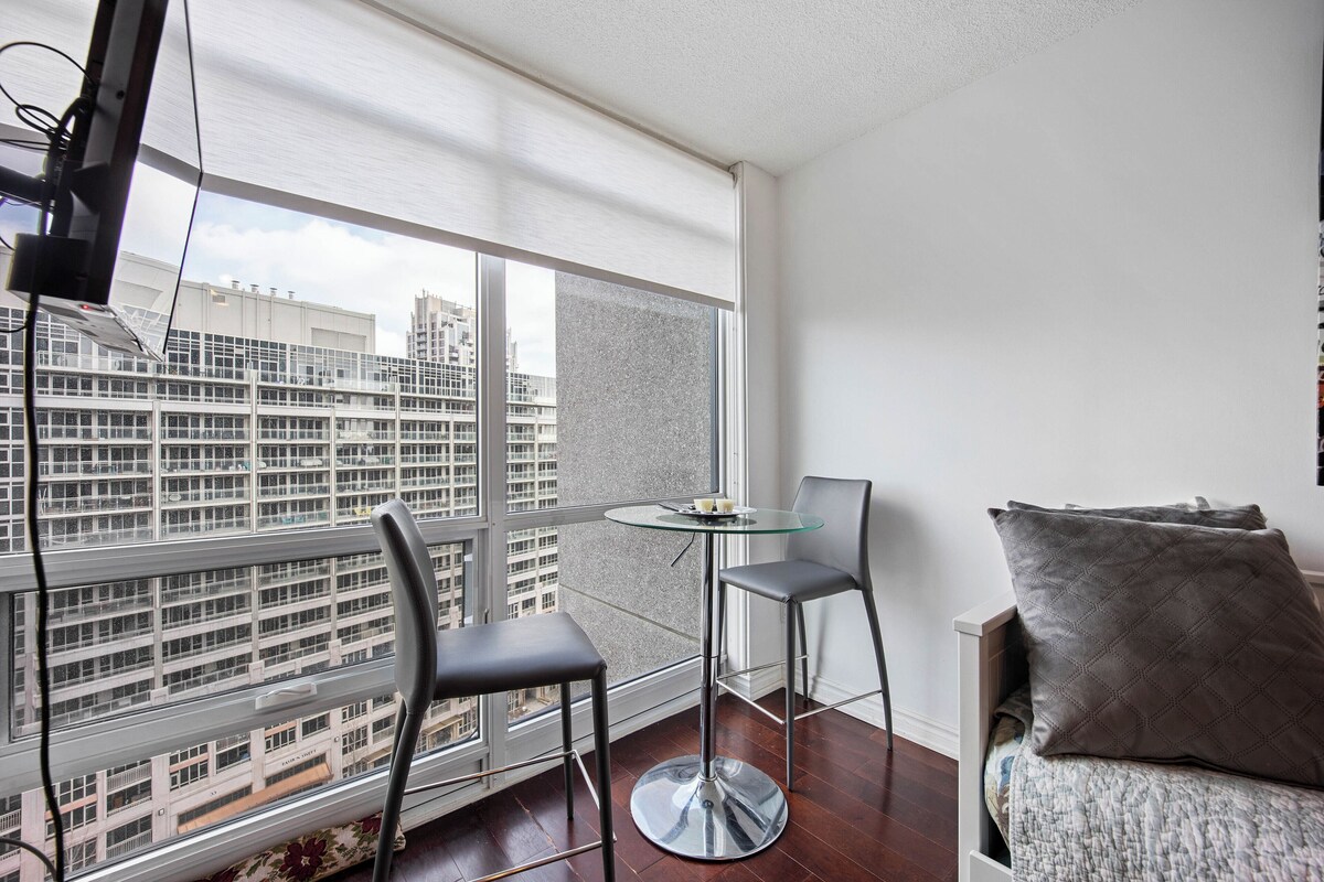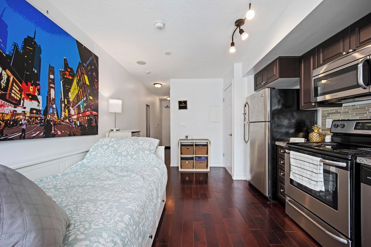 This bright studio offers CN Tower views right from your window. Step outside and you’re just minutes from the waterfront, CN Tower, Ripley’s Aquarium, Scotiabank Arena, and more. With the TTC right at your doorstep, getting around the city is easy. Loblaws and Shoppers Drug Mart are just one block away. Building Amenities Include: Fitness center, Indoor pool & jacuzzi, Rooftop deck, 24-hour concierge. Take advantage of Toronto’s waterfront trails and unbeatable convenience from this location.