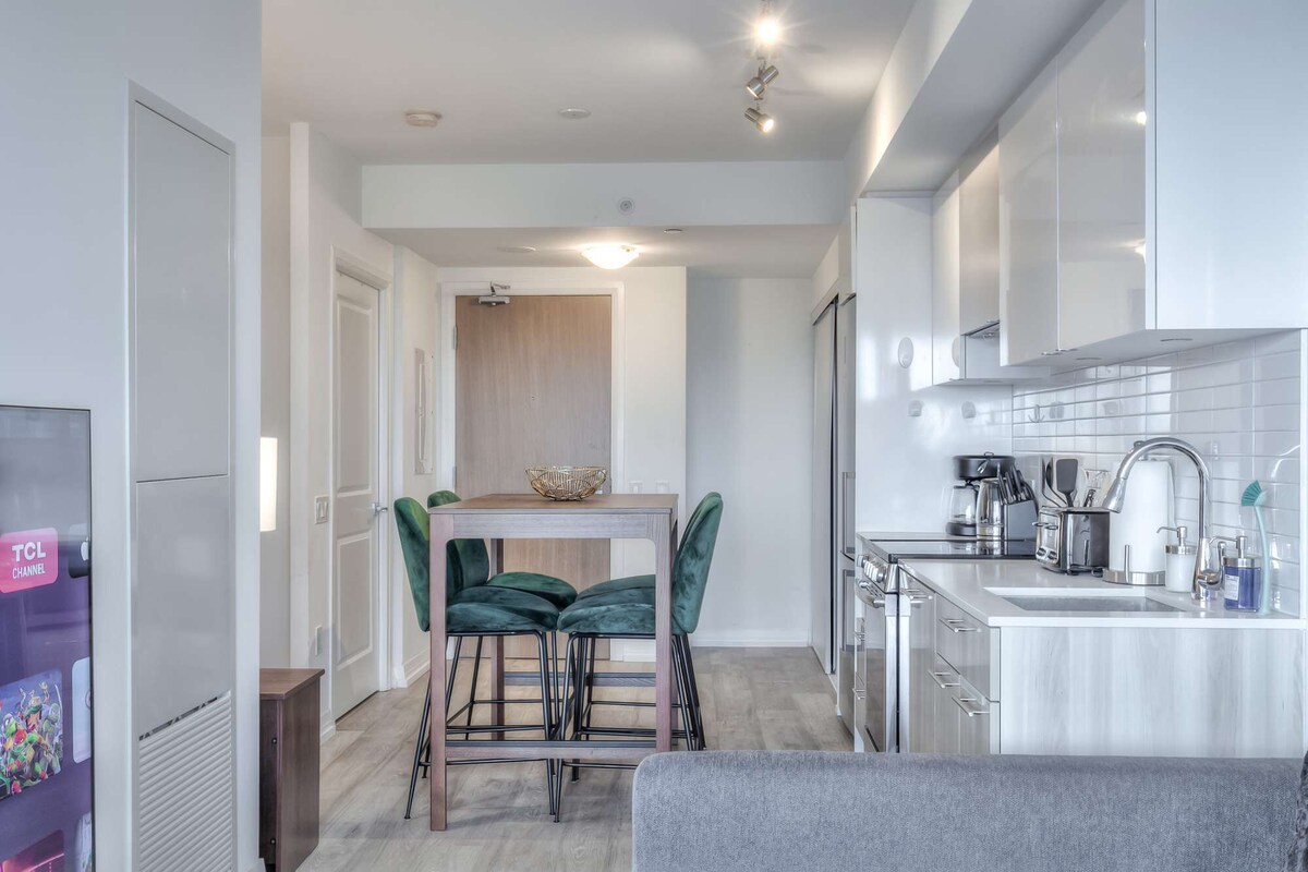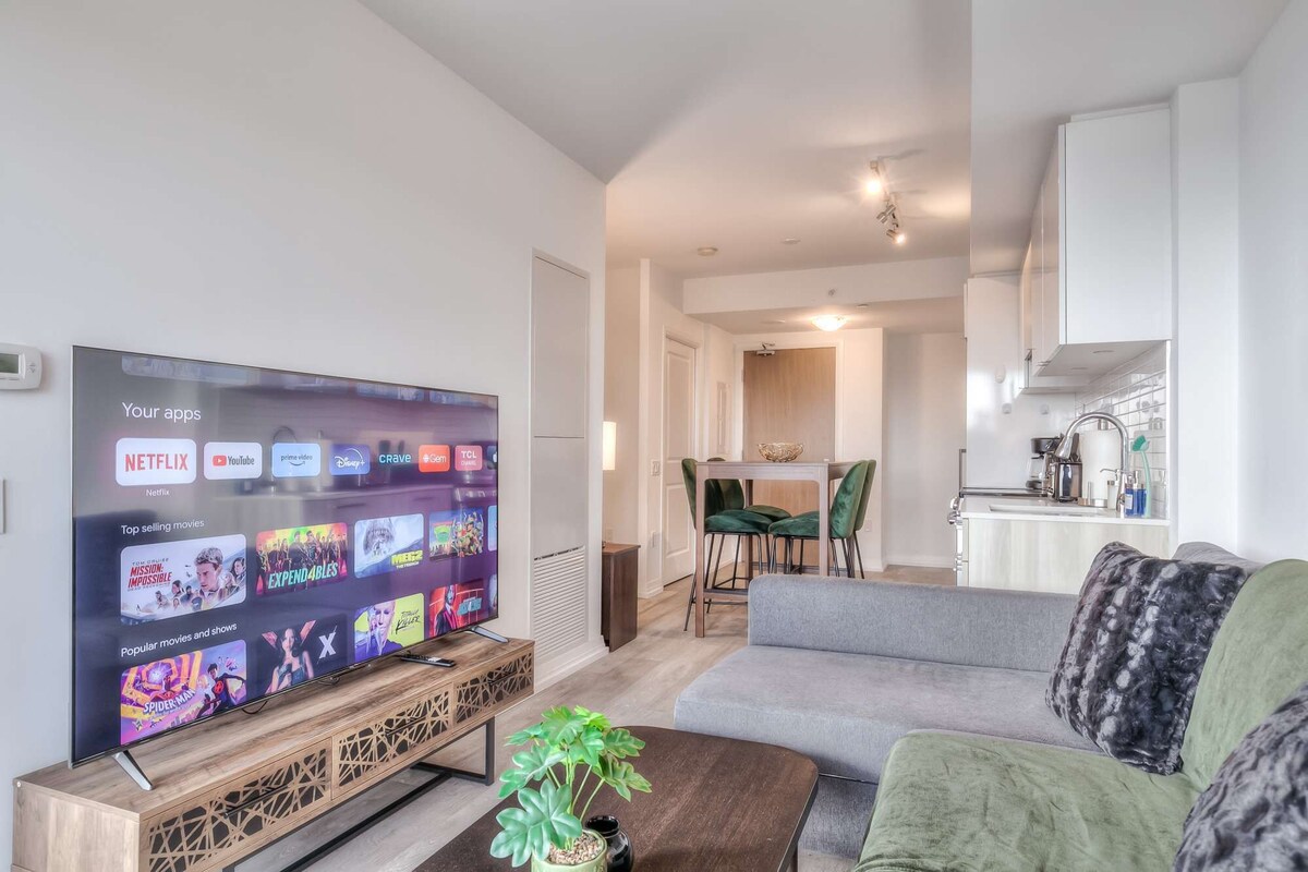 Welcome to your cozy retreat in the heart of Toronto! Our charming 1-bedroom suite is the perfect haven for solo travelers, couples, or those on a business trip seeking a comfortable and conveniently located space. The bedroom features a plush queen bed & a double bed, promising a restful night's sleep. The well-appointed living area is thoughtfully designed for relaxation, and the fully equipped kitchen allows you to prepare meals at your convenience. Our suite is not just a place to stay; it's a home-away-from-home experience. Enjoy lightning-fast GIGAbit internet with 1.5GBPS download speeds and indulge in entertainment on a dazzling 65\ ,