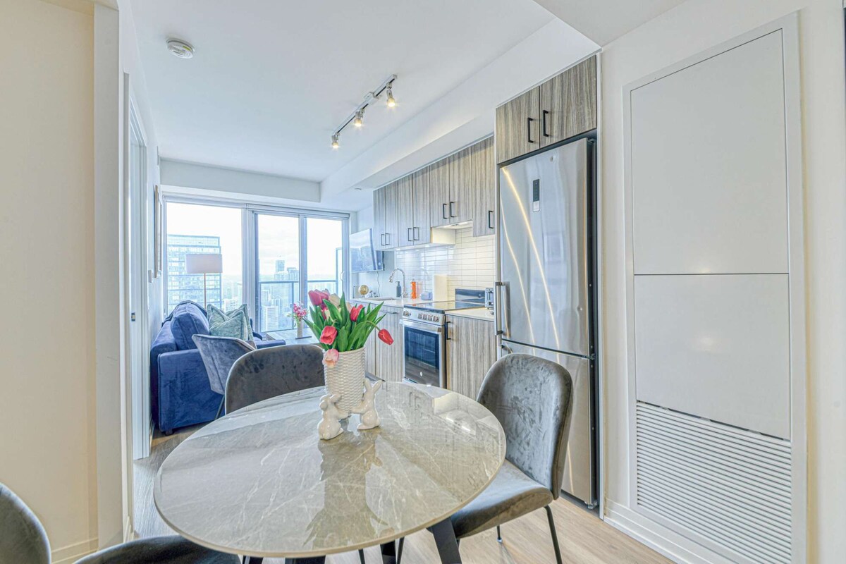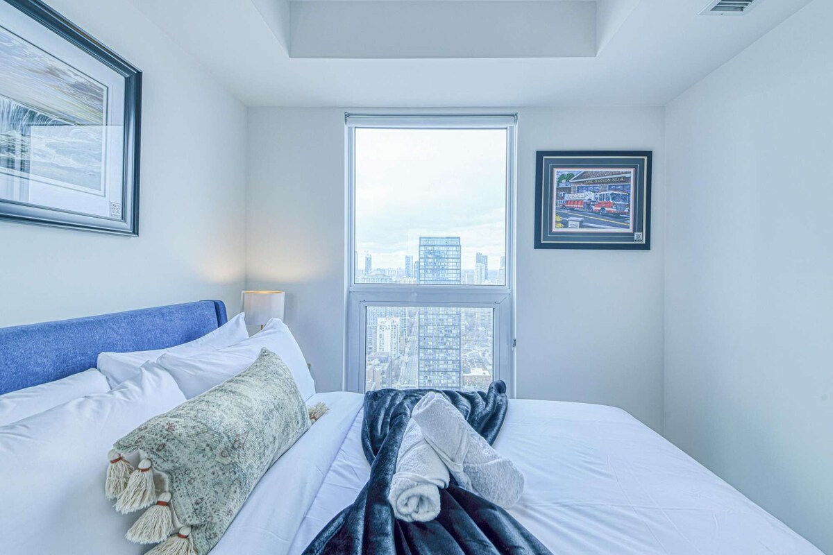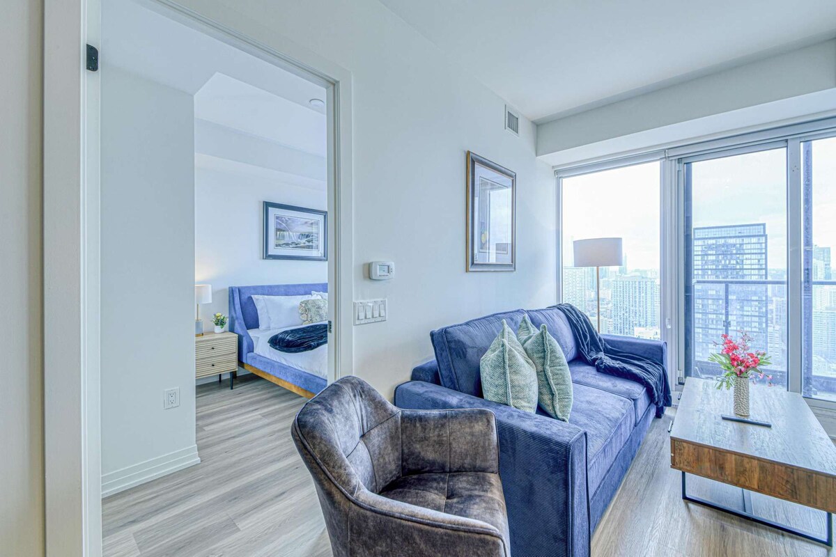 Welcome to your cozy retreat in the heart of Toronto! Our charming 1-bedroom suite is the perfect haven for solo travelers, couples, or those on a business trip seeking a comfortable and conveniently located space. The bedroom features a plush queen bed & a double bed, promising a restful night's sleep. The well-appointed living area is thoughtfully designed for relaxation, and the fully equipped kitchen allows you to prepare meals at your convenience. Our suite is not just a place to stay; it's a home-away-from-home experience. Enjoy lightning-fast GIGAbit internet with 1.5GBPS download speeds and indulge in entertainment on a dazzling 65\ ,
