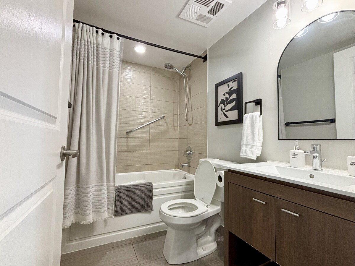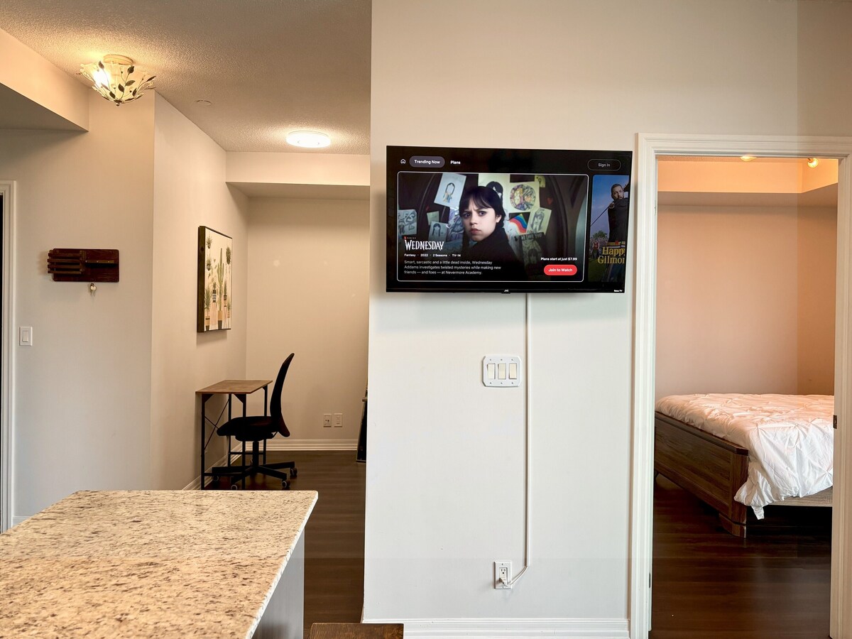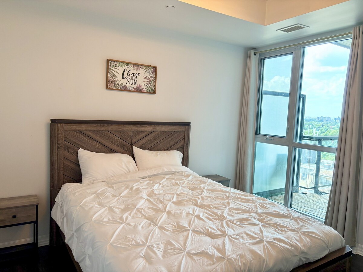Feel right at home in this cozy 1 bedroom + den condo, just 10 minutes from the airport. Whether you’re here for work or relaxation, you’ll love the bright workspace and comfy living area. Stay active with access to the building’s gym, then catch the sunset from the rooftop terrace. Perfect for solo travelers, couples, or working professionals. Dedicated parking space and wifi included. Our prices include all fees. No hidden fees.
