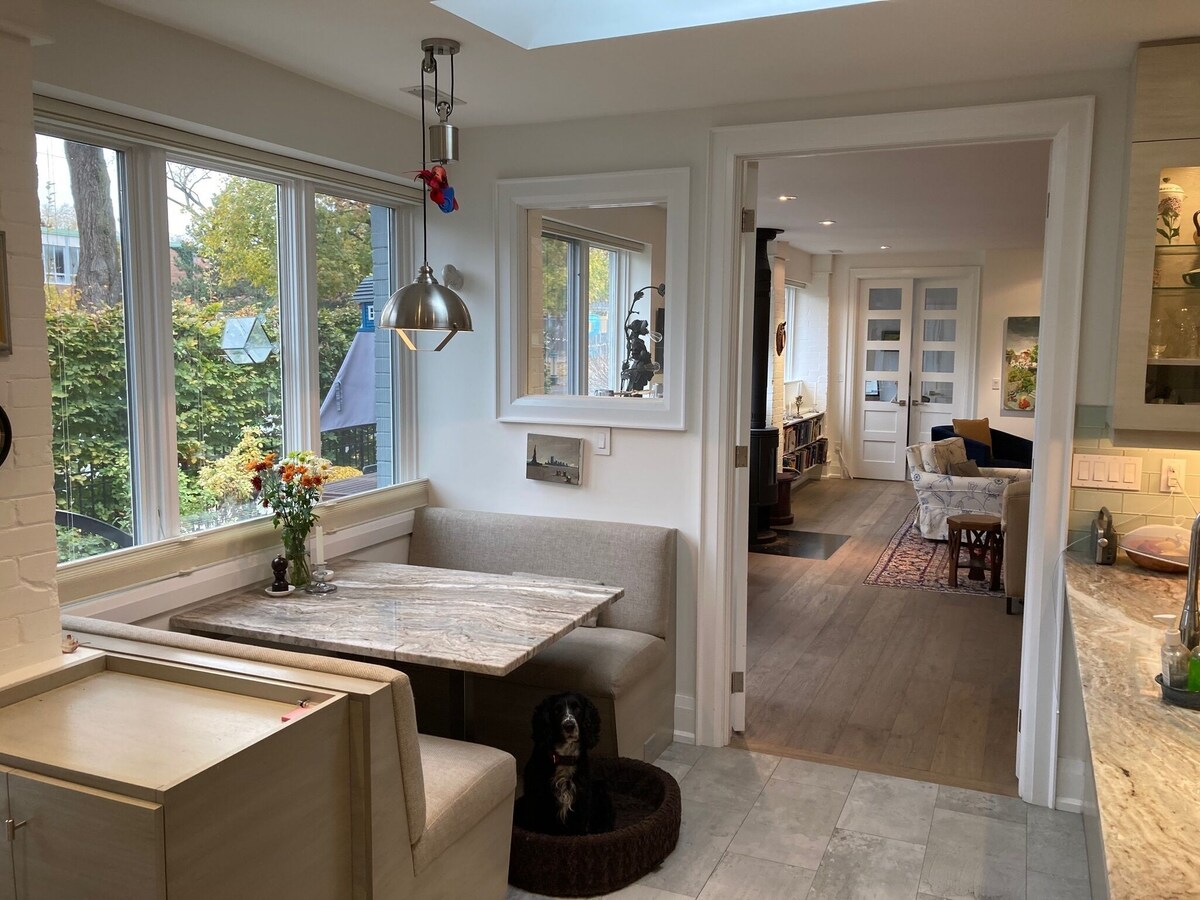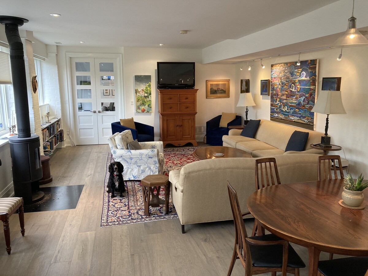 Flat entry, renovated/new, ground floor bathroom with shower, 26x17 living/dining room, small family home, effectively detached, opposite junior school so sense of space and light, available 3-4 months in winter annually when we are away. Dog/cat possible, enclosed small garden, lots of original art, quiet and peaceful and livable, two offices. Downstairs office has cot, could be single bedroom allowing disabled on ground floor. Main bedroom queen, second bedroom long double, both with wardrobes.