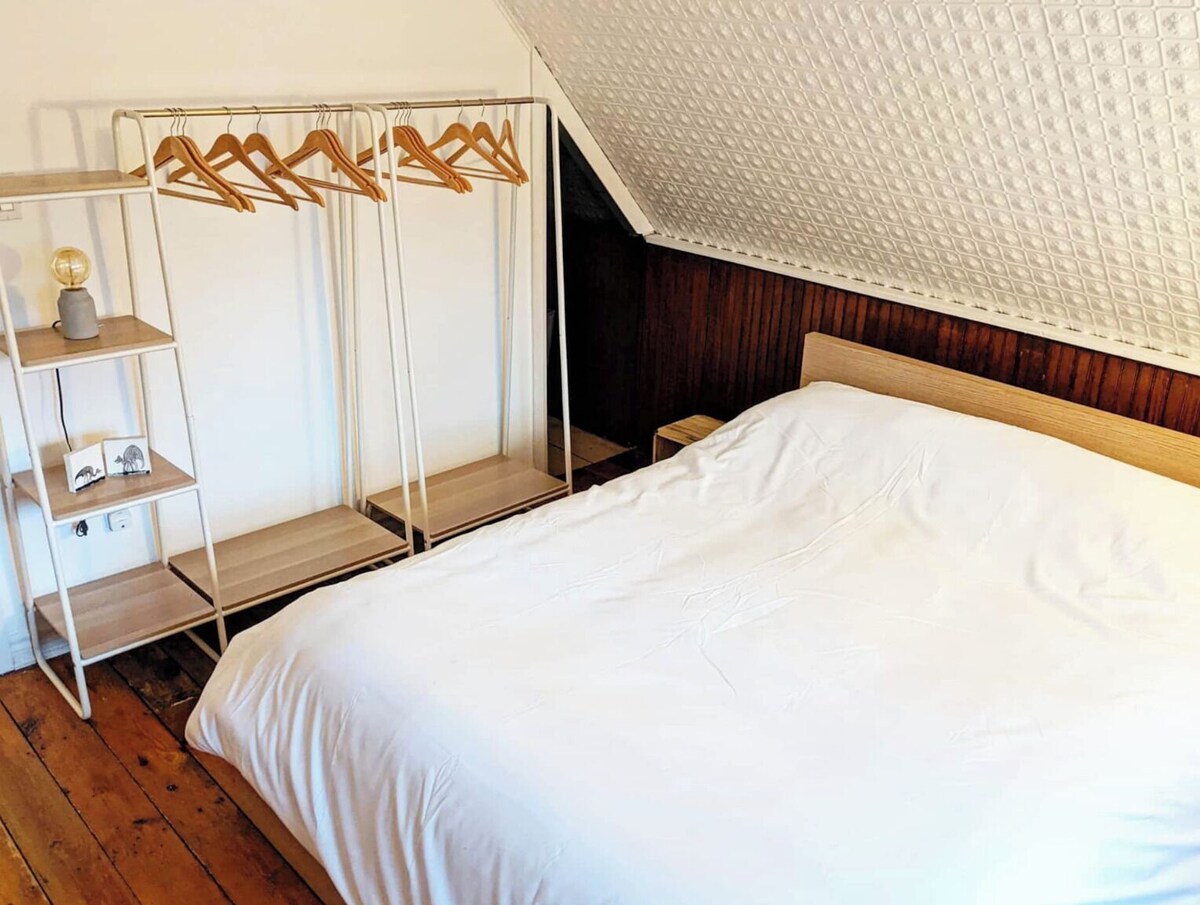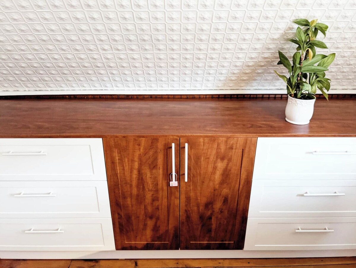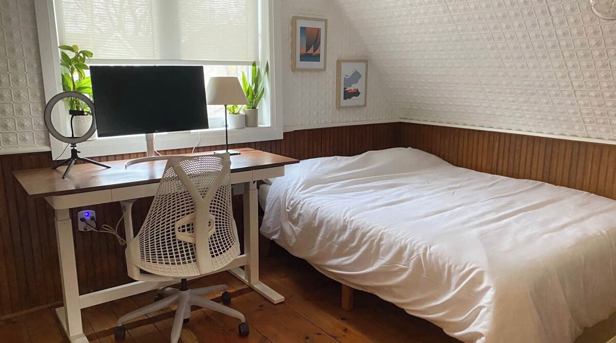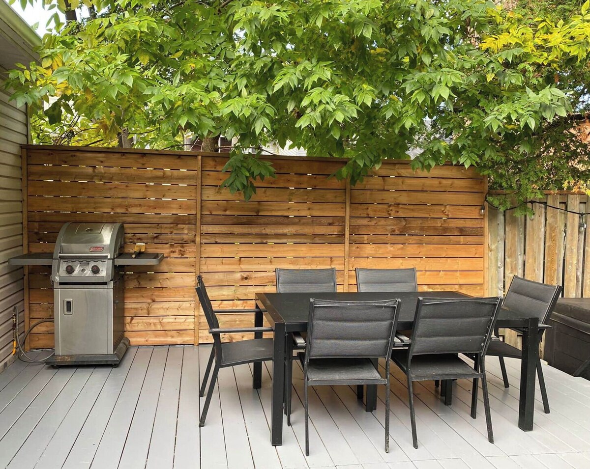 Welcome to Queen & Coxwell - quite literally the dividing line between two of Toronto’s nicest neighbourhoods, Leslieville and the Beaches, only minutes from Ashbridges Bay, and across the street from Drake’s new music venue, History. This 2-bedroom home is more than 160 years old, with original wainscoting and authentic tin textured walls and ceilings, along with freshly renovated fixtures, kitchen, bath and fun decor, offering the ideal balance of vintage charm and modern aesthetic. The home also comes with a private fenced-in backyard, complete with outdoor dining table, grill, lawn chairs, and jacuzzi hot tub. At a little over a thousand square feet, our home comfortably sleeps 1-4 guests, the perfect spot for a couple or small family looking for a cozy getaway, someone staying in the city for work, or a handful of friends on a weekend away. Both bedrooms on the second floor have queen beds, with an open concept living and dining area downstairs, 3-piece bathroom with shower on the main floor, and a little desk area for anyone working remotely. There’s parking for up to 2 cars, along the left of a Y-shaped driveway, shared with our neighbour next door. - Just north of Queen Street, a great stroll east to the Beaches or west into Leslieville -Local favourite Simple Coffee is on the corner, with Murphy’s Law Pub up the street -Woodbine Park’s across the way, host of Jazz Fest, Canada Day fireworks and more -The start of the boardwalk along Woodbine Beach is less than 10 minutes by foot - Also short drive to Toronto’s film studio district - Pinewood, Revival, Cinespace, & co - If you like to jog or bike, the Leslie Spit nearby has arguably the best view of the city We love Toronto’s east end - great boutique shops, restaurants, and coffee houses, and there’s a movie theatre only a stone’s throw from our place. We look forward to hosting you in our home, and we’re here if you have any questions at all about your upcoming stay :) It's worth noting that our home is on a small side avenue - a quiet family neighbourhood, the kind where the kids play ball hockey in the streets. Our home is certainly not a setting for group events, outdoor music, or loud parties of any kind. We expect guests to be respectful of our neighbours at all times, and in accordance with local by-laws keep outside noise to a minimum, and quiet hours after 11pm. Please treat both our home and our neighbourhood as you would your own. Our prices include all fees. No hidden fees.