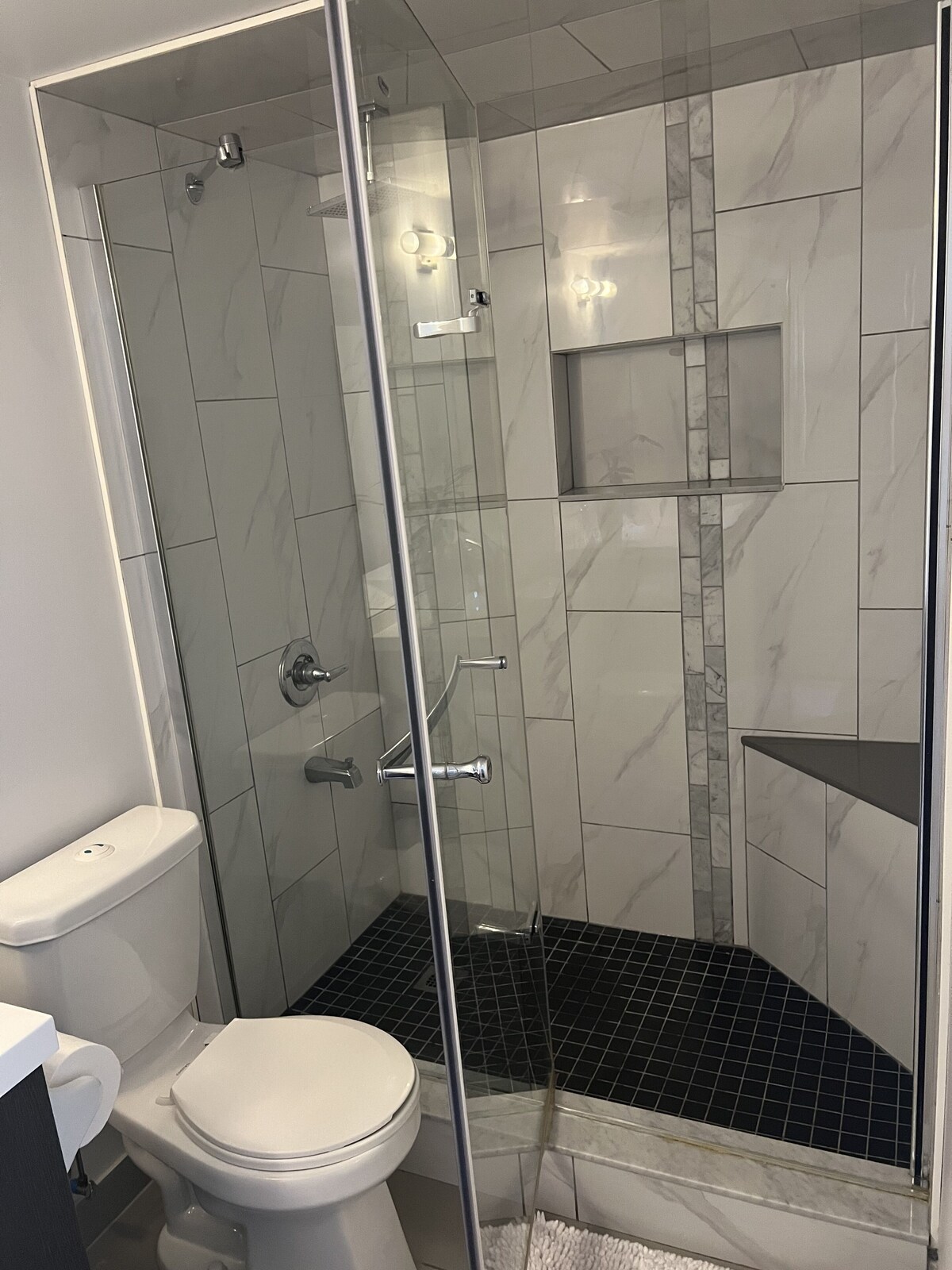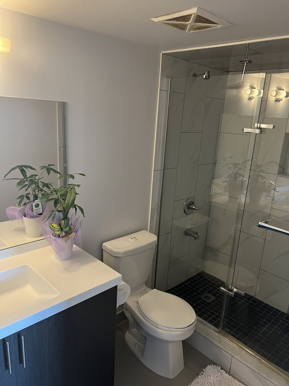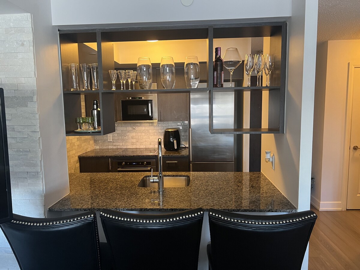Kick back and relax in this calm, stylish space. Great location, beautiful, clean, recently renovated 2 bedrooms, one king size bed with workspace area, one queen bed, 2 full bathrooms, one with a spacious glass standing shower with gorgeous tiles, second bathroom has deep tub ideal for the perfect bath, living room has a stunning feature brick wall & wonderful view. Also has mounted flat screen smartTV. High speed Internet. In unit washer+dryer. Everything you need for a great stay in Toronto. Walking distance to groceries store malls and more! Our prices include all fees. No hidden fees.