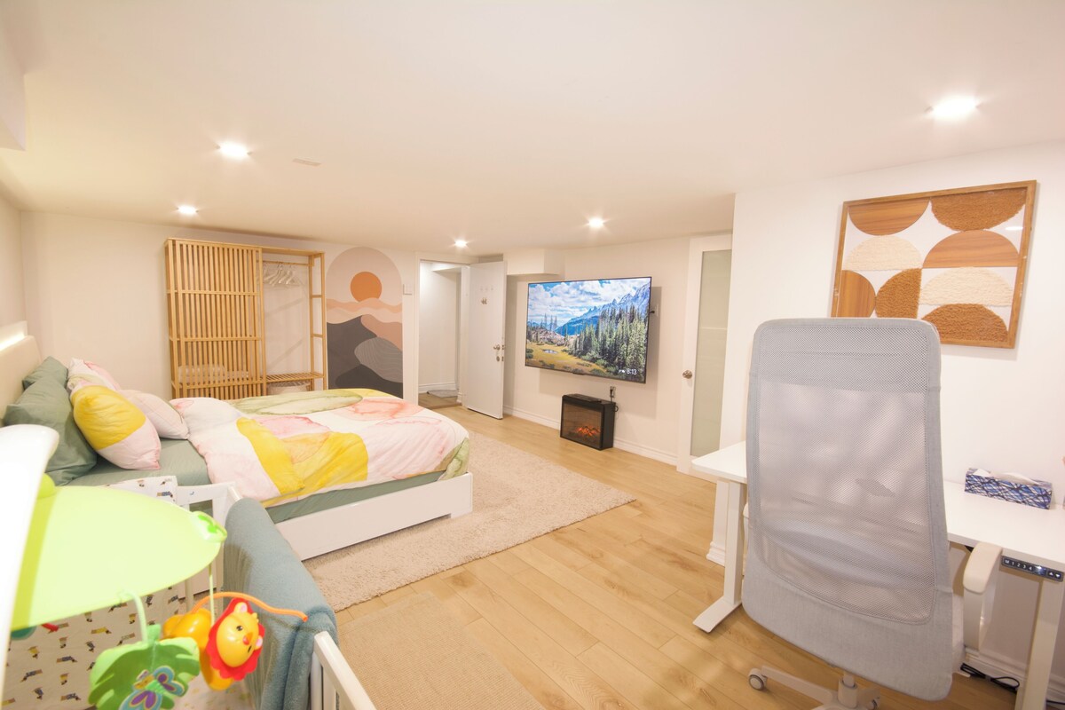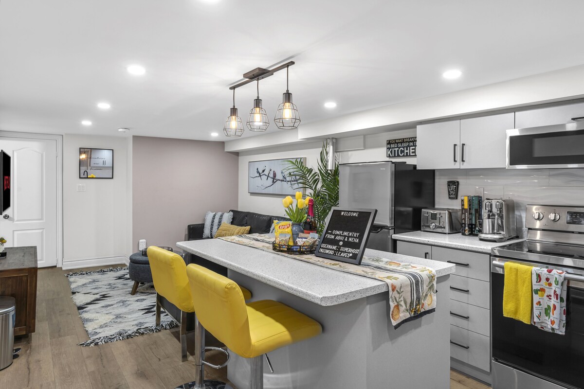 Welcome to Our Beautiful Home! Relax in Comfort & Style • Spacious 2-BR Basement Suite in a raised corner bungalow. • Beautifully Decorated for a cozy, welcoming vibe. • Nature Meets Convenience in Southwest Toronto, just 3 minutes to the Gardiner Highway—a gateway to major attractions. • Private Access—the entire suite is yours! Prime Location • Steps from High Park—enjoy scenic trails and lush greenery. • Seamless Commutes: 3 minutes to Gardiner Highway, 20 minutes to the airport. • Transit at Your Doorstep: TTC bus stop right across the street connects you to the subway in 10 minutes. Modern Comforts • Smart Check-In: Easy self-check-in with a smart lock. • Smart Features: Control lights with Alexa for convenience. • Fast Wi-Fi: High-speed internet for work or streaming. • Gourmet Kitchen: Fully equipped with modern appliances and a Nespresso machine. • Relaxing Space: Stylish living room, inviting bedrooms, and a workspace with a standing desk and ergonomic chair. Neighborhood Highlights • Family-Friendly: Parks, playgrounds, and green trails nearby. • Vibrant Art: Close to stunning graffiti walls and trails leading to Humber River and Humber Bay Arch Bridge. • Convenient Access: Ideal for trips to downtown or events at Scotiabank Arena and Rogers Centre via Uber/Lyft. Important Notes • Noise Awareness: Private basement suite; occasional sounds from upstairs may be noticeable. • Ceiling Height: Basement height is 6’6”, with 6’ in the bathroom. • House Rules: No smoking, no parties or events. Smoking incurs a $500 penalty. • Pet-Friendly: Dogs welcome for $75 per stay; additional dogs $50 each. Undeclared pets incur a $500 fine. Book now for a perfect blend of comfort, convenience, and tranquility! Our prices include all fees. No hidden fees.