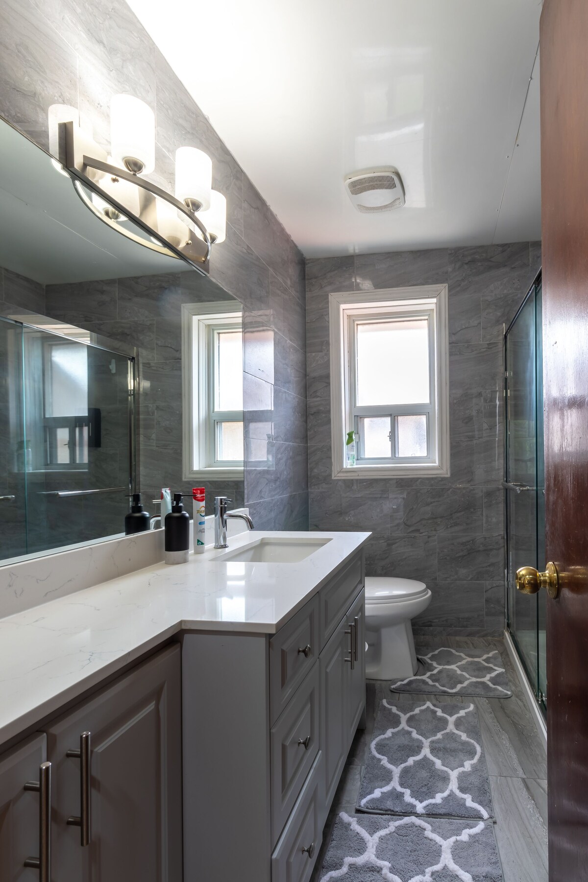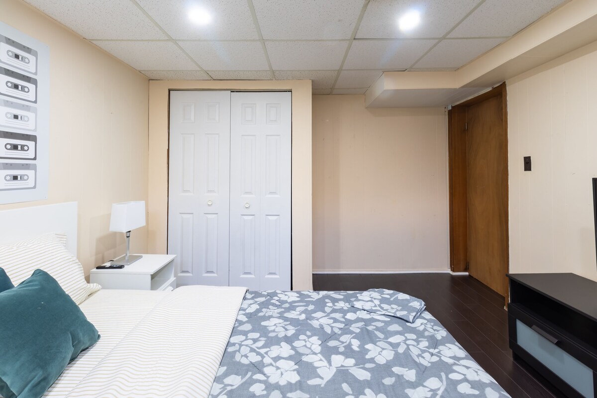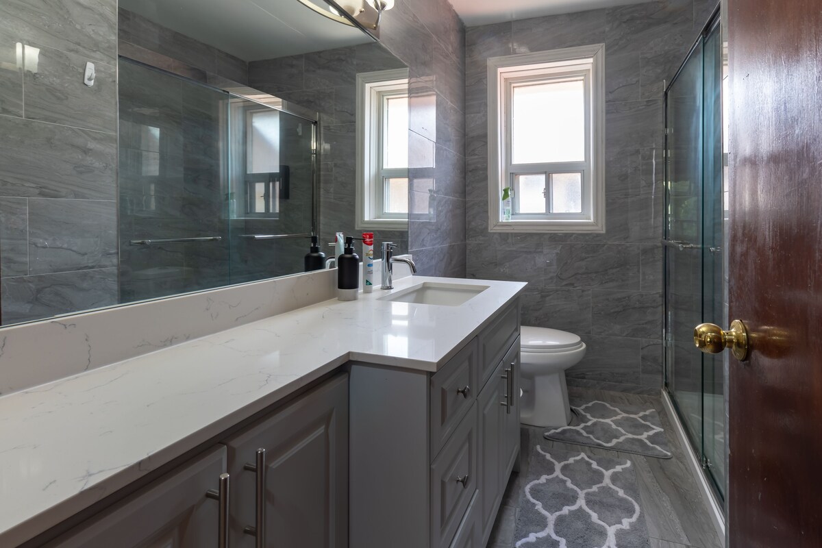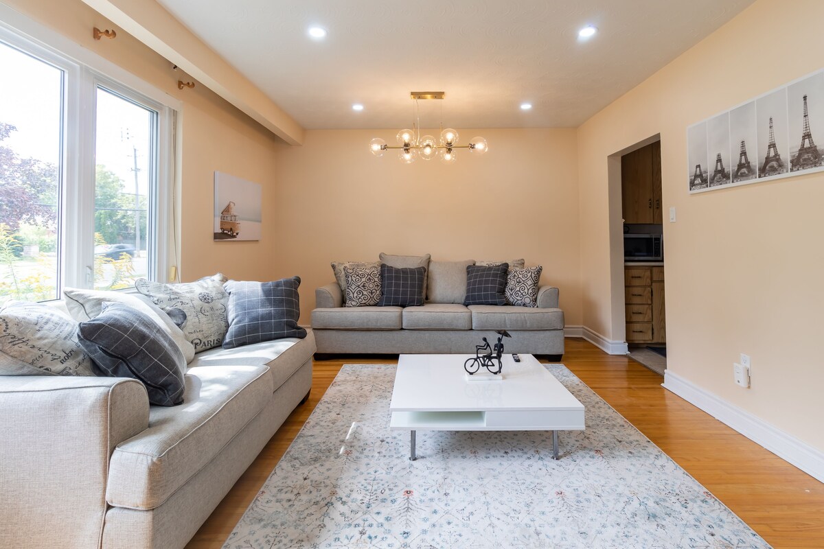 Enjoy your stay in a stunning, immaculate, recently refurbished luxury bungalow that is close to the airport, highly modern and fashionable, with self-check in, Netflix, Prime, Super high speed Wi-Fi, and equipped with all necessities. Specially designed for business travellers and families. From high speed internet and free parking, to 100% cotton luxury linens and lighting that creates the ideal mood in each room, we have every amenity you'll need for an unforgettable stay! The thoughtful design and location of this vrbo, which is only nine minutes from Toronto Pearson Airport and seventeen minutes from downtown Toronto, which will make you feel like you are in your dream home while still giving you a homely feel! The house is huge, airy, bright, cosy, and immaculately clean. The style is contemporary mid-century. The entire bungalow, including the living and dining areas, full kitchen, luxurious baths, pool table, and entertainment area, will be available to the guests. Modern conveniences including a hot pot, coffee machine, and OTG (Oven Toaster Griller) are available Amenity Highlights: - 500 Mbps speed Wifi - 55\ Smart TV with Netflix - Many lamps and lighting options to create a cozy relaxing ambiance You'll have private access to the bungalow as well as the covered front car port and back yard with seating bench! This space is PERFECT for business travellers looking for a location near the airport! Colleagues have their own private comfortable bedrooms and can meet in the large, bright, open concept living/dining/kitchen to work. Highlights for Business Travellers: - 500 Mbps Wi-Fi - Power outlets - Various workspaces (desk, dining table) - Quiet & bright To be noted: - This vrbo includes the entire home, with its own entrance, and completely separate and private. - Anyone staying at this vrbo will need to be able to climb stairs as there is one short staircase (6 steps) leading up to the bedrooms, and one larger staircase (12 steps) from the kitchen/living room to the lower level of the house to the entertainment room, work area and one of the bedroom. Our prices include all fees. No hidden fees.