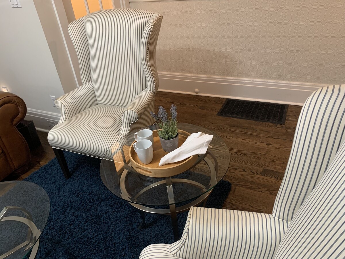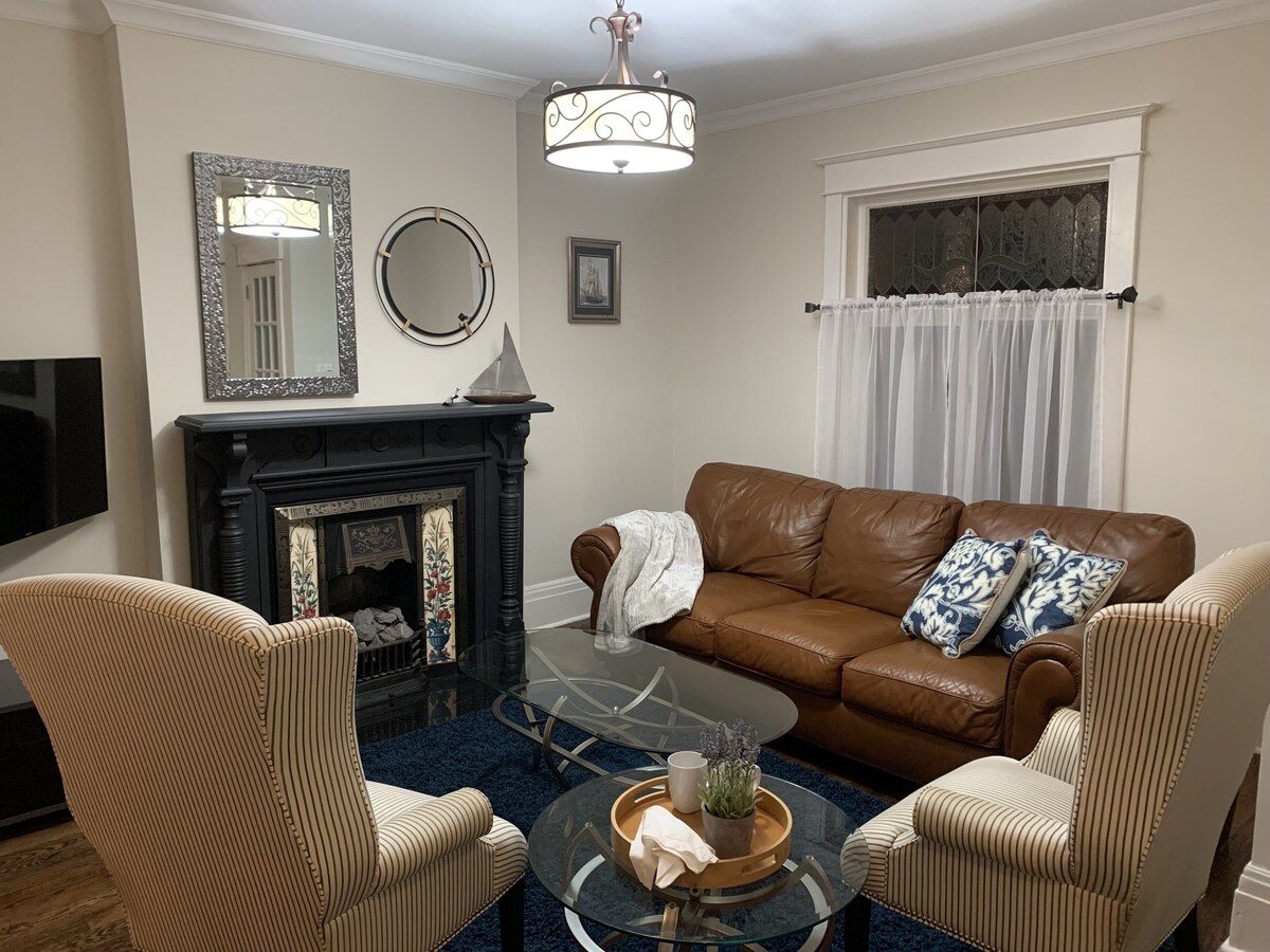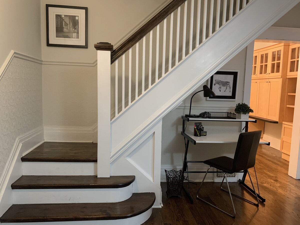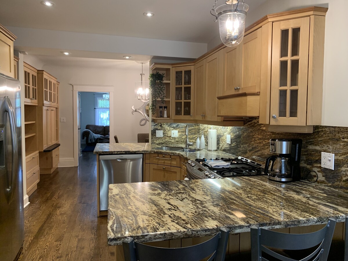 Welcoming and immaculate 3-bedroom home on a tree-lined street in a gorgeous neighbourhood. Perfect for family getaways, temporary relocation to Toronto, and remote working. Unlimited Internet. 3 separate desks/work areas. Safe, spacious, spotless. Living room w/ 43” smart TV. Open-concept dining room w/ fully-equipped eat-in kitchen. Comfy beds and lots of storage in bedrooms. Peaceful backyard with dining area. Private upper balcony. Covered front porch. Perennial gardens front and back. Please note that we also short-term rent the basement unit. It has a private entrance through the back. You will have to share the laundry facilities with them and the backyard. Only street parking via city permit is available. Please note that if any of our house rules are violated, we will be using the damage deposit to claim for the violation committed. Our prices include all fees. No hidden fees.