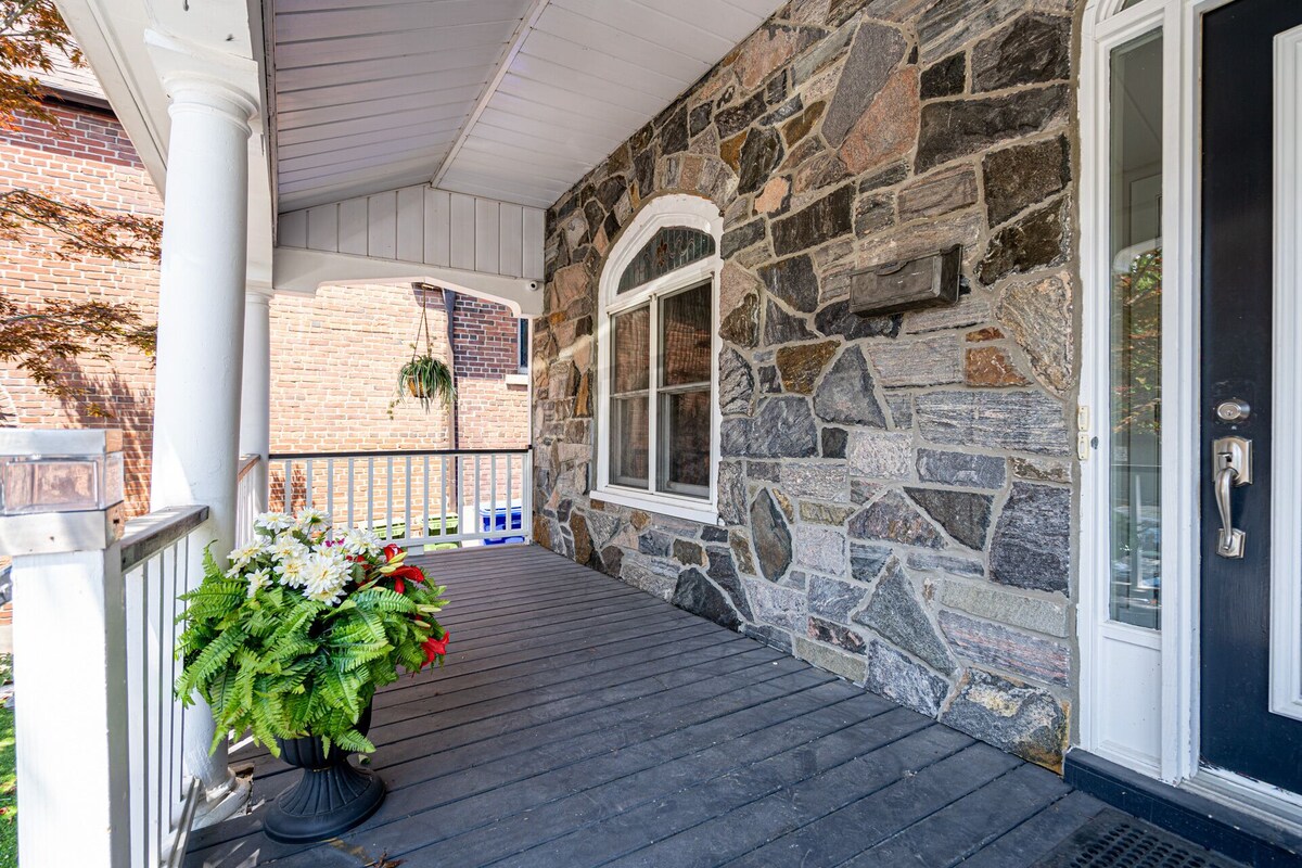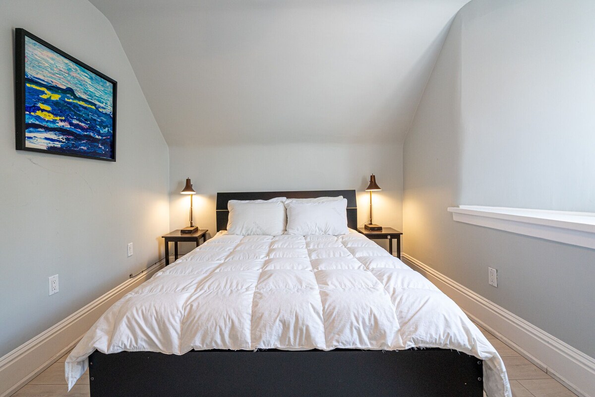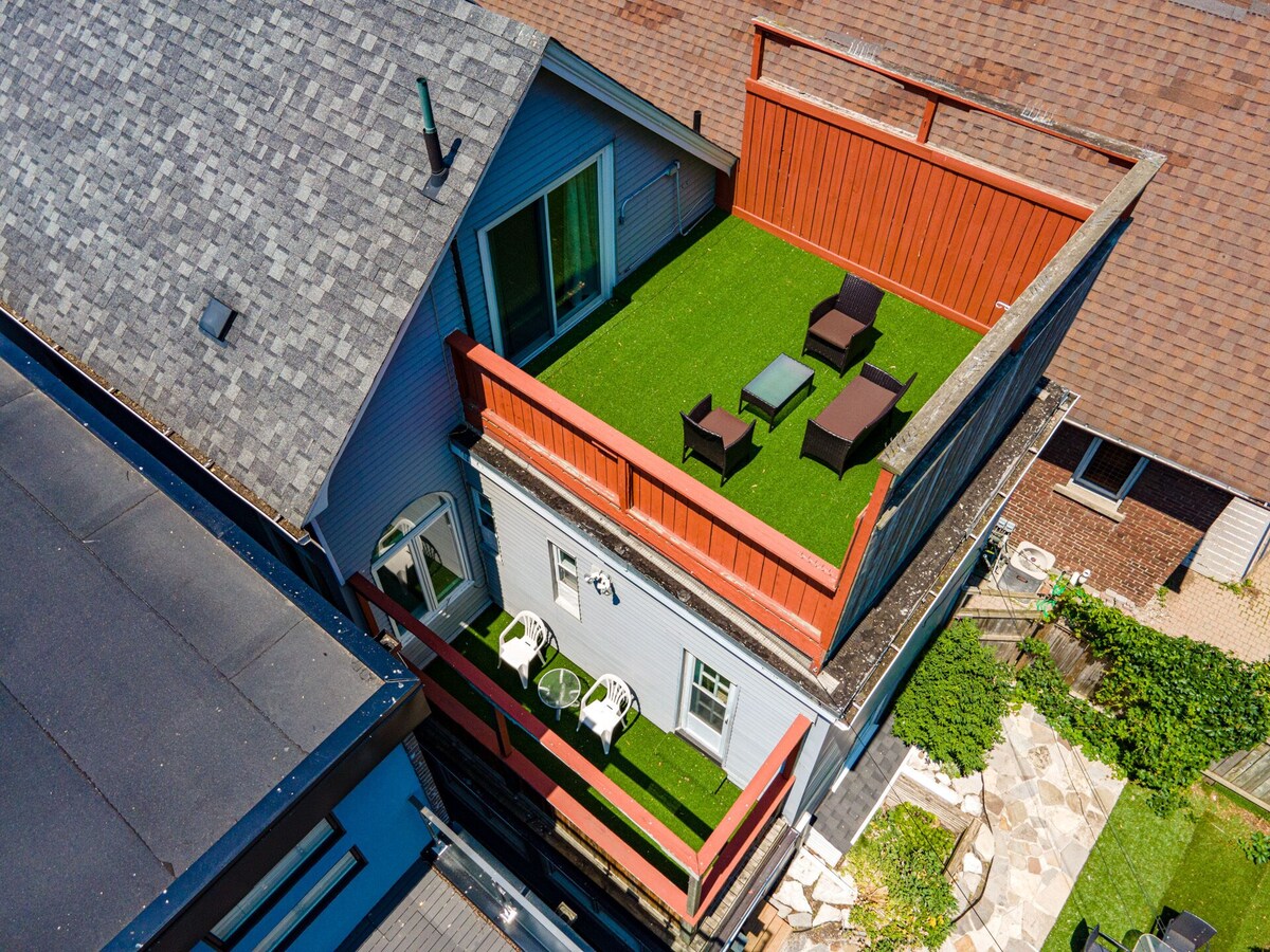 This luxurious 4-bedroom apartment is located in the trendy Beaches neighbourhood of Toronto. It boasts a private upper floor outdoor terrace, a fully equipped kitchen, tastefully decorated bedrooms, and modern amenities such as high-speed internet and a large TV. The apartment is steps away from a beautiful beach and trendy restaurants, cafes, and boutique shops, making it an ideal location for a comfortable and enjoyable stay in Toronto. A Bright and Open Main Level Ascend the first flight of stairs, and you’ll be greeted by a sunlit, open-concept living and dining area framed by contemporary décor and plush seating—ideal for unwinding after a day of discovery. Adjacent to this inviting space is a fully equipped chef’s kitchen complete with stainless steel appliances, a side-by-side extra-large fridge and freezer, granite countertops, and every utensil you could need to whip up an impressive meal. Also on this level are two bedrooms: one featuring a sumptuous queen bed, and the other flexing as an office with a comfortable pull-out couch—perfect for guests who need a quiet spot to work. Your Private Upper-Level Retreat A second set of stairs leads you to the top floor, where you’ll find two more spacious bedrooms, each outfitted with a queen bed and swathed in luxe linens to ensure a restful night’s sleep. But the real showstopper here is the secluded outdoor terrace. Whether you’re sipping morning coffee, enjoying an evening glass of wine, or hosting a laid-back gathering under the stars, this breezy haven offers a rare blend of tranquility and privacy. Furnished with seating and surrounded by Toronto’s charming treetops, it’s a delightful extension of your living space—one that truly sets this home apart. Discover the Vibrant Beaches Neighbourhood One of Toronto’s most cherished areas, The Beaches boasts a laid-back, friendly atmosphere brimming with trendy restaurants, artisanal cafés, boutique shops, and live music spots. You’ll be just steps away from a sprawling sandy shoreline, where you can sunbathe, build sandcastles, take a dip in Lake Ontario, or stroll the scenic boardwalk lined with iconic beach houses. The neighborhood also offers easy access to parks, playgrounds, and recreational trails—perfect for families and outdoor enthusiasts. Plus, with public transit options nearby, heading downtown for a museum visit or a night out is simple and stress-free. Conveniences and Comforts Galore After a day of urban exploration or beach fun, return to all the comforts you need to recharge. Stay seamlessly connected with brand-new 3GB fiber-optic internet that makes streaming and remote work a breeze. Large flat-screen TVs, soft seating, and stylish furnishings ensure you’ll feel right at home. For a quick caffeine fix, you’re just a short walk from local coffee shops, as well as Tim Hortons and Starbucks. Experience the best of Toronto living in The Beaches, where lakeside serenity meets city convenience. Book now to secure your stay in our popular multi-level apartment, and let us welcome you to your perfect home away from home! Our prices include all fees. No hidden fees.