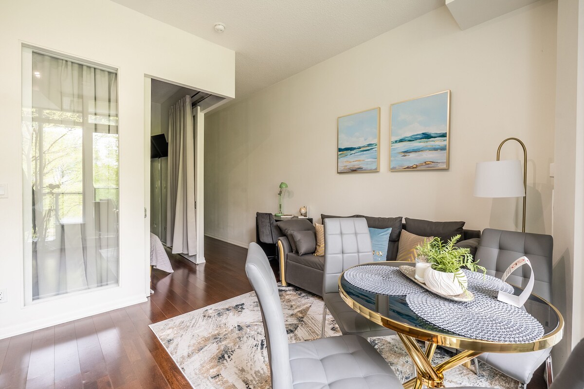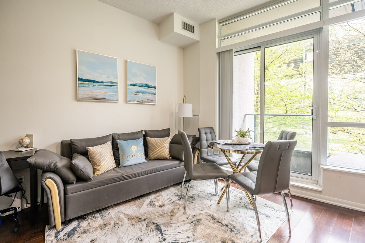 Welcome to our amazing apartment located in a boutique building in the heart of trendy Downtown Toronto. 1 bedroom unit is perfect for single, couples or working professionals. The apartment is located steps away from Toronto's best restaurants, shops, and entertainment. This bright unit has floor to ceiling windows, an open concept layout, and high end furniture chosen by an award winning interior designer. The space This comfortable suite has everything you need to make you feel right at home. 1 bedroom with 1 bathroom. Fully functional kitchen with supplies (Tea, coffee, kettle, coffeemaker, toaster). Washer and Dryer with supplies. Bathroom with towels, shampoo, conditioner, body wash, hair dryer and other toiletries that you may have forgotten at home. Guest access Guests have access to Gym, Indoor Pool, Hot Tub and Sauna in the Building Other things to note According to the condo rules we must provide information about our guests to the condo management prior to their arrival, i.e. every guests` names and their ID details, vehicle and license plate numbers (in case you require a parking spot). We kindly ask you to send us your selfie with your ID in your hands as an anti fraud measure. Please note that you need to be 18 or over in order to check in. Guests whose names or ID do not match the information given ARE NOT allowed into the building. These are mandatory requirements, if you do not agree to provide this information, we can`t guarantee a refund. Paid underground parking (in/out privileges) is available upon a request and not included in the price. The price is $10 per night. Please request in advance as it could be booked. Pets are allowed in the apartment. If you plan to stay with pets, please, confirm the opportunity prior to booking. Pets fee $10 per night for 1 pet. We have Travel Crib (for baby 0 18 month) and Bed Rails. $5 per one item per night. Book, please, in advance. ***Deposit*** All guests are required to leave a refundable deposit of $500 CAD . If at any case smoking inside occurs, there is damage to the unit or other house rules are violated, this deposit will not be refunded. Dear Guest, Please take a moment to read the unit policies: The minimum age for booking is 18 years. All guests are required to pay a $500 security/damage deposit prior to check in. The deposit is refunded within 7 days after check out unless damage, smoking or excessive noise occurs during your stay, in which case damage deposit will not be refunded. Check in is after 3PM, check out is before 11AM. Late check out may be possible but we must be notified well in advance. Your request will be reviewed and accommodated if possible. Pets are allowed in the apartment. If you plan to stay with pets, please, confirm the opportunity prior to booking. Pets fee $20 per night for 1 pet The property is not a hotel. The security desk and the concierge neither support guests nor provide any information related to your reservation. Please provide us with a photo of valid your ID: international passport, driver s license, permanent resident card and a photo of yourself with the ID (a selfie with the ID). Please note that for our foreign guests we require a passport as an ID. * NO PARTY POLICY The unit is equipped with video surveillance to the front door ONLY and a noise detector (no cameras are inside the unit). The front door will be checked for the number of guests as well as the noise level to avoid any type of parties. We have the right to cancel your reservation immediately without any refund if the number of guests will exceed the number specified in the reservation. If you plan to invite any additional guests, please inform us in advance. ** NO SMOKING POLICY The unit is equipped with a remote smoke detector to detect any sources of smoke and notify us remotely. Any type of smoking (cigarettes or marijuana) is prohibited inside the unit or building. If the alarm is triggered and we will discover the smell of any type of smoke, Globalstay has the right to cancel your reservation immediately and charge you: 150$ service call 200$ cleaning fees Please contact us if you have any questions. Our team will be more than happy to resolve your issues and provide you with a comfortable stay. Our prices include all fees. No hidden fees.