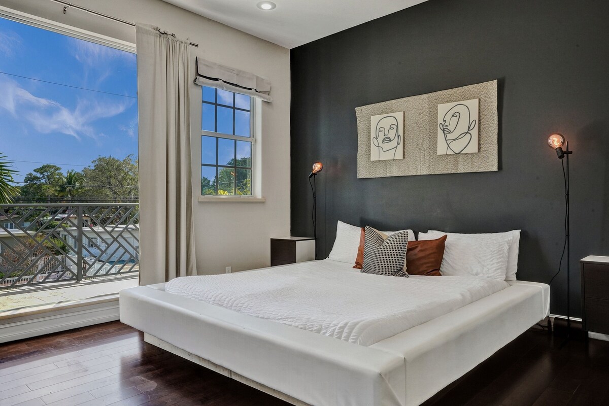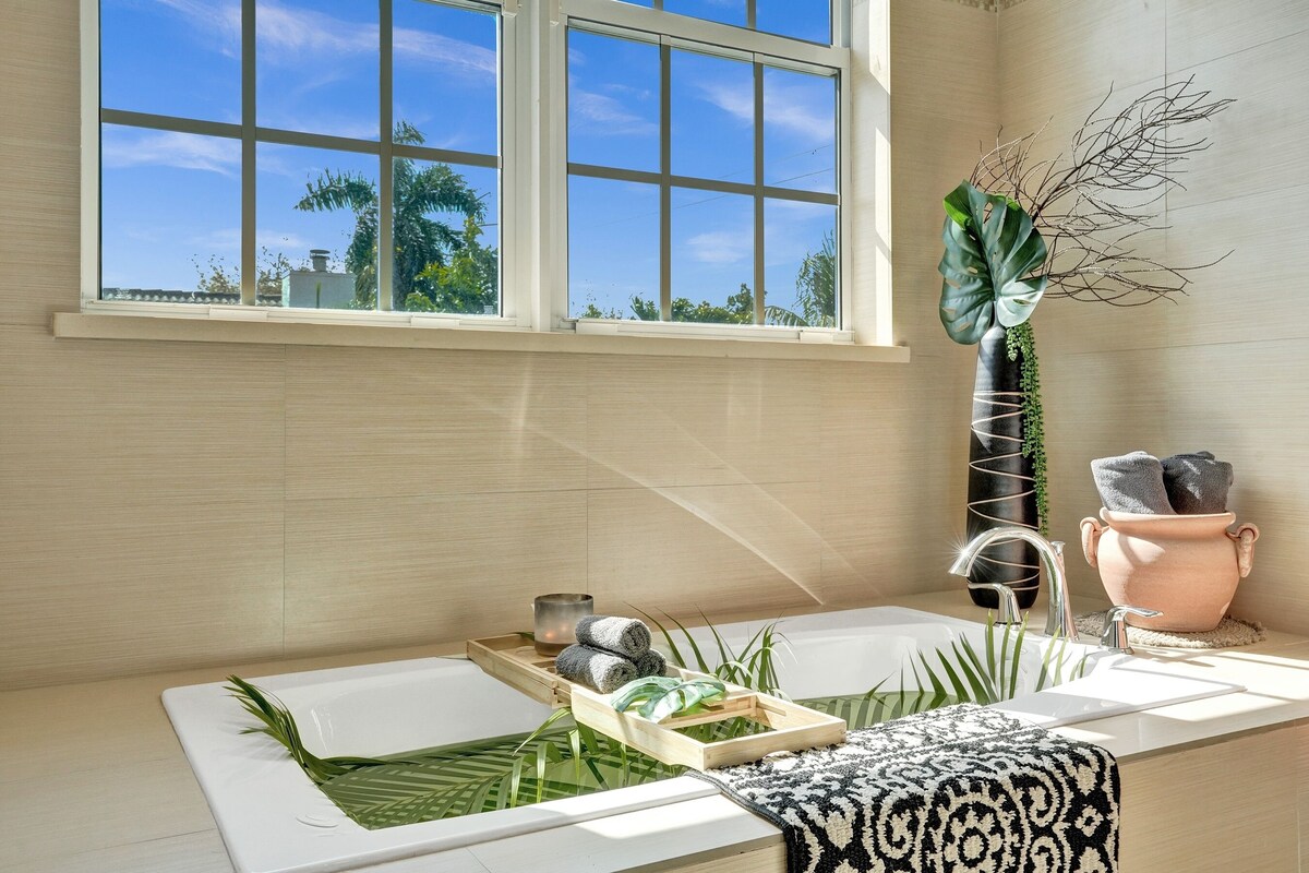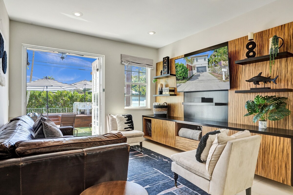 This spacious residence has four inviting bedrooms and three meticulously designed bathrooms, providing guests with a perfect blend of comfort and luxury. The interiors exude a warm and welcoming ambiance, with unique decor and ample natural light streaming through the large windows, creating a perfect atmosphere for relaxation. The thoughtfully appointed living space and exterior, adorned with modern furnishings and chic accents, seamlessly connect to create a convivial and serene environment for guests to unwind. While being tucked away in a quiet neighborhood, the home is still conveniently located near downtown Fort Lauderdale and offers guests the ideal base to explore the vibrant city. Whether strolling along the scenic riverfront, exploring the bustling arts and entertainment district, or enjoying the diverse culinary scene, the attractions of downtown are just moments away. The home's strategic location not only ensures easy access to Fort Lauderdale's key destinations such as Las Olas, but also encourages guests to immerse themselves in the local charm, making their vacation a memorable experience filled with both comfort and exploration. FREE early check-in and late check-out (based on availability). ACCESS Each guest gets a personalized lock code that expires at the time of check-out ensuring the safety of our guests and properties. MAXIMUM OCCUPANCY Maximum occupancy limits apply to children and adults 13 and over. *Sleeps 8 in beds SLEEPING ARRANGEMENTS 2ND FLOOR Primary: King bed/ Ensuite bathroom Bedroom 2: King bed/ Ensuite Jack & Jill bathroom Bedroom 3: Queen bed/ Ensuite Jack & Jill bathroom 1ST FLOOR Bedroom 4: Two Twin bed trundle bed/work-from-home office setup/ bathroom across the hallway BATHROOMS (3) 1ST FLOOR Full bathroom across from bedroom 4/Glass-enclosed shower 2ND FLOOR Ensuite primary bathroom: double sink vanity, oversized soaking tub, Glass-enclosed shower Jack & JIll bathroom: double sink vanity/ Glass-enclosed shower KITCHEN -Drip coffee pot -Coffee Grinder -Griddle/ Press -Waffle maker -Air Fryer -Blender -Toaster -Cookware -Plates and silverware for max capacity+ OFFICE The office is complete with monitors as well as a color printer -We do not provide general office supplies outside of the equipment itself nor do we provide connections for your device. *Guests are welcome to use the equipment on-premise but may not tamper with or change the setup of any of the devices. EXTERIOR 1ST FLOOR -Optional-heat cowboy pool -$20 to heat (80-85°) -BBQ grill and propane provided -Patio area with seating -4 loungers -3 Umbrellas 2ND FLOOR BALCONY -Entrance from Primary bedroom and Bedroom 2 -2 loungers and table -views of downtown -TELEVISIONS/ WIFI -RokuTV capabilities on all TVs that automatically sign guests out at checkout for safe use -Free highspeed Wi-Fi -Digital Gmaps powered travel map for easy exploration LINENS -ALL linens are professionally laundered and dried on high heat in between each guest EXTRAS -Full-size Washer and Dryer on the landing of the second floor -Pack & play -Highchair -Poker set & Playing Cards -Games -Beach chairs -Beach Umbrella -Coolers -Beach towels PETS -Pets allowed on a case-by-case basis, must be approved in writing on the booking platform, and we charge a $100 pet fee per animal, per stay. *The only animals that are exempt are service animals and guests must provide documentation for service animals that will be joining them during their stay. LOCATION The home is centrally located in a quiet neighborhood in the heart of Fort Lauderdale, and just steps away from the stunning palm-filled waterfront Lewis Landing Park. Tennis and basketball courts, and a playground can be found just 1.5 miles away at the charming Riverside Park which is surrounded by gems such as The Pizza Spot and Riverside Market. From the balcony you have views of the towering buildings of downtown and West Las Olas Boulevard is less than one mile from your front door. Just a mile away is Cooley's landing where you can park and stroll Riverwalk along the water and onto Las Olas Boulevard to enjoy the shops, dining, galleries, and weekend street fairs and music festivals. Within 1 mile of the home -Downtown Fort Lauderdale -Publix -Rivertail -Tarpon River Brewing -Phat Boy Sushi -Bar Rita -Tap 42 -Wells Coffee -Convenience store -My Market -Tarpon Cove Park -Lewis Landing Park -Riverside Park -Florence C Hardy Park -Primos Liquor (delivers) POPULAR DESTINATIONS Fort Lauderdale Beach 4.2 miles Whole Foods: 1.8 miles Las Olas 0.9 miles Flagler Village 2.5 miles Wilton Manors 5 miles Downtown 1 mile Fort Lauderdale Airport 5.4 miles Brightline Train Station 1.5 miles Lauderdale by the Sea 11 miles Hardrock Casino 7.7 miles Hardrock Stadium: 16 miles Miami Design District 25 miles IMPORTANT Strictly enforced by the city. *We risk losing our vacation rental license if found to not be in compliance with the following: -Our home is nestled in a residential neighborhood. There are noise restrictions all hours of the day with quiet hours from 10 pm to 8 am. -No on-street parking/ 3 car maximum -Absolutely no so smoking inside or in front of open doors and windows. -No parties or gatherings that exceed the maximum occupancy -Guests are responsible for presenting an ID/ photo just like a hotel. There is no exception to this rule. As per the city of Fort Lauderdale- -This property is registered with the City of Fort Lauderdale as a lawful vacation rental -This home has smoke and noise detectors. If tampered with there is a $250 fine and grounds for immediate cancellation without refund. -If the smoke detector detects smoke in the home it is grounds for immediate cancellation without refund plus the cost of damages. -It is unlawful to allow a sexual offender or sexual predator to occupy this residence -Guests must adhere to city ordinances applicable to residential areas including but not limited to noise, parking, and occupancy. -The ordinance may be found online and