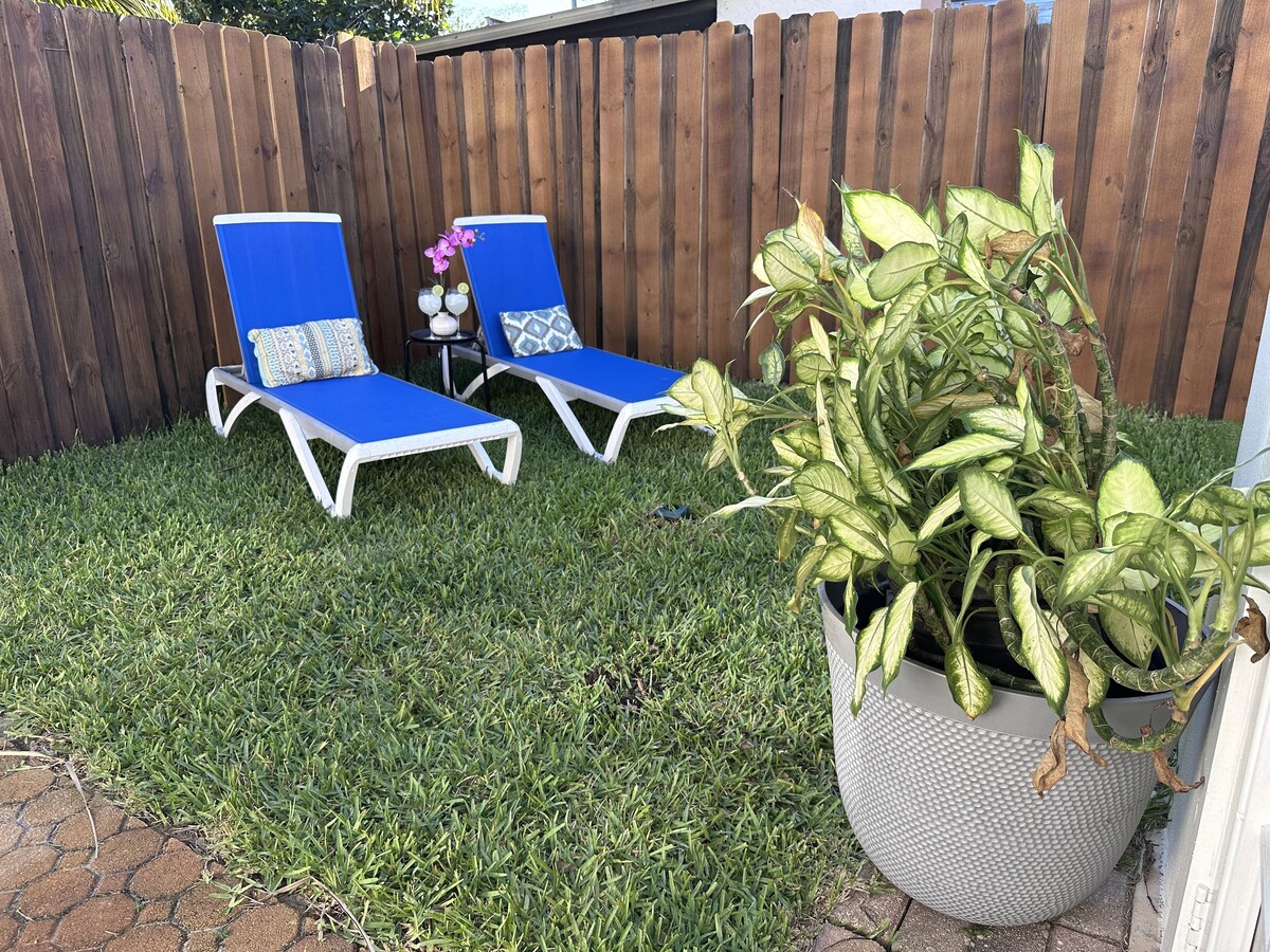 \ Welcome to your perfect getaway at our fully equipped guest house! Nestled in a serene neighborhood, this immaculate space boasts beautiful decor and all the amenities you need for a comfortable stay. With a prime location, you're just 15 min away from the stunning beaches of Fort Lauderdale, 10 min from Fort Lauderdale Airport, and 10 min from the excitement of the Hard Rock Casino, 18 min from Sawgrass Mall. Whether you're here for relaxation or adventure, our Guest House is your ideal home base. Indulge in the ultimate getaway experience at our charming guest house, where every detail is crafted to ensure your stay is nothing short of perfect. Step into your private oasis and discover a kitchenette equipped with modern conveniences, including a Keurig coffee maker, Airfryer, two induction burners, microwave, and all the essentials you need to whip up your favorite meals with ease. After a day of exploration, retreat to the comfort of our beautifully designed shower, where you can wash away the day’s adventures in style. Then, bask in the warmth of the sun as you lounge on a comfortable chaise lounge in our outdoor space, complete with a refreshing outdoor shower to cool off whenever the mood strikes. Whether you prefer the feel of natural turf beneath your feet or the convenience of artificial turf, our serene outdoor area provides the perfect backdrop for relaxation and rejuvenation. Come experience the epitome of tranquility and make unforgettable memories at our cozy guest house. **You will access to high speed internet House Rules: 1. No Smoking: Smoking is strictly prohibited inside the house. 2. Pets: Well behaved pets will be allowed prior approval. Pet owners is responsible for picking up after their dog’s waste. 3. Quiet Hours: Please respect quiet hours between 10:00 PM and 8:00 AM to ensure a peaceful environment for everyone in the neighborhood. 4. No Parties or Events: The space is for residential use only. Please refrain from hosting parties or large gatherings without prior approval. 5. Respect Neighbors: Please be mindful of our neighbors and keep noise levels to a minimum, especially during late hours. 6. Maximum Occupancy: The maximum number of guests allowed is stated in the booking. Please do not exceed this limit without prior arrangement. 7. Check-in and Check-out: Check-in time is after 3:00 pm, and check-out time is by 11:00 am. Early check-in or late check-out may be available upon request, subject to availability and additional fees. 8. Damages and Breakages: Guests are responsible for any damages or breakages incurred during their stay. Please report any issues to the host immediately. 9. Cleanliness: Please leave the space in the same clean and tidy condition as you found it. Additional cleaning fees may apply if excessive cleaning is required after check-out. 10. Security: Ensure all doors and windows are locked when leaving the property and at night. Guests are responsible for their personal belongings during their stay. 11. Kitchen Use: Guests are welcome to use the kitchen facilities, but please clean up after yourselves and wash any dishes or utensils used. 12. Parking: please park only in designated areas and follow any specific instructions provided by the host. 13. Fire Safety: Do not tamper with fire safety equipment, such as smoke detectors or fire extinguishers. In case of emergency, exit the property immediately and contact emergency services. 14. Utilities: Please be mindful of energy and water usage to help conserve resources. Turn off lights, air conditioning, and other appliances when not in use. 15. Communication: Feel free to reach me out with any questions or concerns during your stay. We want to ensure you have a pleasant experience. By booking our space, you agree to abide by these house rules. Thank you for your cooperation and enjoy your stay! Our prices include all fees. No hidden fees.