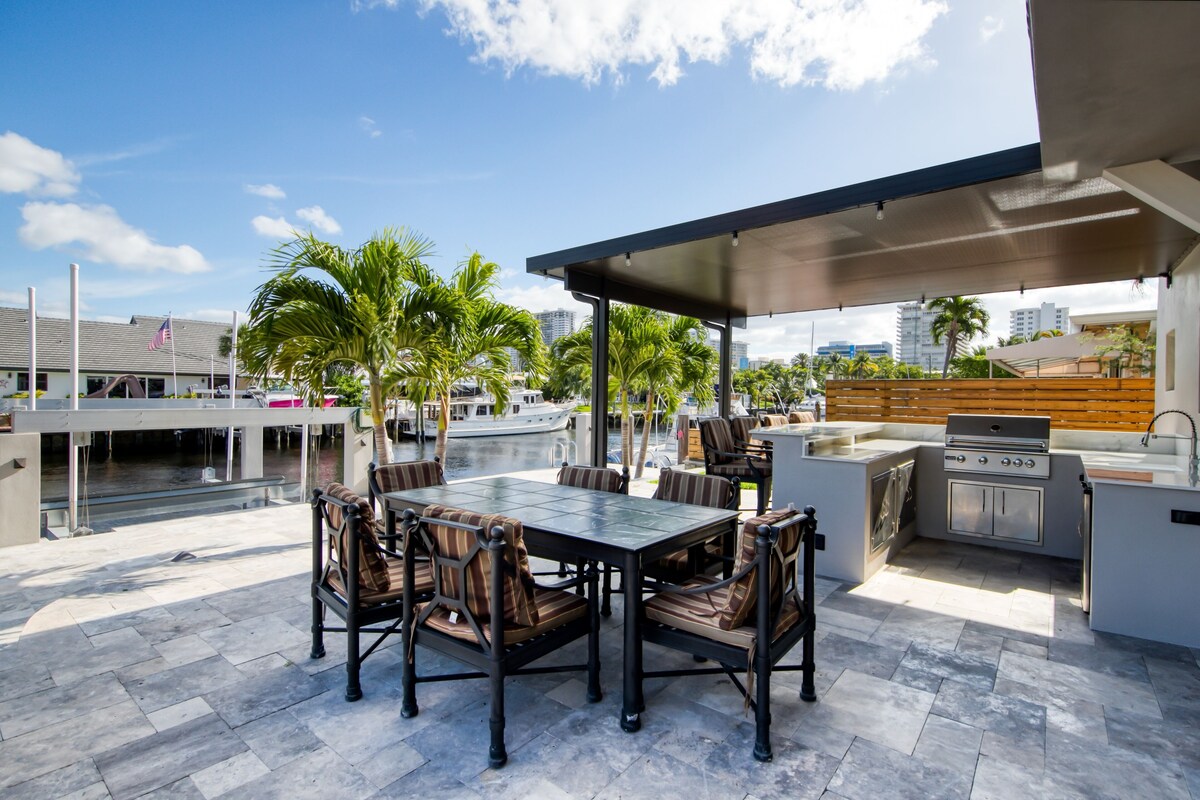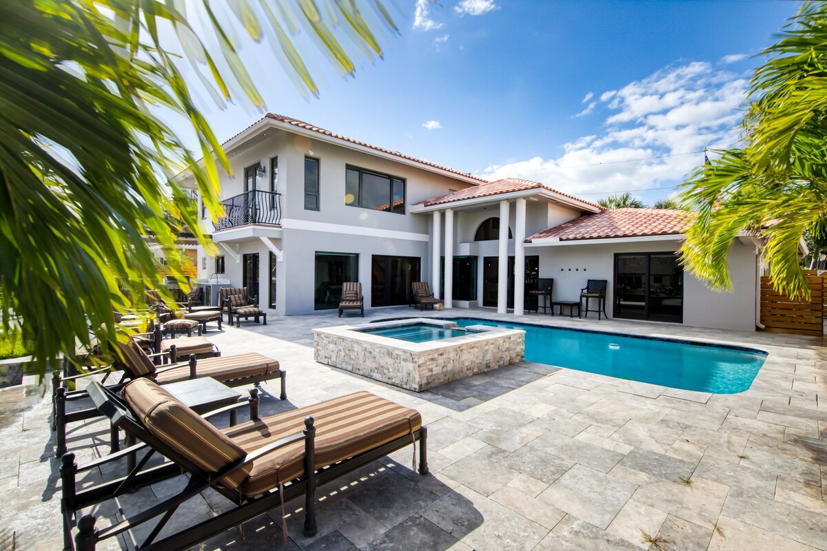 Rustling Palms Our calendar is updated in real-time & our nightly rates are accurately displayed. Simply enter your desired dates and click 'Book Now!' An iconic scene of Fort Lauderdale awaits at this luxury waterfront home, beautifully set among rustling palms and beneath sparkling South Florida skies. This is a place for living your life outdoors - taking afternoon dips in the heated pool and pool spa, barbecuing and mixing drinks in the covered outdoor kitchen, and marveling at spectacular nightly sunsets as you dine on the stone terrace. This two-story home is located in the desirable Bermuda Riviera of Fort Lauderdale, where it sits right at the canal's edge. Heading to the beach for the morning? You're only a matter of blocks from the white sand shoreline. There's so much that's special about this home, starting with the sheer size of its waterfront terrace. It's the perfect place to entertain loved ones, whether you're cooling off in the pool, soaking up the sunshine, or telling stories around the firepit as the sun goes down. Step inside to find luxe elements of design at every turn, from the waterfall stone and stainless steel appliances in the kitchen to the chic wet bar with a beverage fridge, glassware, and leather stools. There's also ample seating - for meals around the dining room table and for movies in the plush living room afterwards. All five bedrooms are paired with full bathrooms for your comfort and privacy. There are two bedroom suites on the ground floor, each with access to the patio. Three more bedroom suites are upstairs, each one with a balcony. Bonus features of the house include laundry facilities, central air, and complimentary WiFi. Things to Know The pool is 85 degrees. The spa inside the pool is 99 degrees. The switcher to turn on the spa is on the north side of the house. If you are bringing a dog on your trip, the pet fee is already included in your quote when selecting ‘Yes’ to pets. No more dogs are allowed. Parking notes: There is free parking available for 4 vehicles. Damage waiver: The total cost of your reservation for this Property includes a nightly damage waiver fee, plus tax if applicable (the “Damage Waiver”). (A discount may be applied for stays of 28 nights or longer, if permitted.) The Damage Waiver covers you for up to $3,000 of accidental damage to the Property or its contents (such as furniture, fixtures, and appliances) as long as you report the incident to the host prior to checking out. The Damage Waiver fee eliminates the need for a traditional security deposit. More information can be downloaded from the \ on the checkout page. Due to local laws or HOA requirements, guests must be at least 21 years of age to book. Guests under 21 must be accompanied by a parent or legal guardian for the duration of the reservation. Our prices include all fees. No hidden fees.