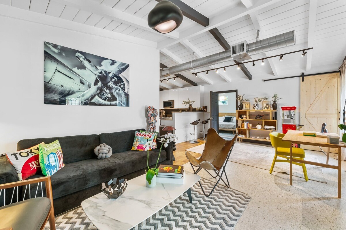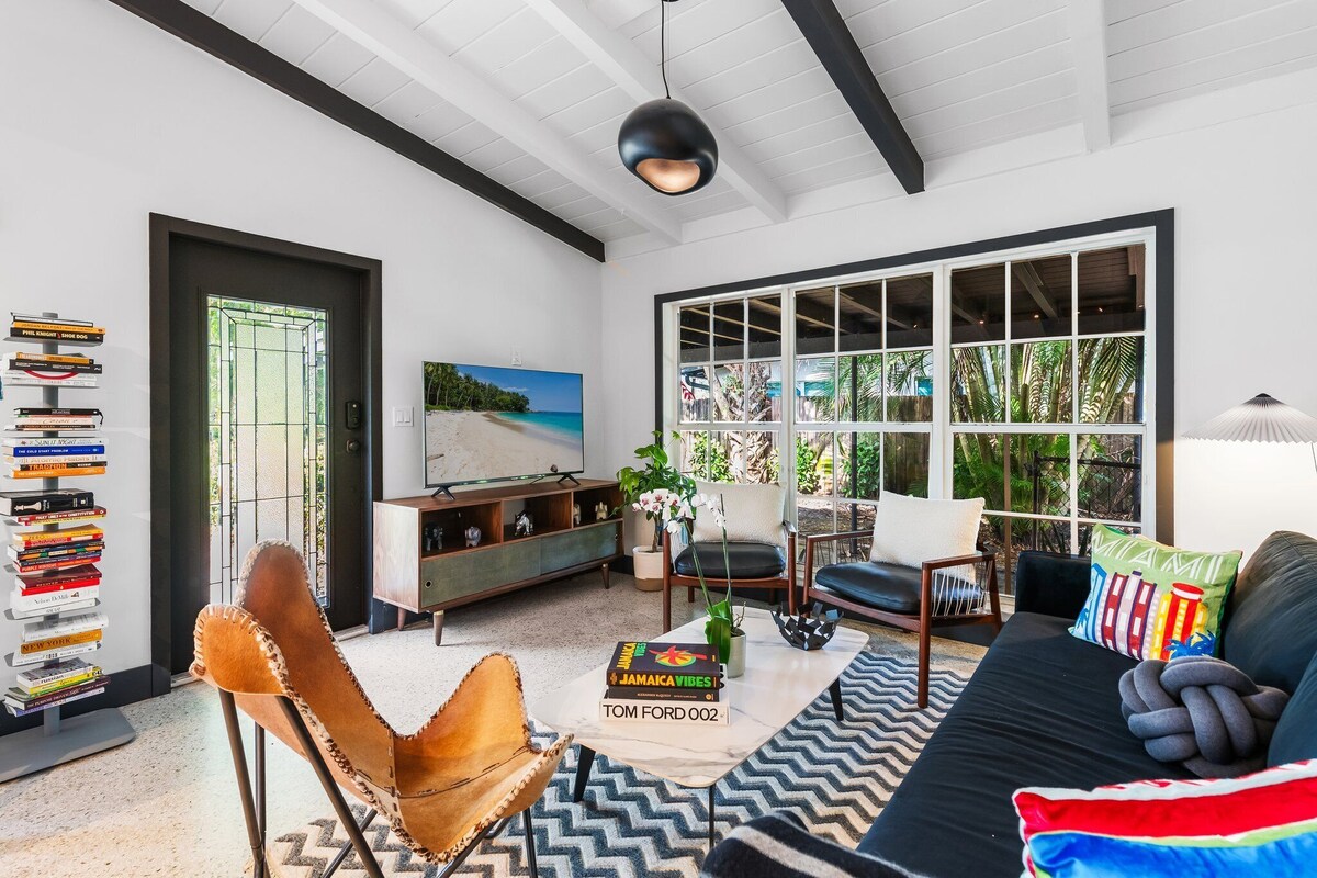 Vacation in style! Every of this Mid-century modern bungalow completely renovated into a hip retreat adorned with modern art collection of renowned international artists, all European furniture by Design Within Reach, finest Italian linens by Frette, kitchen appliances + decor by Alessi. Big 8 person spa creates a private resort feel. Centrally located in lush and serene enclave yet 15 min to Fort Laud beach, 10 min to Downtown/Las Olas, 10min to Hard Rock Casino and 5 to Brightline and i95