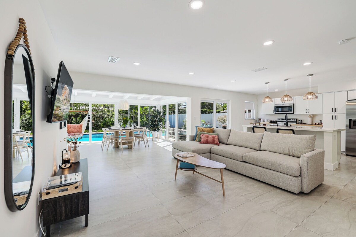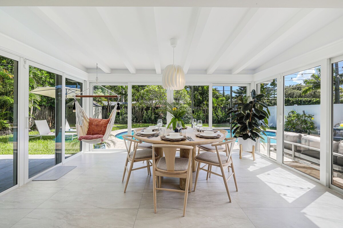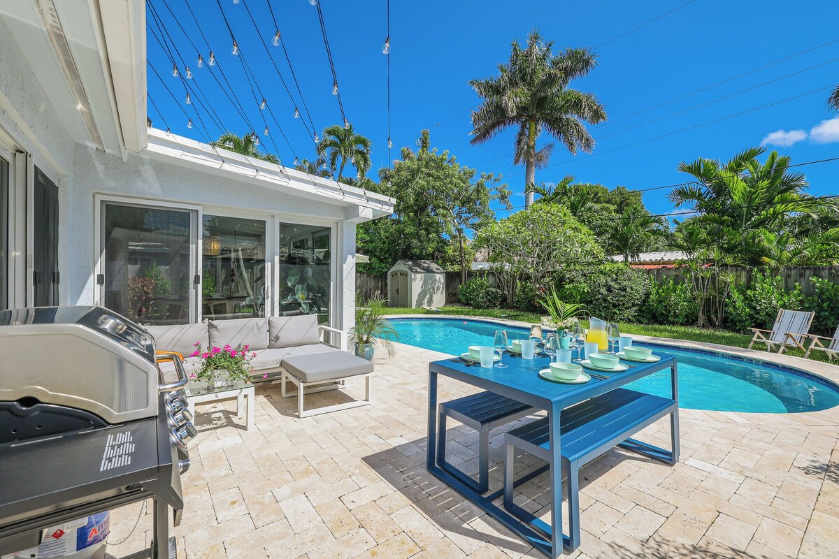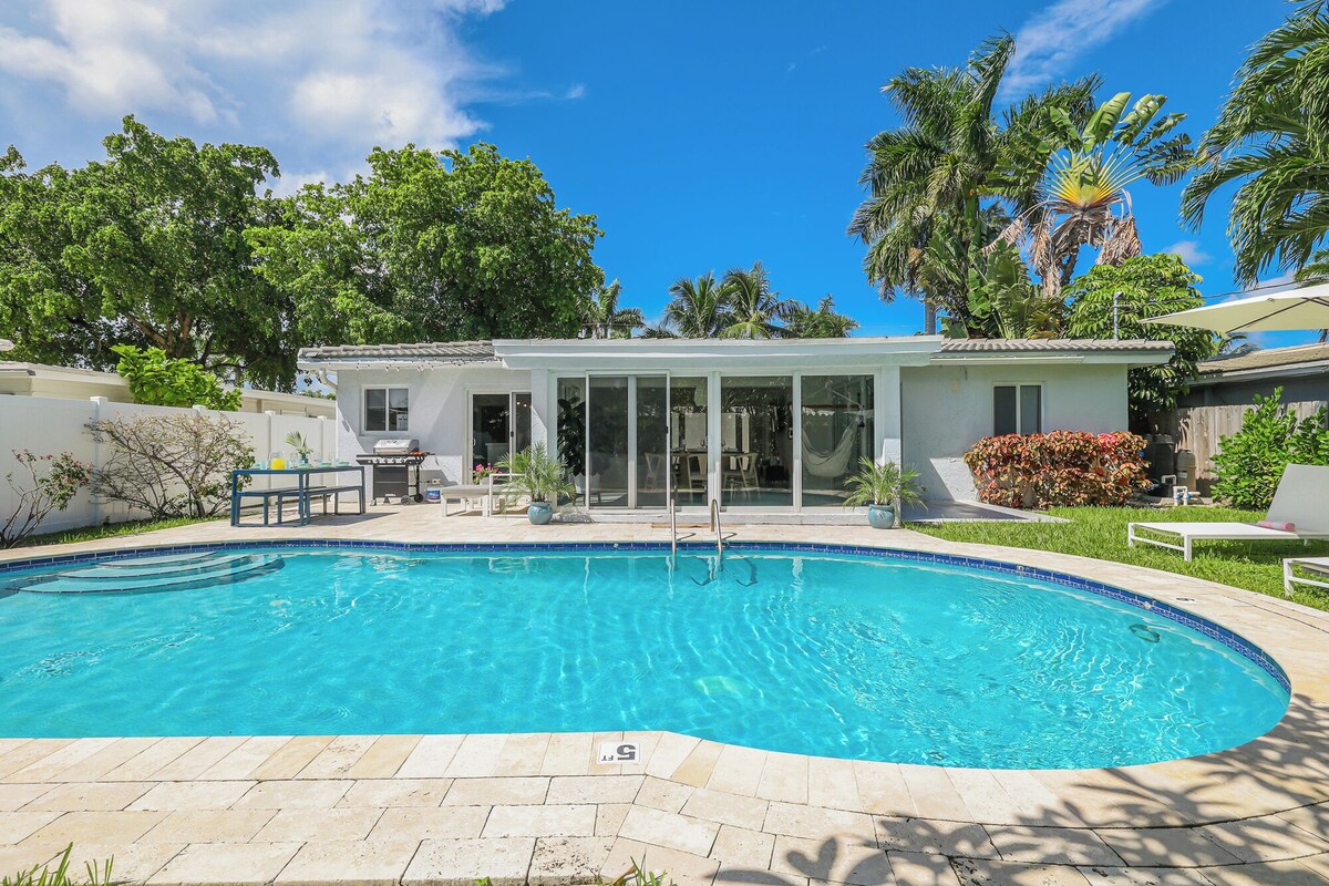 Welcome to your luxurious retreat in the heart of East Fort Lauderdale! With a heated pool, sleek design, and an unbeatable central location, this is the ultimate destination for your dream getaway. Nestled in the sought-after Poinsettia Heights neighborhood, you'll find yourself only 1.5 miles away from the sun-kissed beaches, 5 minutes by car to the Drive in Wilton Manors, 35 minutes to hard Rock stadium and easy access to I95 for quick getaways to Miami, Boca or Palm Beach. IG: @FLLuxeVilla ☞ Modern Elegance: Step into a world of modern elegance as you enter this recently renovated mid century home. The interior is thoughtfully designed with clean lines, chic furnishings, and a bright, open layout. Every corner reflects a commitment to style and comfort, creating a space where you can relax and rejuvenate and soak in the views of the free form pool from almost every vantage point. Open concept kitchen allows the traveler to cook a gourmet meal while entertaining guests both inside and outside the house. Primary bedroom allows access to the backyard Oasis either through the private bath with entry to the pool and yard or through the side sliding doors. The second bedroom features another king bed with luxury linens, pullout sofa bed and a full bath with shower just outside the door. The third bedroom features a beamed vaulted ceiling and separate AC unit to cool or heat this room alone. ☞ Heated Pool Paradise: Take a dip in your private, heated pool and experience true relaxation. Whether you're basking in the Florida sun or enjoying a refreshing swim in the evening, the pool area is a haven for tranquility. Lounge on the stylish deck on one of the chaise lounges provided, read a good book on the outdoor sofa or, sip a cool drink, and let the worries of the world melt away. Please note that the pool water temperature during winter months will be heated between 86-89 degrees. We strive to be a sustainable property, as a result we may not be able to accommodate any request to increase the temperature of the pool any further. ☞ Perfect Location: Situated in the desirable Poinsettia Heights neighborhood, this house offers the best of both worlds – a peaceful retreat blocks away from Whole Foods, Pura Vida, Sweetgreen, and a plethora of other stores and shops (Lululemon, Pottery Barn, Barnes and Noble, etc) and close proximity to Las Olas, The Drive, Lauderdale by the Sea, and so many other points of interest. Just 1.5 miles from the beach, you can easily bike, scooter and indulge in sun-soaked days and beachside adventures. Plus, with direct access to canals (one across the street), water enthusiasts can explore the beautiful waterways at their leisure including paddle boarding, kayaking or rowing. There are plenty of places just bocks away to rent a paddleboard or kayak and access the canals on your own. ☞ Central to Culinary Delights: Fort Lauderdale is renowned for its diverse culinary scene, and this house is ideally located near an array of restaurants and cafes. Whether you're in the mood for seafood, international cuisine, or a casual beachside bite, you'll find it all just a stone's throw away. ☞ Convenient Transportation: Exploring the city is a breeze from this central location. With convenient access to major roads and public transportation, you can effortlessly discover the vibrant culture, entertainment, and attractions that Fort Lauderdale has to offer. Have a bike? Bring it! Or rent one at one of the many local bike stores. You are an easy cycle ride away from grocery stores, restaurants, shopping and the beach. Catching an Uber is a breeze or if you decide to rent a car, there’s plenty of parking for up to three cars in your own driveway. ☞ Comfortable Accommodations: Retire to spacious and well-appointed bedrooms that ensure a restful night's sleep. The house is equipped with modern amenities to meet your every need, ensuring a seamless and enjoyable stay. Luxury linens and towels are provided. Just bring your toothbrush and suitcase. Don't miss the opportunity to experience the epitome of luxury living in Fort Lauderdale. Book your stay at this modern, stylish house with a heated pool, and make your vacation unforgettable! SECURITY CAMERAS: We have 24/7 video/audio security cameras on the exterior of the property and in the garage. These are security cameras focused on the entryways and designed to maintain your privacy while enjoying our home. GUESTS: Only the guests on the confirmed VRBO reservation are allowed on the property / in the cabin. Extra guests must be approved by the owners in advance of the reservation and are subject to additional fees. MAINTENANCE SERVICES: We do have weekly pool maintenance service scheduled on every Friday (subject to change) during which the pool servicing company accesses the pool area from the side door and runs the usual maintenance which runs about 15 mins. In addition to this we also have a biweekly yard maintenance service scheduled on Tuesdays (subject to change) which will access the front and back yard for lawn mowing and cleaning up leaves. We appreciate your understanding and collaboration. If additional services are needed the host will contact the guest to coordinate the timing. PETS: An additional fee of $150 will be applied to your reservation. We gladly welcome one well-behaved dog with prior approval before your booking. We kindly request that the dog is not left unattended in the premises for prolonged durations, is to be kept off furniture and beds, and that you provide your own dog bedding while ensuring responsible waste cleanup outdoors CLEANING FEE: The cleaning fee encompasses standard turnover cleaning tasks, such as changing bedding and laundering linens, cleaning surfaces and floors, and managing snow removal, among others. Please be advised that additional cleaning charges may apply in cases of substantial untidiness, such as excessive dishware or the presence of pet hair on furniture and bed