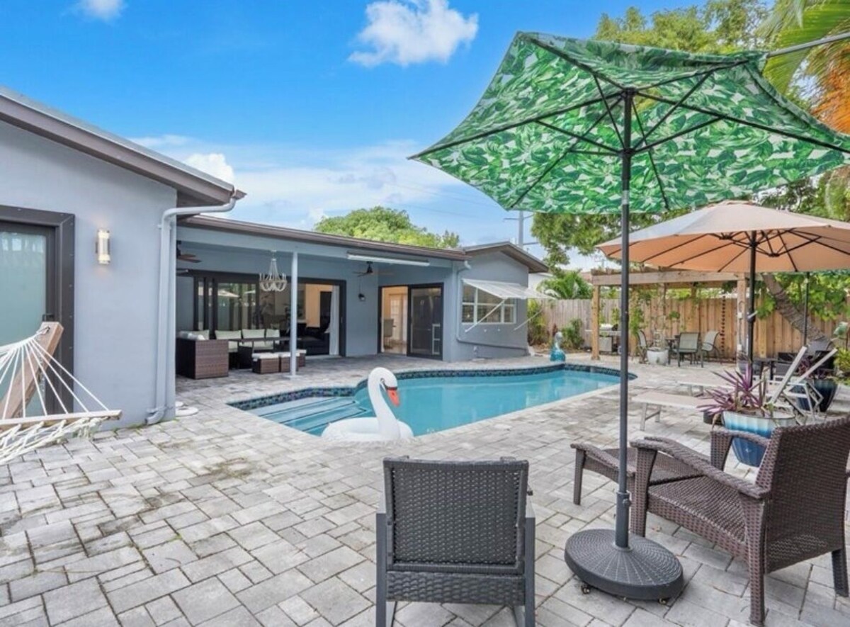 Welcome to your tropical Oasis! This stunning 4-bedroom, 2-bath home features a large private pool and outdoor shower, seamless indoor-outdoor living, and is just 8 minutes from the beach and Lauderdale-by-the-Sea. Relax in spacious, stylish bedrooms, cook in a fully equipped kitchen, and enjoy the lush outdoor space with a grill and shaded seating. Perfectly located near vibrant dining, shopping, and attractions, this home offers the ultimate blend of comfort, luxury, and convenience. Book your stay today! NOTE: Pool heating is $50/day extra Our prices include all fees. No hidden fees.