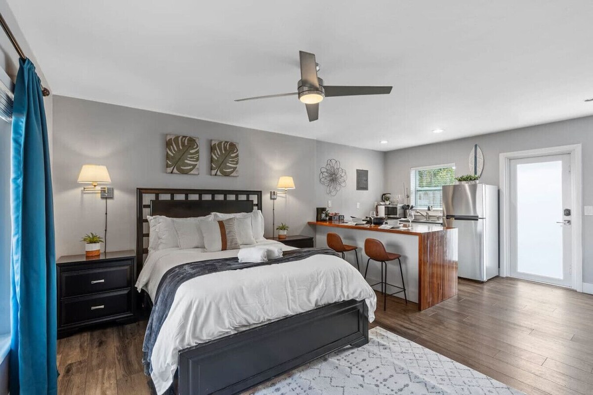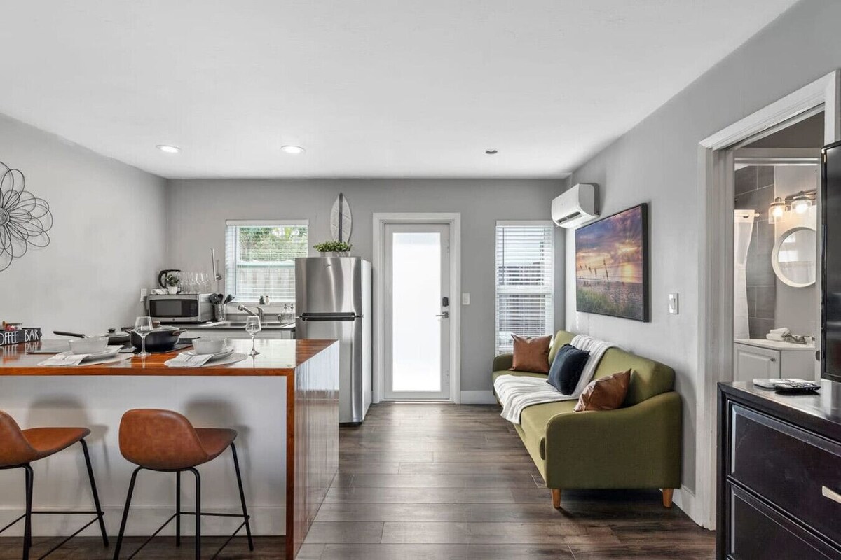 LOCATION: This studio makes the perfect home base for 1-2 people who want to explore all Ft. Lauderdale has to offer. This fantastic location is only 10 min to the beach, 5 min to Las Olas Blvd and 10 mins from the nearest airport. BEDROOM: This unit sleeps 2 guests in 1 bed. Smart TV is located in the unit. See bed count below: - Bedroom 1: 1 Queen (Sleeps 2) * Additional beds cannot be provided* BATHROOM: The bathroom is stocked with toiletries (shampoo, conditioner, and body soap), plush towels and a hairdryer. KITCHEN & DINING: The kitchen is fully stocked and has a full line of new appliances (drip coffee maker included). OUTDOOR SPACE: The outdoor space includes a BBQ grill (at no extra cost to you) and outdoor seating that is SHARED with the other units. PARKING: Maximum of cars that can park in the driveway is 1. WHAT'S INCLUDED: Iron and ironing board, washer/dryer (SHARED), 1 pack-n-play crib (Upon request ONLY), free high speed WiFi and a Smart TV for your streaming apps like Netflix and YouTube TV. NOTE: For guest and property protection, A/V surveillance is present at the front of the property (outside pointing to the driveway and grass area) and back yard (Outside surveying the entire backyard). No surveillance is located inside the home. This is a pet friendly property; a $50 pet fee is required per pet. Mailing packages to this property is not permitted, we are not responsible for any mail/packages. Please note - all door codes & information will be sent 24 hours prior to check-in . Check your message inbox in the booking site message forum . Guests have access to the entire home and backyard. Well established, quiet, family friendly neighborhood. **Please note: This home is in a family friendly and quiet community. We have close relationship with neighbors and as such, quiet hours between 9pm - 8am must be observed outside and at the stock tank pool area. Uber/Lyft are readily available in this area. Nearby attractions 🏖️ Fort Lauderdale Beach 🎰 Galleria Mall ✈️ FTL Airport ☀️ Holiday Park 🕺🏻 The Wharf 🏛 Broward Center for the Performing Arts *Home is not childproofed. Please supervise children at all times. *No daily cleaning services. *All TVs are smart TVs for online streaming. No Cable. *We may have scheduled maintenance workers e.g. lawn care, pool maintenance, repair work that may need access to home or yard. We will notify you beforehand of scheduled services. Guest Expectations Before you embark on a much-deserved vacation, we wanted to highlight a few things that are expected of guests, and what you can expect from Tilah Stays: What can you expect from us? 1. Enjoy a clean, tastefully decorated home that looks just like the pictures. 2. No running out to the store late at night--this is a fully equipped property that anticipates your needs. If we're missing something essential, please let us know and we'll take care of it! 3. We're a genuine, responsive, no-nonsense team that understands and genuinely cares about our guests. We are physically on call from 8AM-8PM 7 days a week. We maintain all our appliances regularly, but we still can't predict when a microwave is going to stop working suddenly, just give us a call and we'll be there as soon as we can. 4. We are here to help make this an amazing EXPERIENCE! Please ask about car rentals, Birthday Set-ups, Bachelor/Bachelorette decorations and more! What is expected of you? 1. Respect the neighborhood. Our homes and properties are located in residential areas, and your neighbors are likely not on vacation. We ask that the noise be kept to a minimum whether indoors or at the outside public areas of the property. Quiet hours are strictly enforced from 9PM - 8AM 2. Treat the home as if it were your own--leave it in good condition. We understand that accidents happen but we ask that you tell us so we can replace items in time for the next guest. 3. Check-in/out at the agreed times. We operate a business on a tight schedule, and a new guest just like yourself is often arriving the same day you depart. Lawn maintenance are also on a set schedule and are needed to keep the property in great condition. These services cannot be rescheduled. Our prices include all fees. No hidden fees.