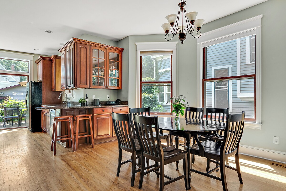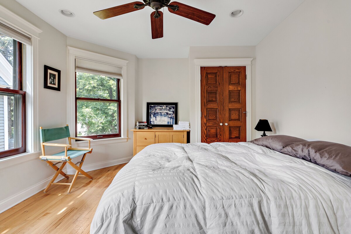 Stay in the Heart of Uptown, two miles from downtown Mpls and steps from Lake of the Isles. Enjoy the home's refinished wood floors, high ceilings, and floor-to-ceiling windows that fill rooms with natural light. The main level's open floor plan connects the kitchen, dining, living, and den areas. Amenities include a front porch, a furnished deck with a grill, and a fully equipped kitchen. The second level features three bedrooms and an atrium with an open staircase to the loft. The third-level lofted bedroom has a king bed, balcony, and a private bathroom. Relax in the lower-level entertainment room. Enjoy dinner on the deck, or walk to Lake of the Isles, Lake Bde Ma Ska, restaurants, theaters, bowling alleys, galleries, or a sculpture garden. The spacious layout and convenient location of the pet-friendly home is perfect for families and friends with pets, blending comfort and convenience for your stay in Minneapolis. Our prices include all fees. No hidden fees.