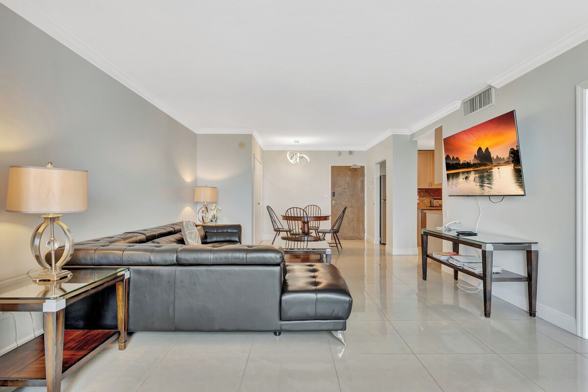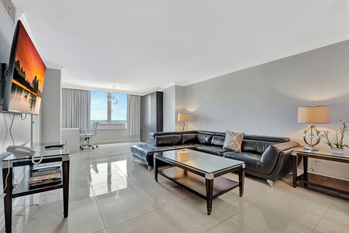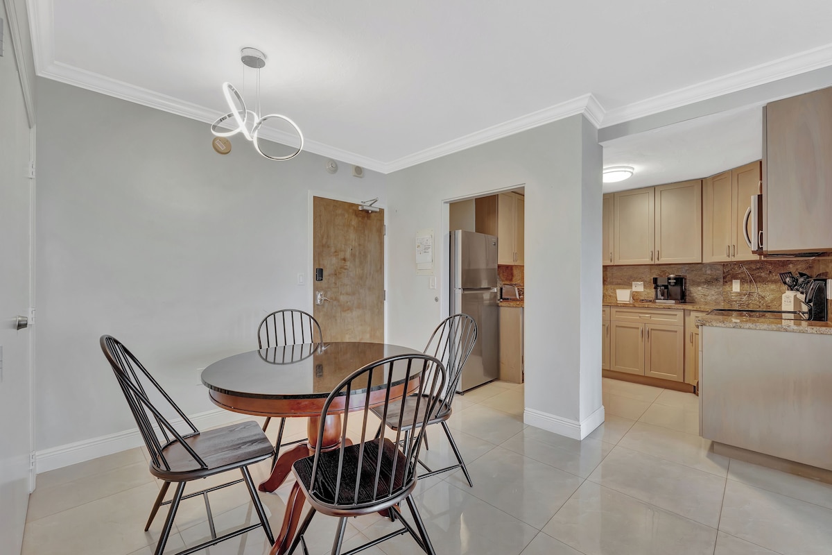 The property is directly on the ocean (no streets to cross). The room is very spacious and has a king bed and a Murphy bed. The bedroom is separate from the other rooms. There is a full living room, kitchen (fully stocked), dining room, and bathrooms. The room is located on the 7th floor. You can start your mornings with a fresh cup of coffee at our lobby coffee shop. We also have Florida's favorite tiki bar directly on the beach, and an authentic Italian restaurant with all food to order Our prices include all fees. No hidden fees.