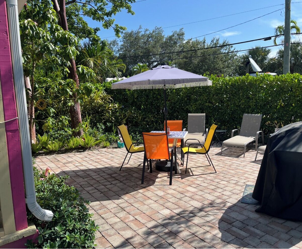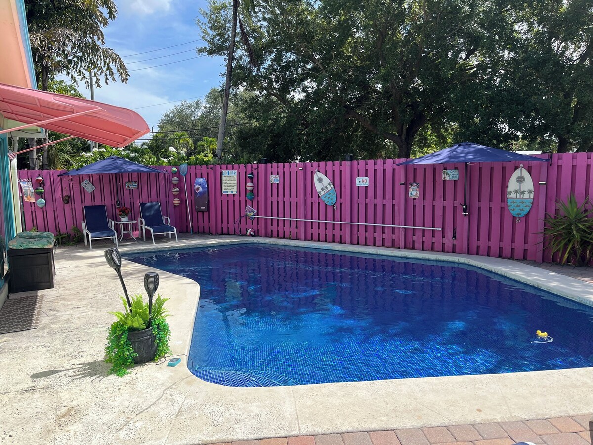 Located less than three miles to the beach, 2.5 miles to Wilton Manors. And less than two miles to Las Olas Blvd. and the vibrant downtown Fort Lauderdale area with wonderful shopping, dining, and entertainment districts. The Key West Flamingo house offers a non-pull-out sofa for one and a roll away bed for one if you wish to add two extra people. Each at an additional $15.00 charge. There is a flat screen in each bedroom and one in the living room. This quaint house sits on a property with another full house the Hawaiian a 3/2 and two other tropical bungalows. Each a 1/1. We have a shared swimming pool for all. Two outdoor dining areas with gas grills. Plenty of green tropical space for relaxing or playing a game of croquet, bean bag toss aka corn hole, And dart rings. And whatever else we can come up with. Laundry, free internet, and assigned parking available. Beginning the middle part of November, through the first part of January the entire property will be decorated for Christmas. Some with indoor Christmas trees, all with festive decorations. And outdoors will be a mini Christmas Wonderland..
