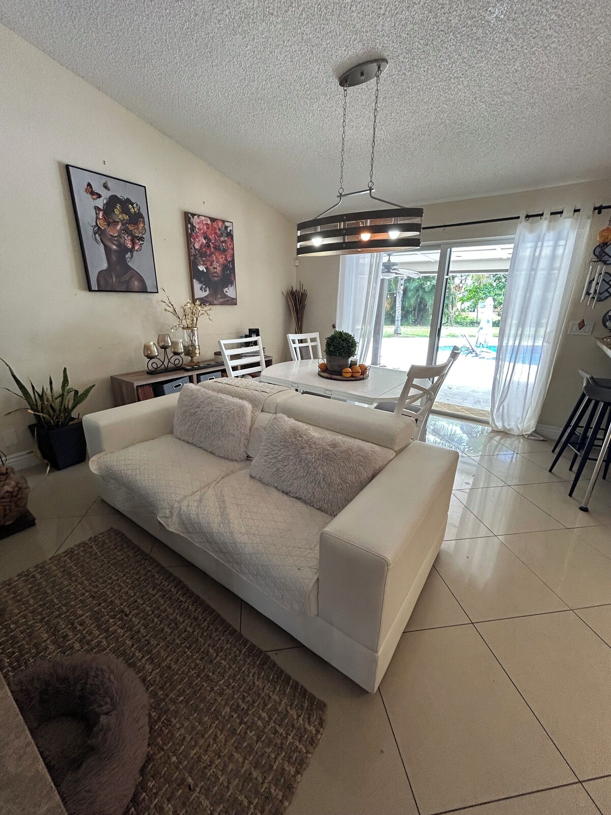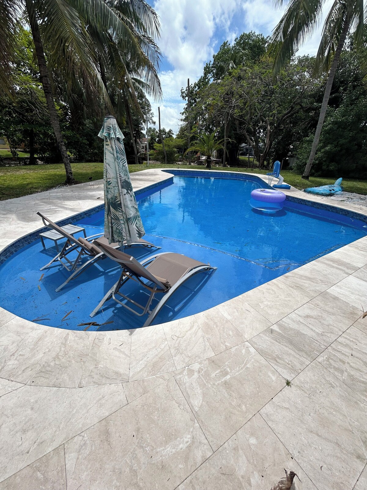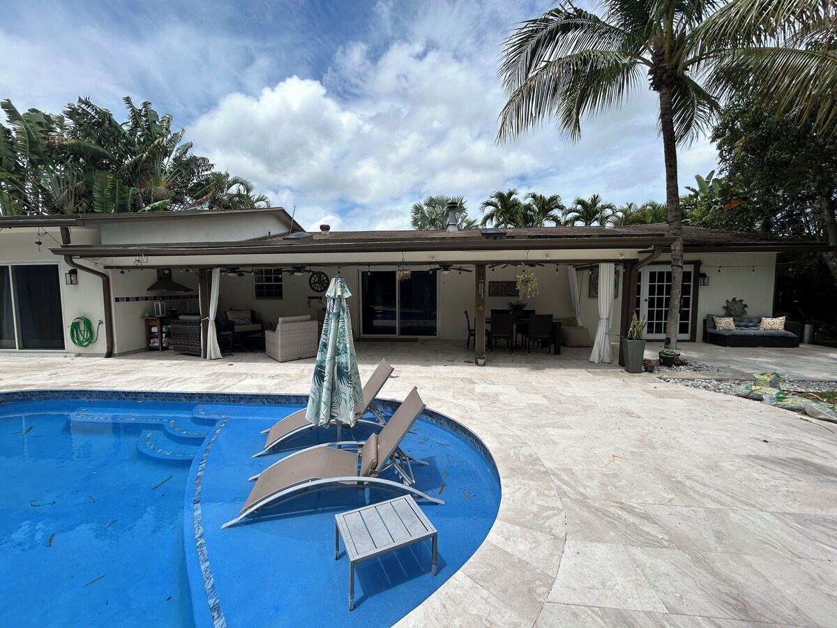 Lovely pool home with fishing dock in highly diserable family community of Fort Lauderdale. As you enter you will see the living areas x 2 to cozy up and watch movies or play on its large 55 inch TV with viewing for over 100 channels. As you walk forward you will be greeted by the dining table and sitting for 6 to your right, then large living room with plenty of seating and Electric fireplace, next to the updated gourmet kitchen with all updated appliances. you'll find all the necessary tools for a family dinner. Kitchen features a coffee maker, flat top range with oven, updated refrigerator with ice maker, filtered water unit on sink, and new whirlpool washer dryer inside kitchen closet. Past the double doors , you may go outside and enjoy the serene backyard with lush palm trees and beautiful pool area. You may lounge or grill your favorite steak. You You can be a sport and go kayaking in either a double inflatable kayak or fish on the dock. Coming back into the home you will find 4 bedrooms to the left of the house. Main with king bed , 2 with queen beds and one with a twin bed. There's a large master ensuite bathroom with spa/ jets. There is an inflatable queen bed for sleeping for up to 9. This home is full of amenities for everyone- you will definitely get a taste of Florida tropical living in this paradise. Please note there is an attached studio - separate entrance from home and guest there does not use any amenities. There is a very small dog (5 lbs)- He’s friendly and well-behaved. He’s mostly kept indoors and does not interact with guests unless seen briefly around the yard. He’s also surprisingly helpful; he keeps ducks and iguanas away from the pool, deck and garden!” Our prices include all fees. No hidden fees.