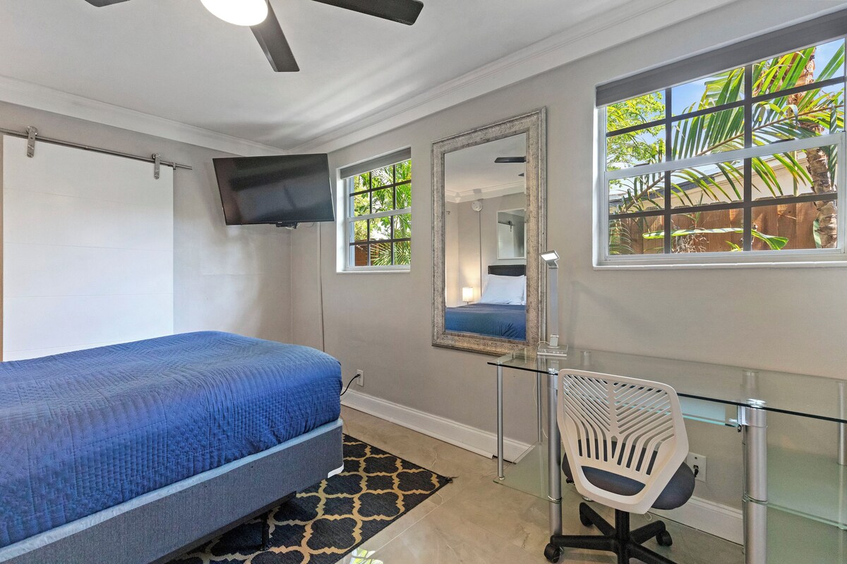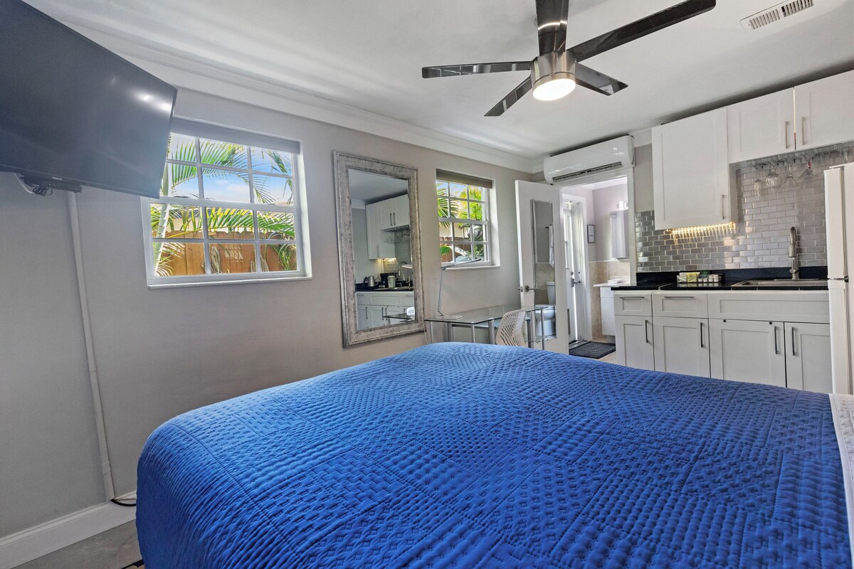 The studio apartment is located walking distance to Wilton Manors in a friendly and safe suburban neighborhood. It consistently receives 5 star reviews for being so quiet, clean. It has been recently renovated and offers a private bath, and everything you need for a healthy, safe and rejuvenating short term stay. As you enter the gated backyard you're immediately immersed in privacy surrounded by tropical landscaping featuring orchids, jasmin, banana, and coconut trees. Your apartment is just down the landscaped sidewalk. Keep walking and you come upon the pool and a slice of utopia. Looking to escape the screaming kids at the noisy and crowded hotel pool deck? There is only one apartment on the property, so you'll never have to share with other guests. (Note: the backyard and pool are shared with the main house where I live along with my 2 dogs, but when guests are enjoying the pool, I respect the need for privacy and make every effort to avoid those areas till the coast is clear). While I'm usually avail if you have questions or needs, it's not uncommon for guests to only see me at check in. The apt is bright and open with great energy and a minimalistic, uncluttered design. There's a queen size bed with a firm mattress topped with 3 inches of memory foam, crisp bed linens, new Fire smart LCD TV with HDMI access and ultra high speed fiber optic wifi and ethernet access. Guests enjoy a Kitchen with granite counter tops, stainless steel backsplash, full size fridge, microwave, toaster oven, and a two burner glass cooktop. All glasses, plates, and cookware are provided. You can conduct business on the glass desk with office chair. The unit has a new, ultra quiet ductless mini split A/C. All soaps, shampoo, toilet tissue, dish soap/sponges are provided for your convenience. Guests have full access to a solar heated salt water pool. Also available is a stainless steel gas grill, outdoor table and umbrella/chairs, plus 3 chaise lounge chairs for sun worshipers. Guests always have access to additional clean towels and fresh bed linens. Need to do personal laundry? You'll love the new Samsung front loading washer and dryer. Detergent and dryer sheets are included for $5 per wash/dry cycle. We are located an easy 10 minute walk to Wilton Manors, and approximately 2.5 miles from Fort Lauderdale Beach, the Galleria Mall and the Las Olas shopping district. Don't hesitate to make special requests. Special occasions like birthdays or anniversaries are very important. For a small fee, decorations (flowers/balloons, specialty cakes, etc.) can be waiting in the apartment for your arrival. All people are welcome here regardless of race, sex, sexual orientation, skin color, religion, national origin, political affiliation, or age. (Yes... even our Republican friends are welcome! ;-) In fact, we celebrate diversity. All are respected. All are treated with kindness and dignity. Please note: This is a safe neighborhood, and while there are no security cameras inside the apartment, the outside areas are monitored for additional security. There is no smoking tobacco inside the apartment, but we realize the benefits of certain medicinal herbs, which can be enjoyed in the unit when a window is cracked open. Parking in the driveway is free and plentiful. Our prices include all fees. No hidden fees.
